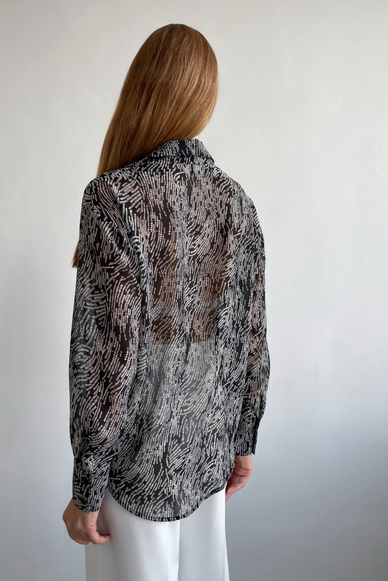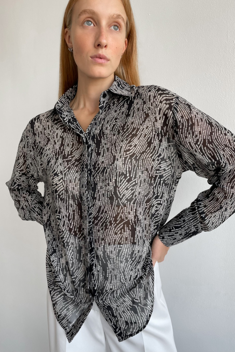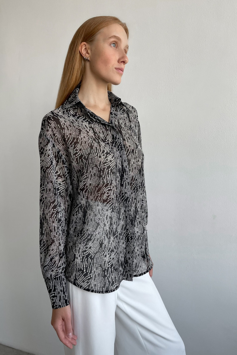 Рубашка "оверсайз" из блузочной ткани со спущенной линией плеча, длинным рукавом с широким манжетом, с застёжкой на пуговицы. Воротник рубашечный. Застёжка супатная с пуговицами.
