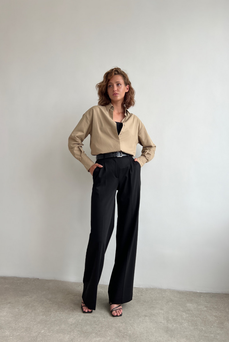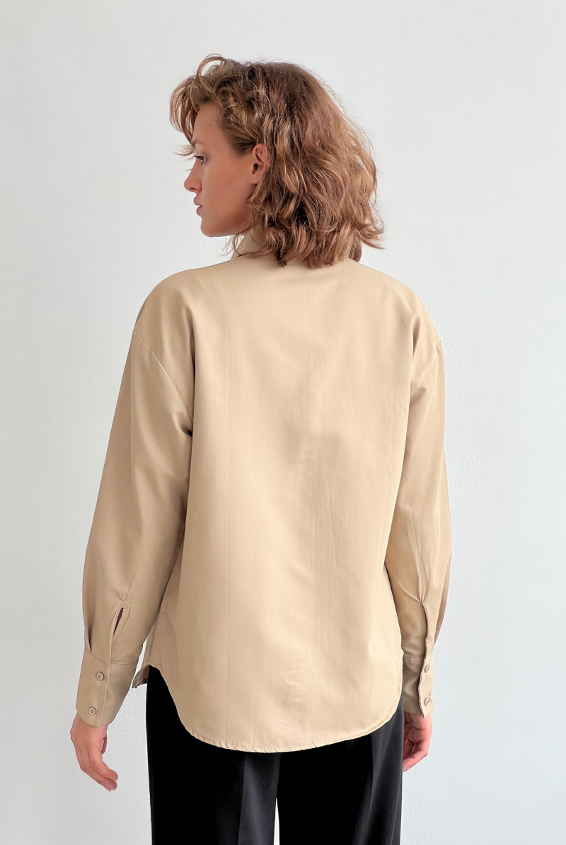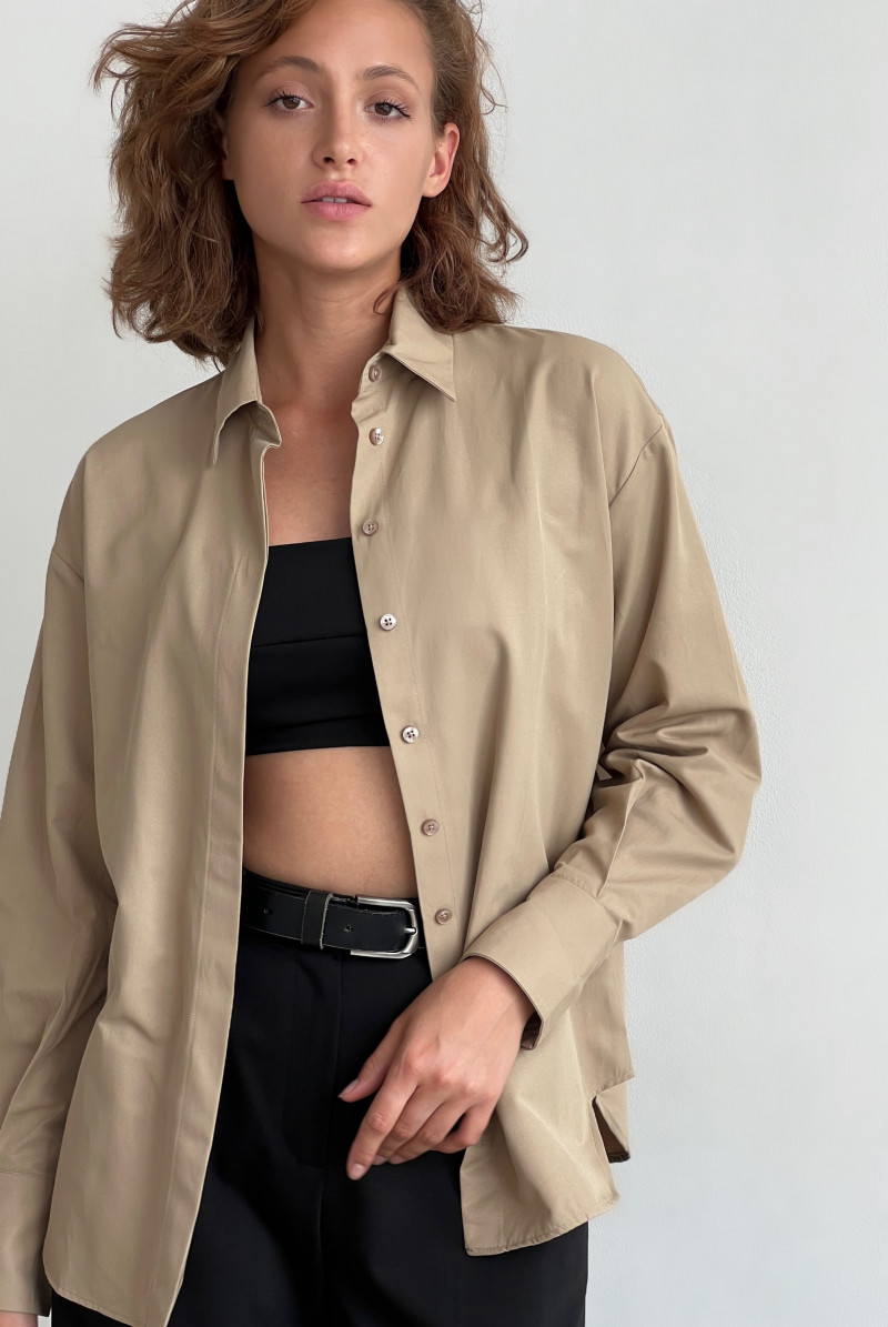 Рубашка "оверсайз" со спущенной линией плеча, длинным рукавом с широким манжетом, с застёжкой на пуговицы. Воротник рубашечный. Застёжка супатная с пуговицами.