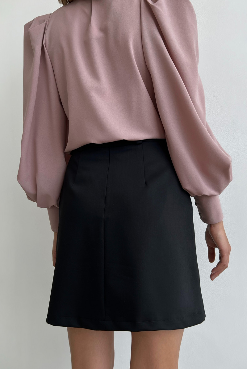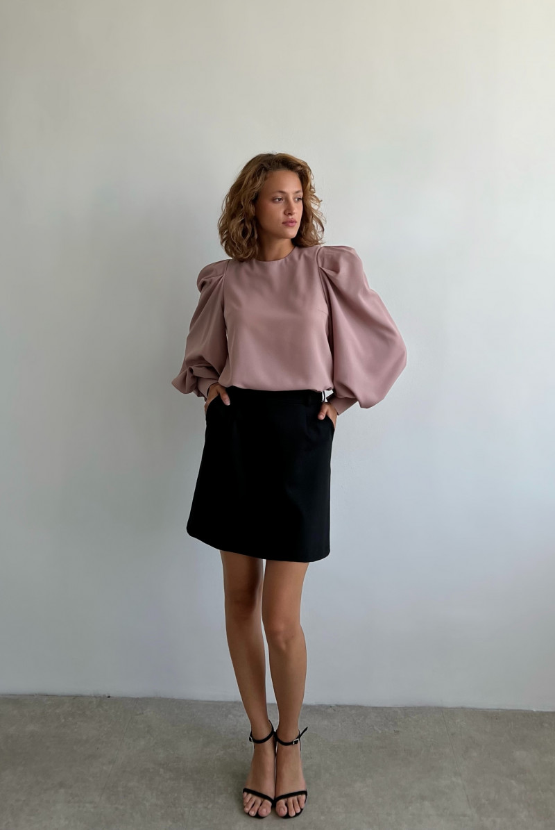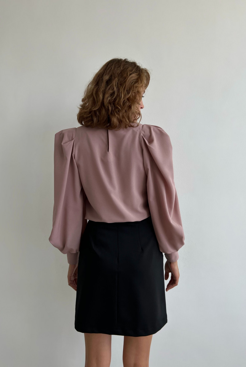 Блуза прямого кроя с рукавами на широком манжете. Вырез горловины круглый, сзади "капелька" застежка на навесную петлю и пуговку. Рукав по (окату) вверху со складками, по низу рукава складка и сборка. Для четкого оформления плечевого пояса вшиваются "гребешки" из основной ткани и плечевые накладки. Застежка манжета на 3 пуговки.