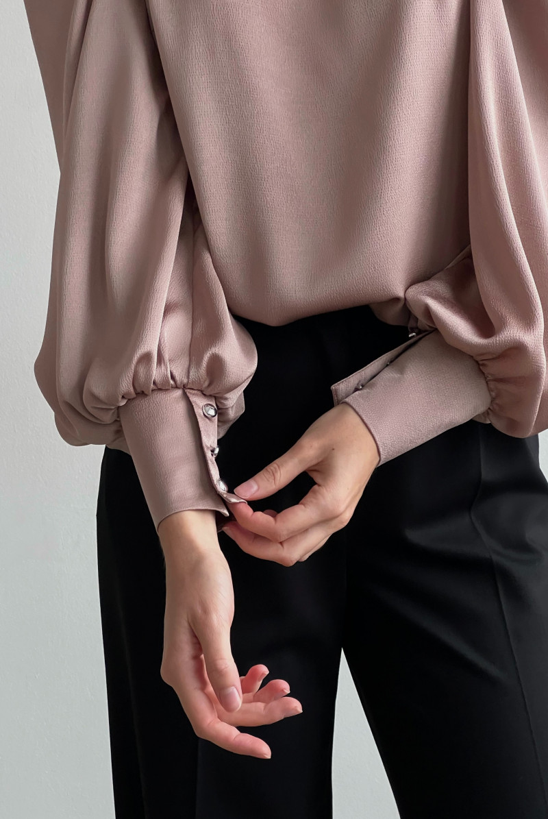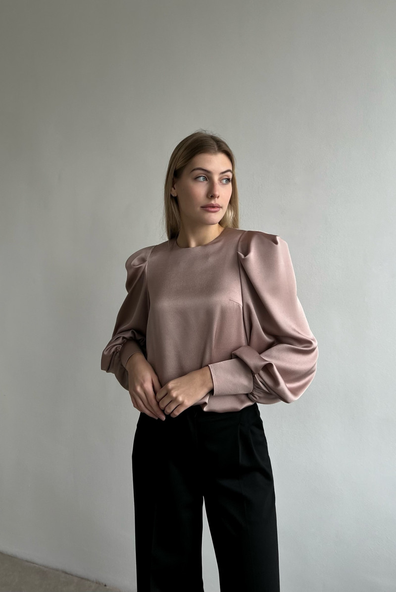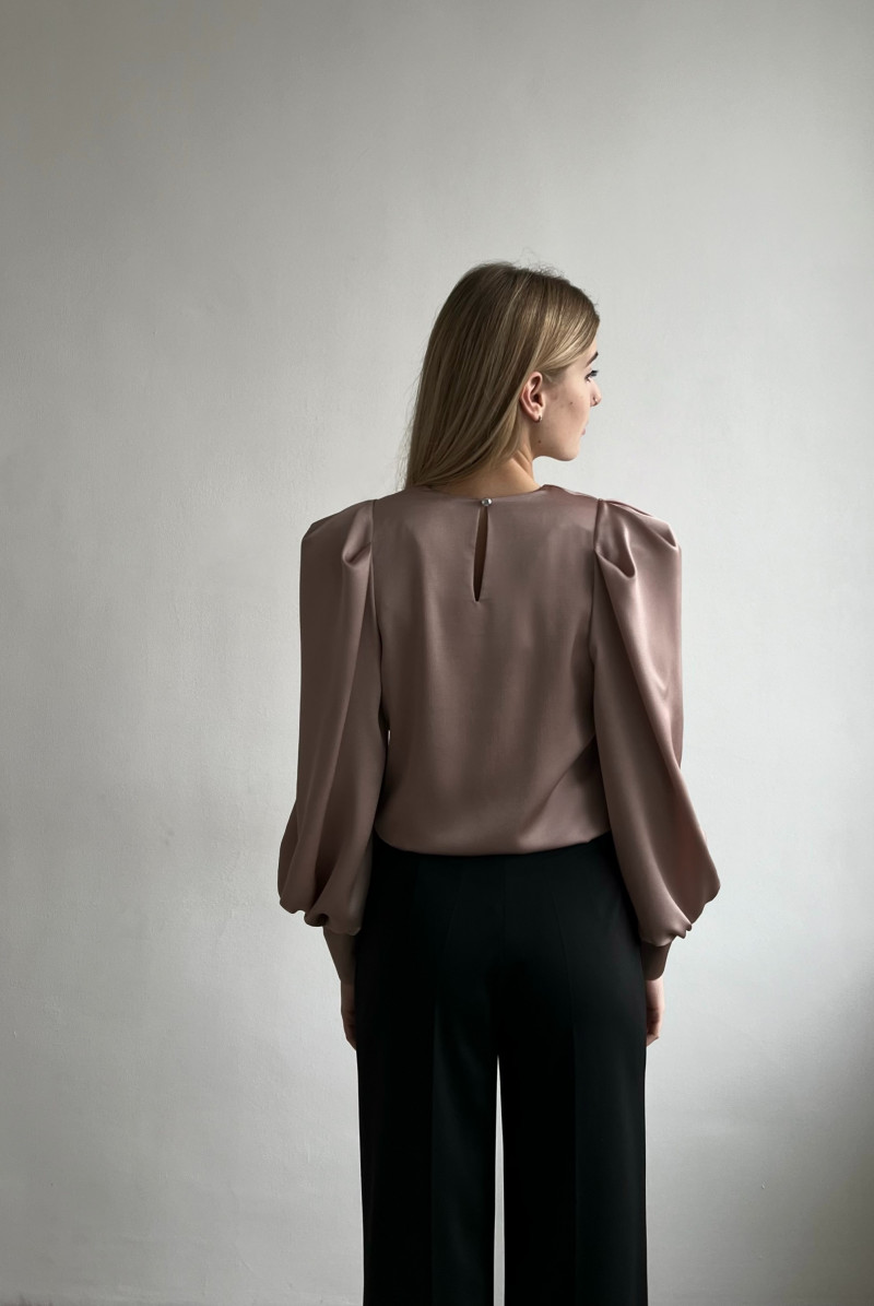 Блуза прямого кроя с рукавами на широком манжете. Вырез горловины круглый, сзади "капелька" застежка на навесную петлю и пуговку. Рукав по (окату) вверху со складками, по низу рукава складка и сборка. Для четкого оформления плечевого пояса вшиваются "гребешки" из основной ткани и плечевые накладки. Застежка манжета на 3 пуговки.