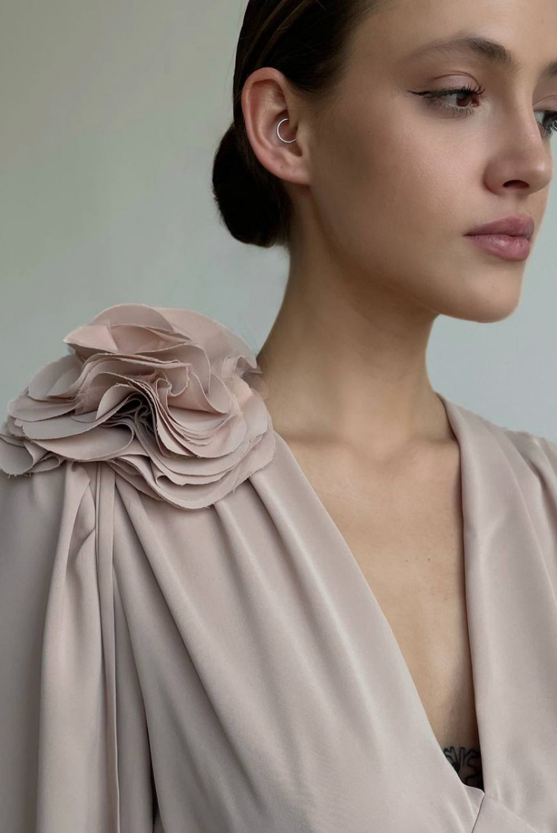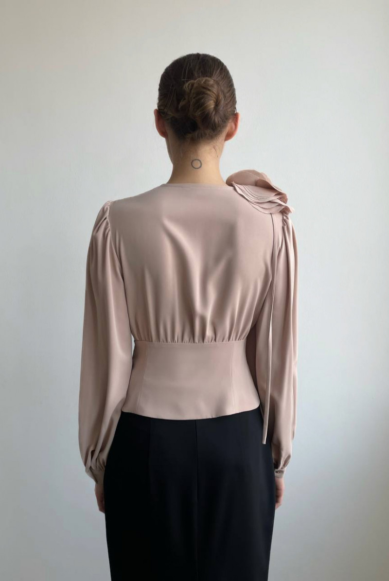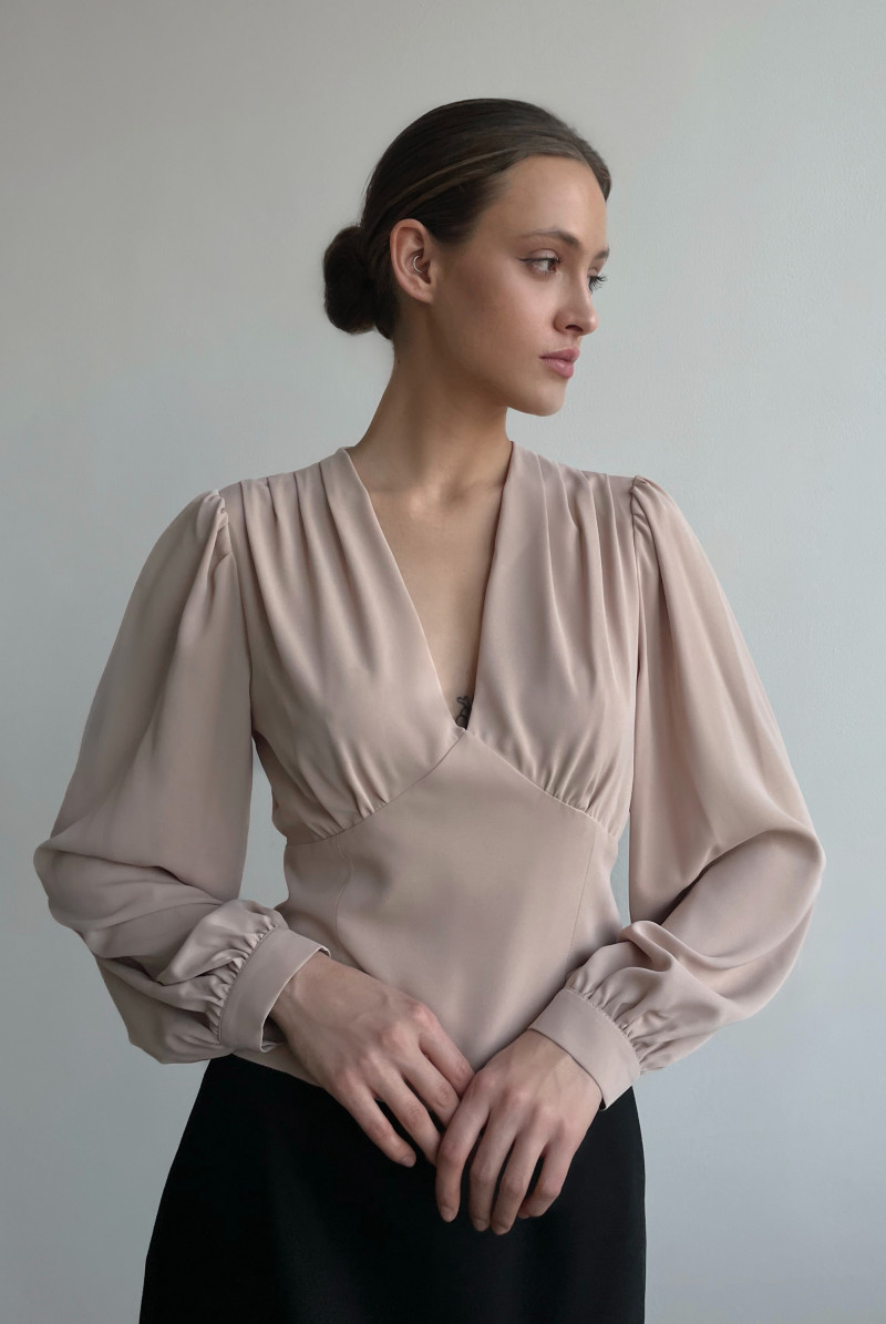 Приталенная блуза с глубоким V-образным вырезом горловины. Рукава объемные длинные с манжетами. В левом боковом шве блузы - потайная застежка-молния.