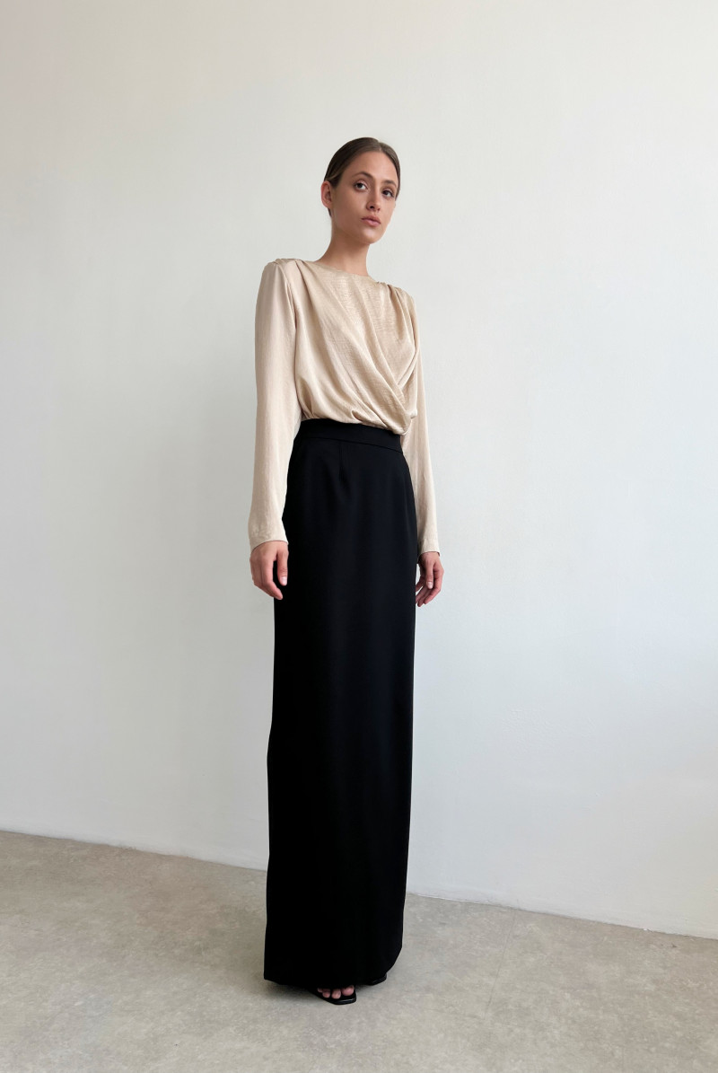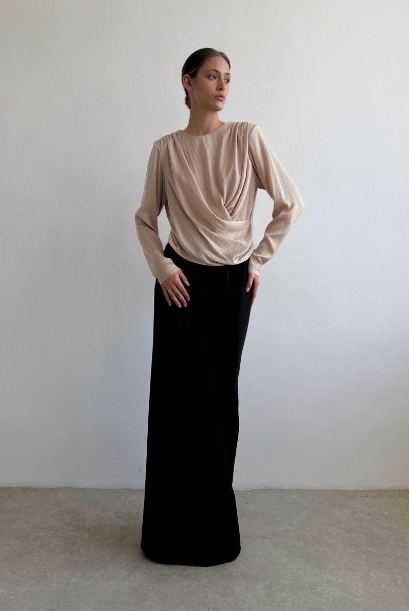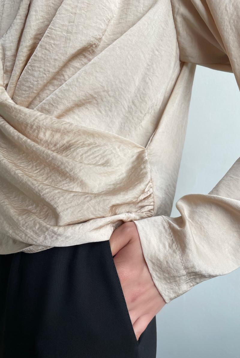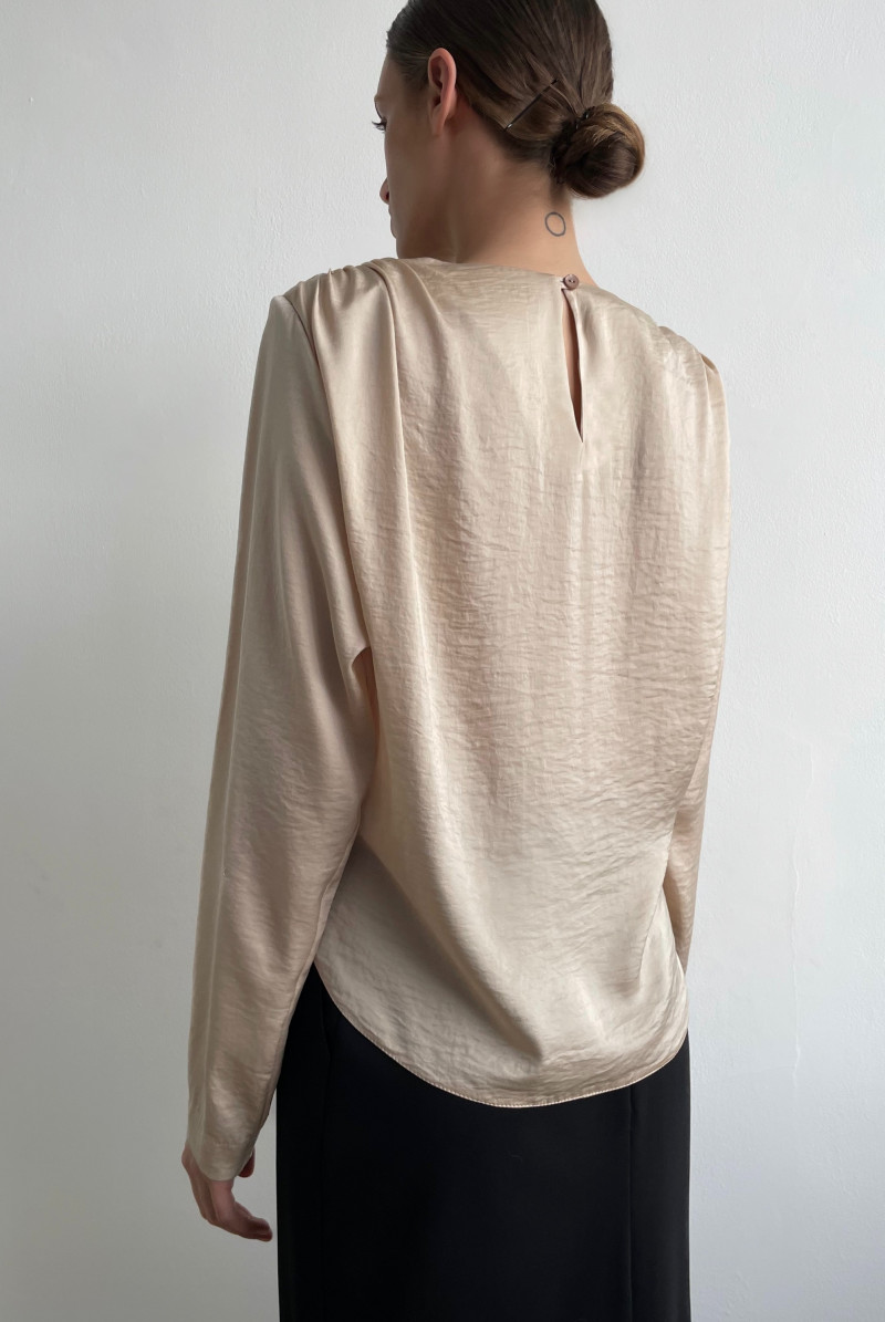 Блуза из плотной блузочной ткани прямого силуэта с длинным рукавом. По плечевым швам спинки выполнена сборка, переходящая в имитацию "запаха" по переду. Вырез горловины круглый с застёжкой на пуговку на спинке. Линия низа блузы ассиметричная.
