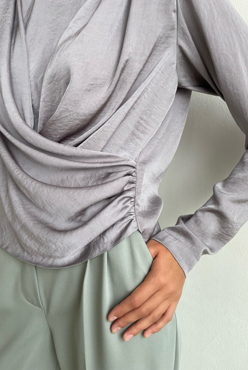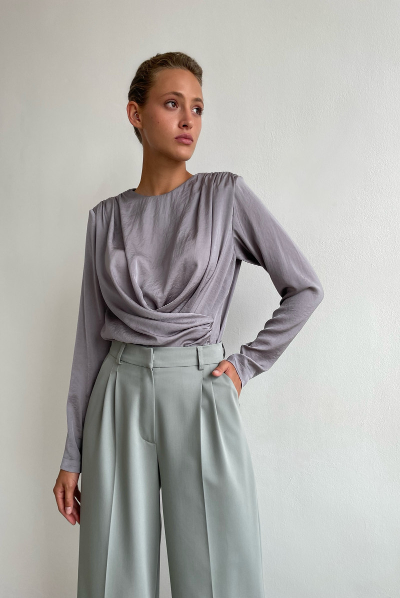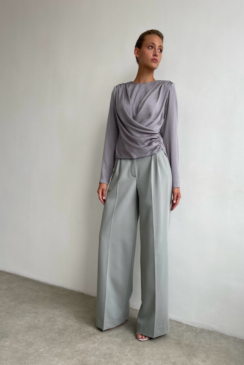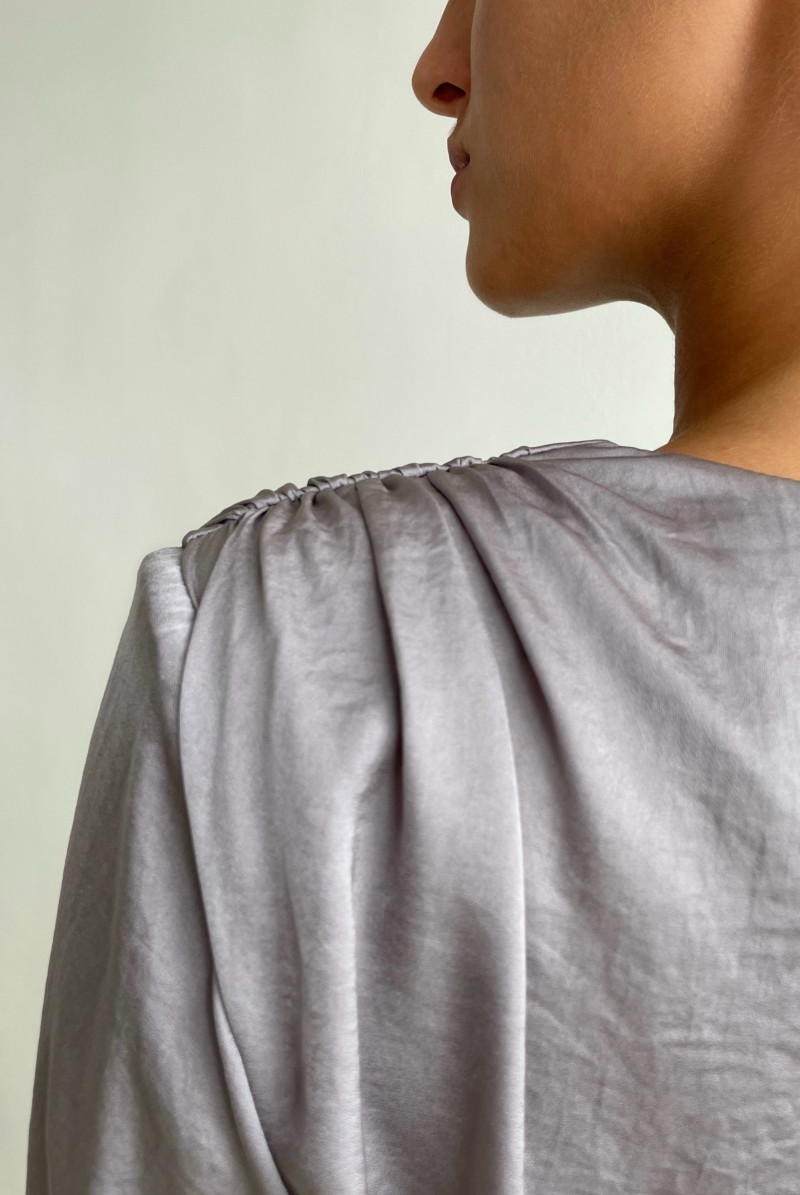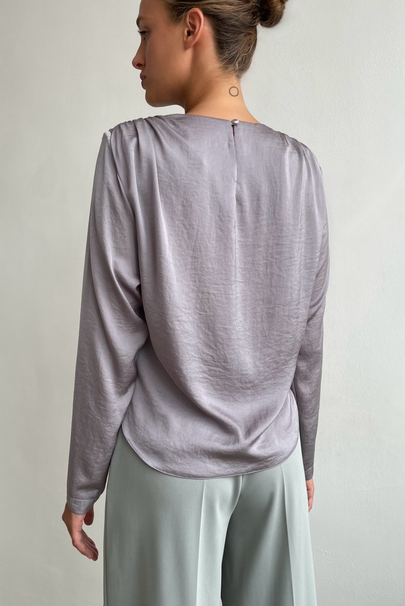 Блуза из плотной блузочной ткани прямого силуэта с длинным рукавом. По плечевым швам спинки выполнена сборка, переходящая в имитацию "запаха" по переду. Вырез горловины круглый с застёжкой на пуговку на спинке. Линия низа блузы ассиметричная.