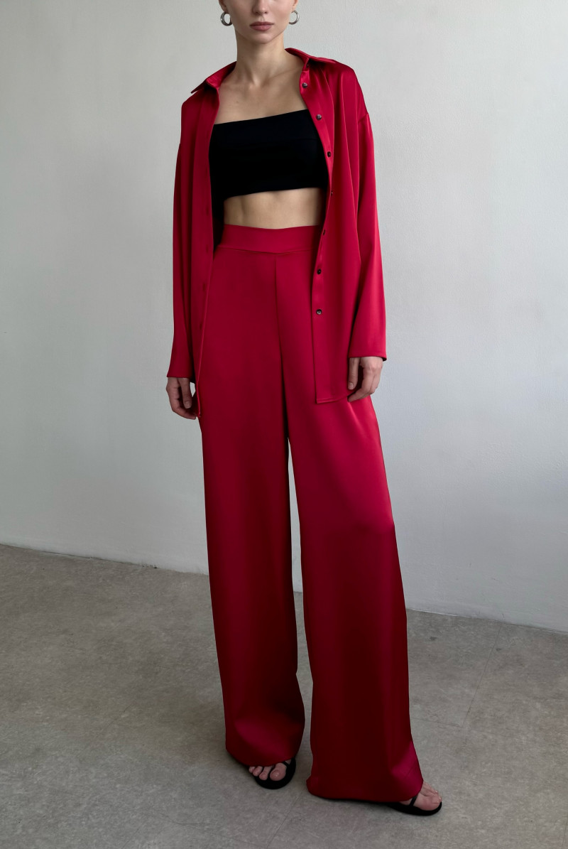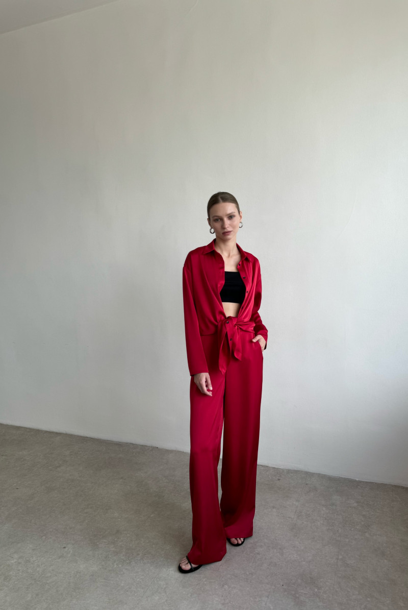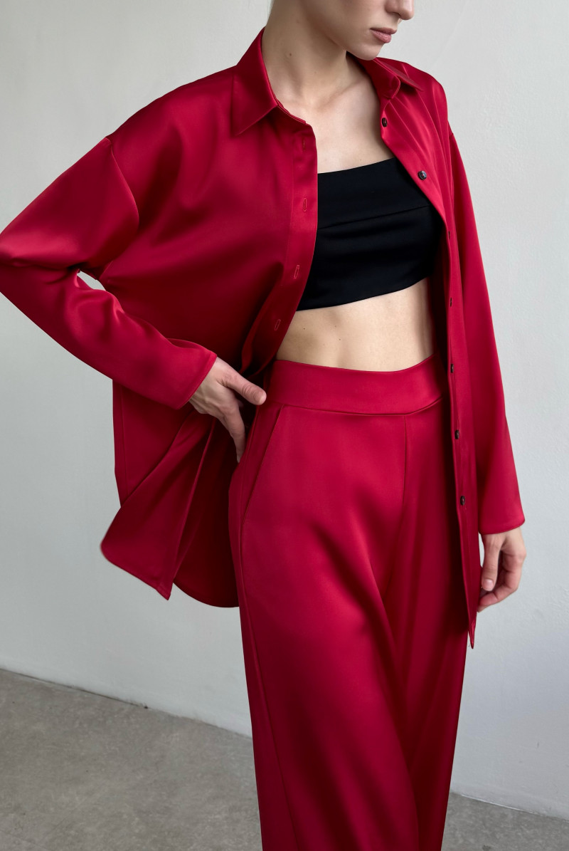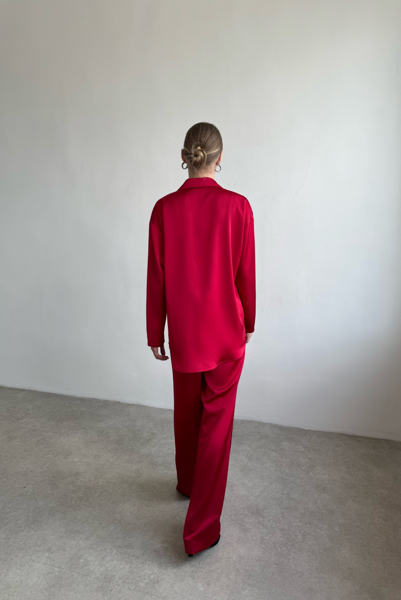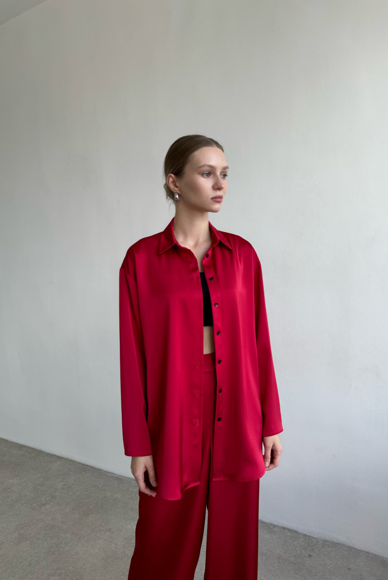 Свободная рубашка с длинным рукавом, фигурная линия низа, спущенная линия плеча. Воротник рубашечный на стойке. Застежка на пуговицы спереди.