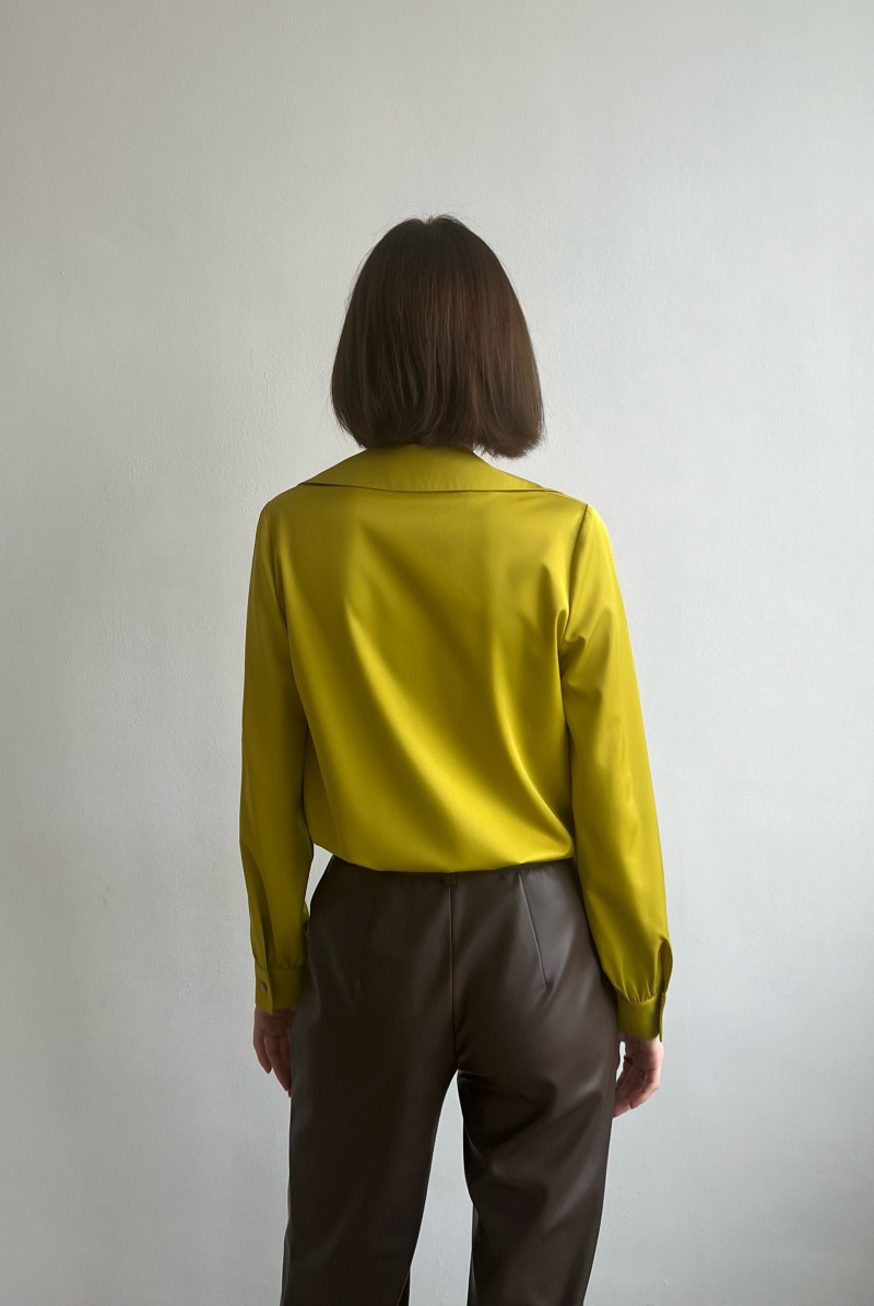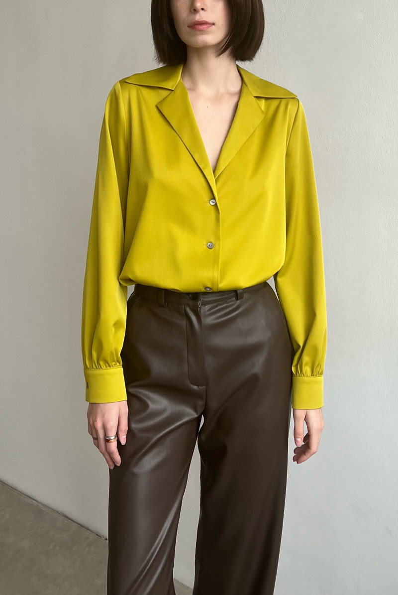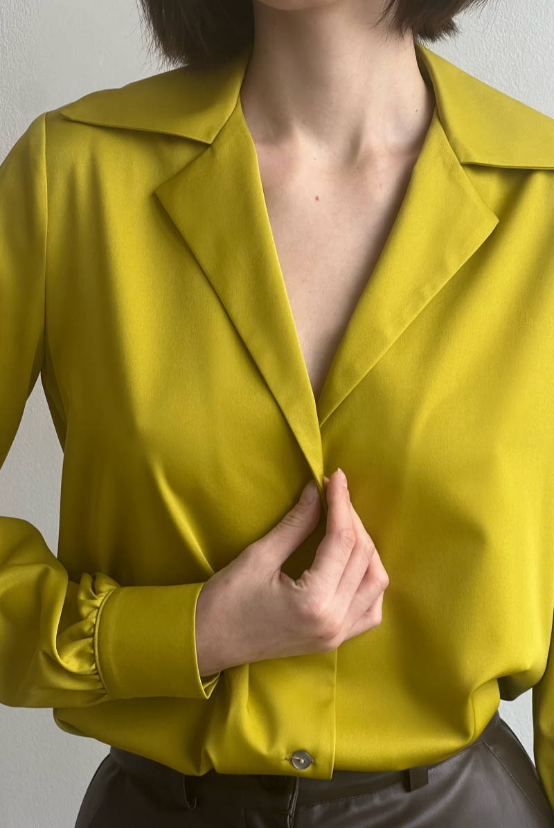 Блуза женская с отложным воротничком, с длинными рукавами на манжетах. С застежкой на пуговицы спереди. Прямого силуэта.