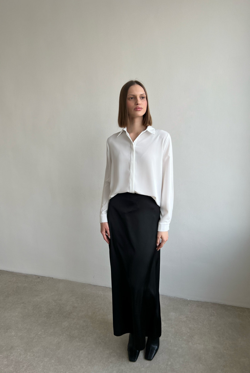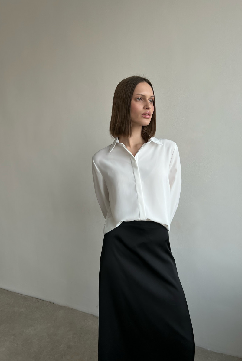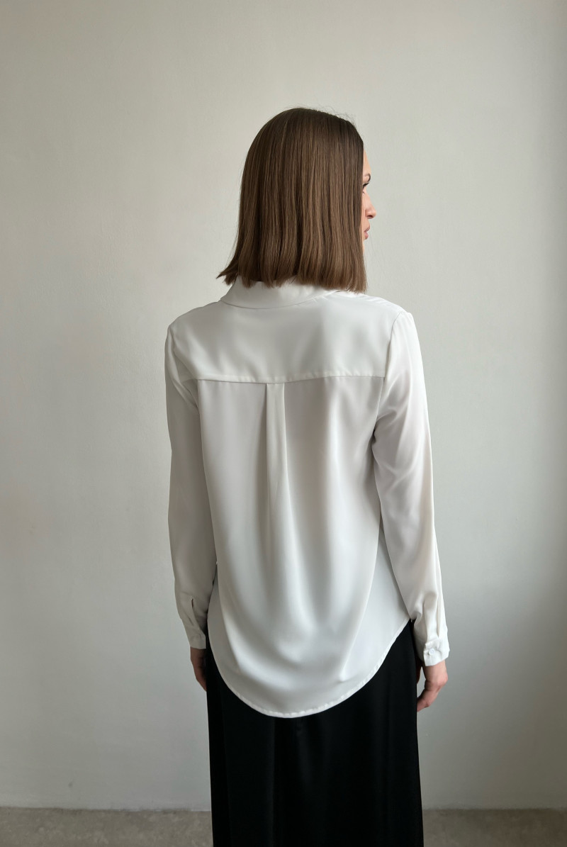 Блуза-рубашка из блузочной ткани полуприлегающего силуэта, с рубашечным воротником, длинными рукавами на манжете с пуговицей, с супатной застежкой на пуговицы спереди, фигурный низ.
