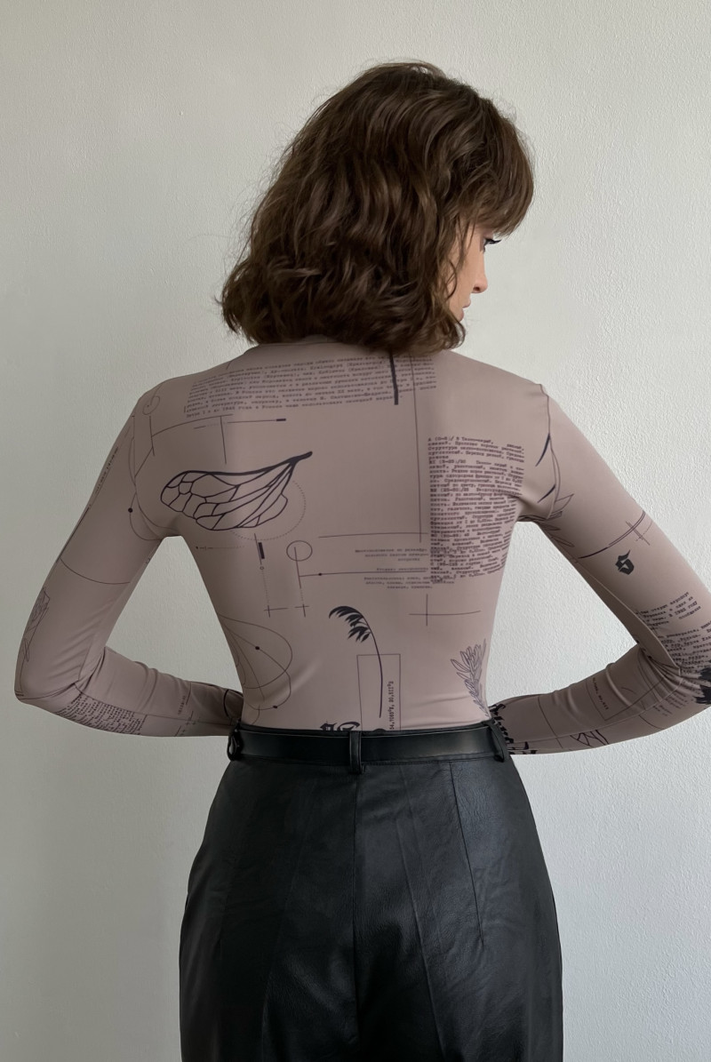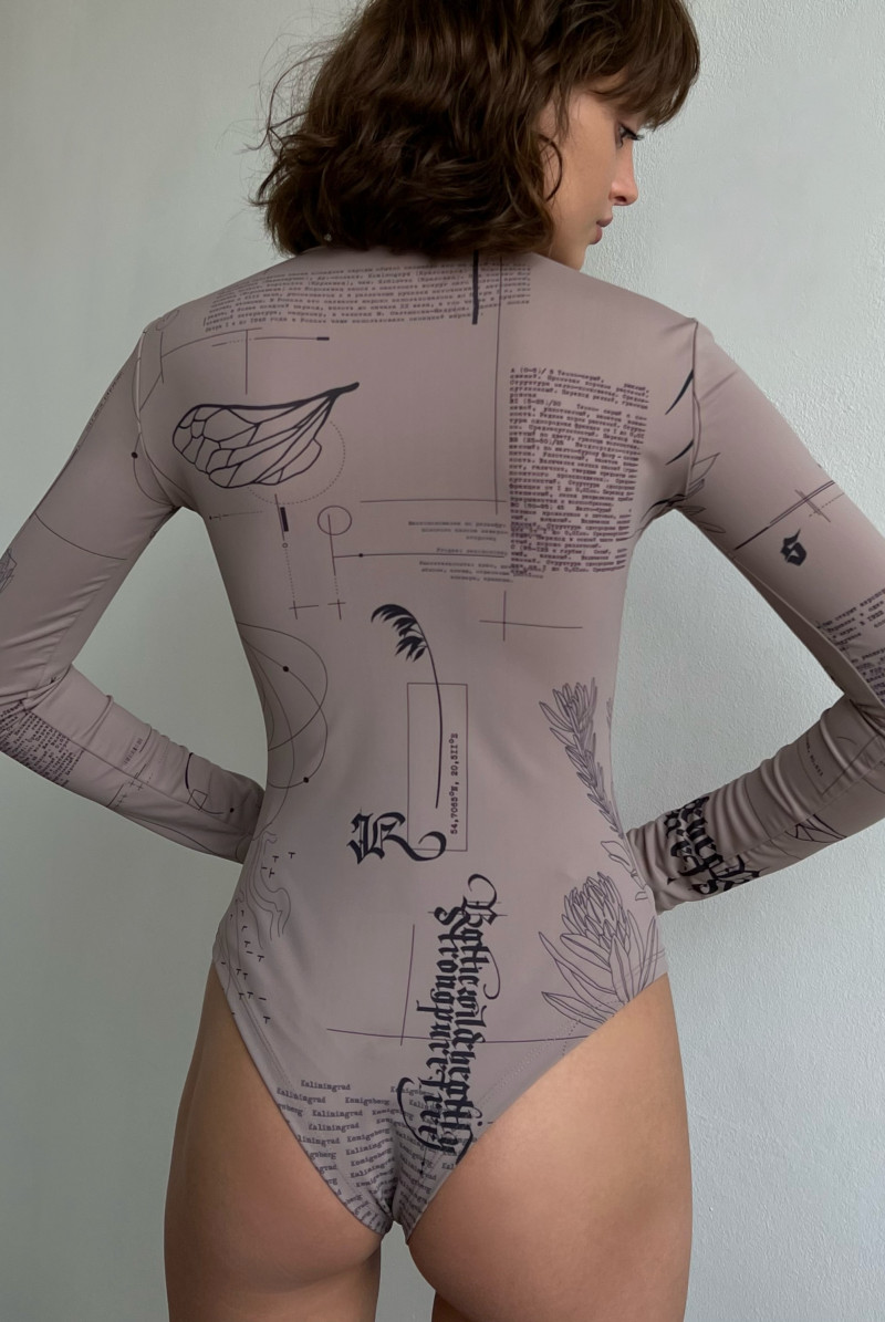 Боди из бифлекса с длинным рукавом, круглая горловина, рисунок татуировки.