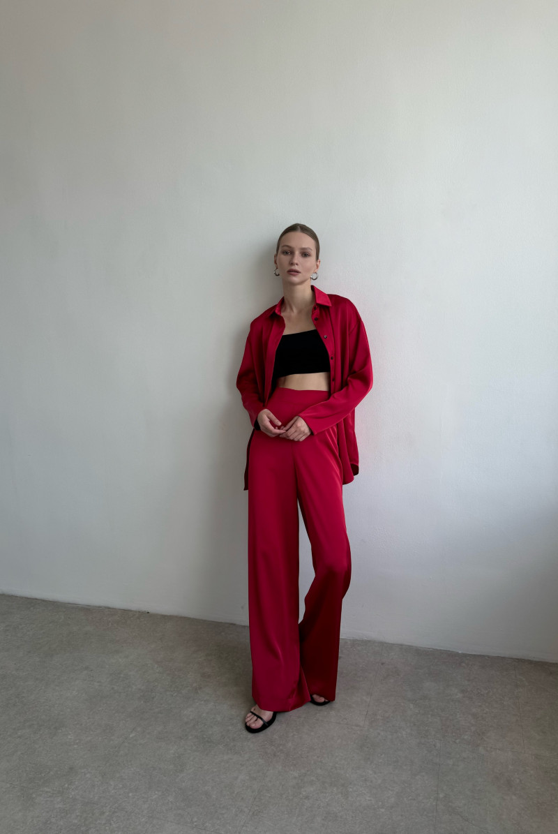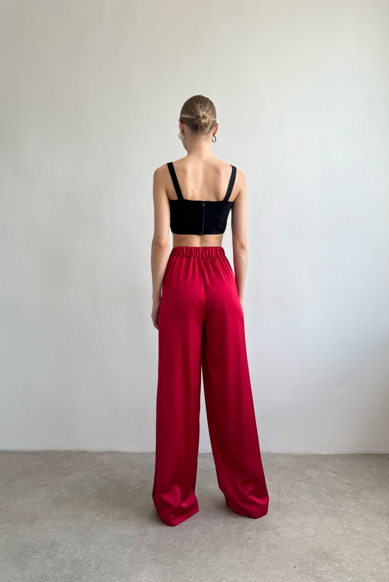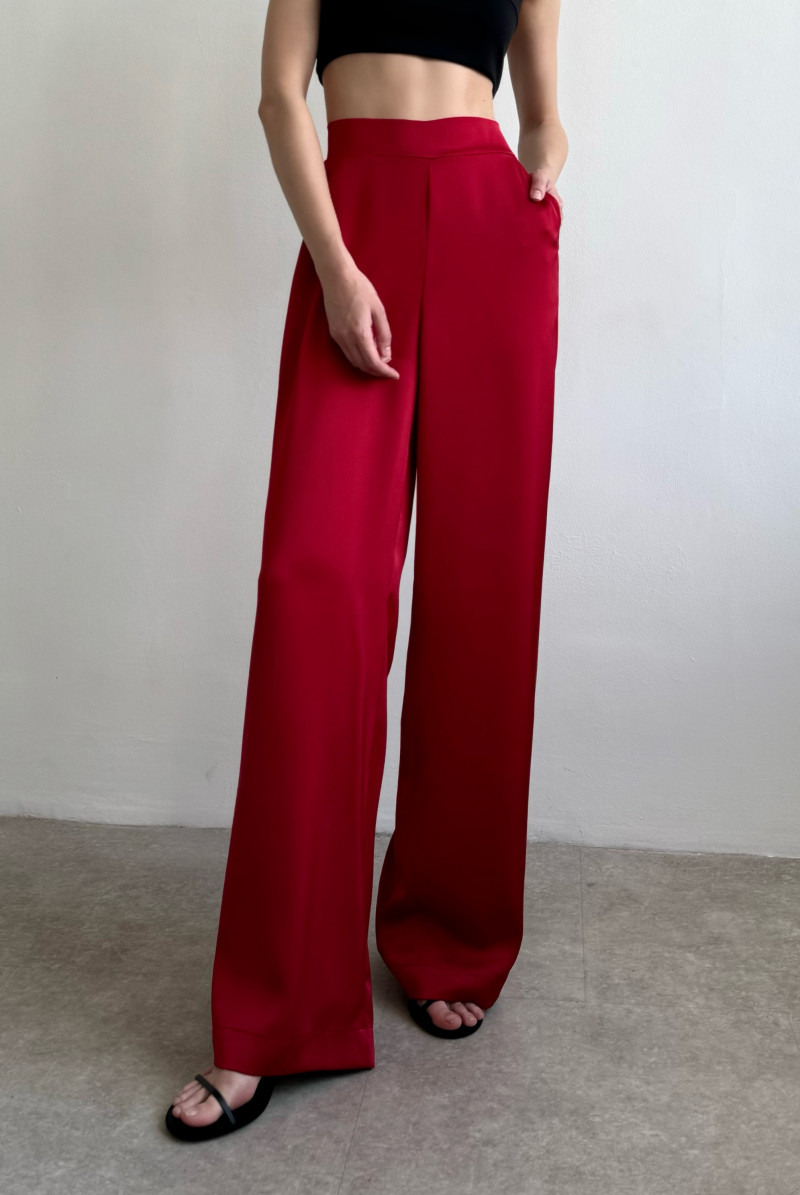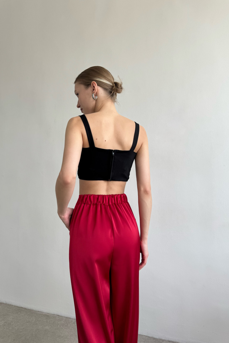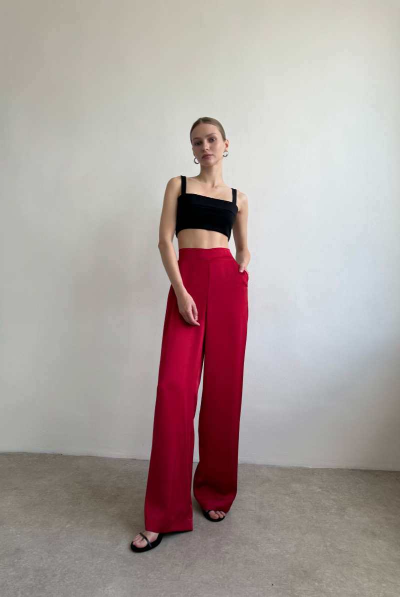 Широкие брюки на поясе с резинкой на спинке. Карманы спереди с бочком. Подгибка широкая с отстрочкой.