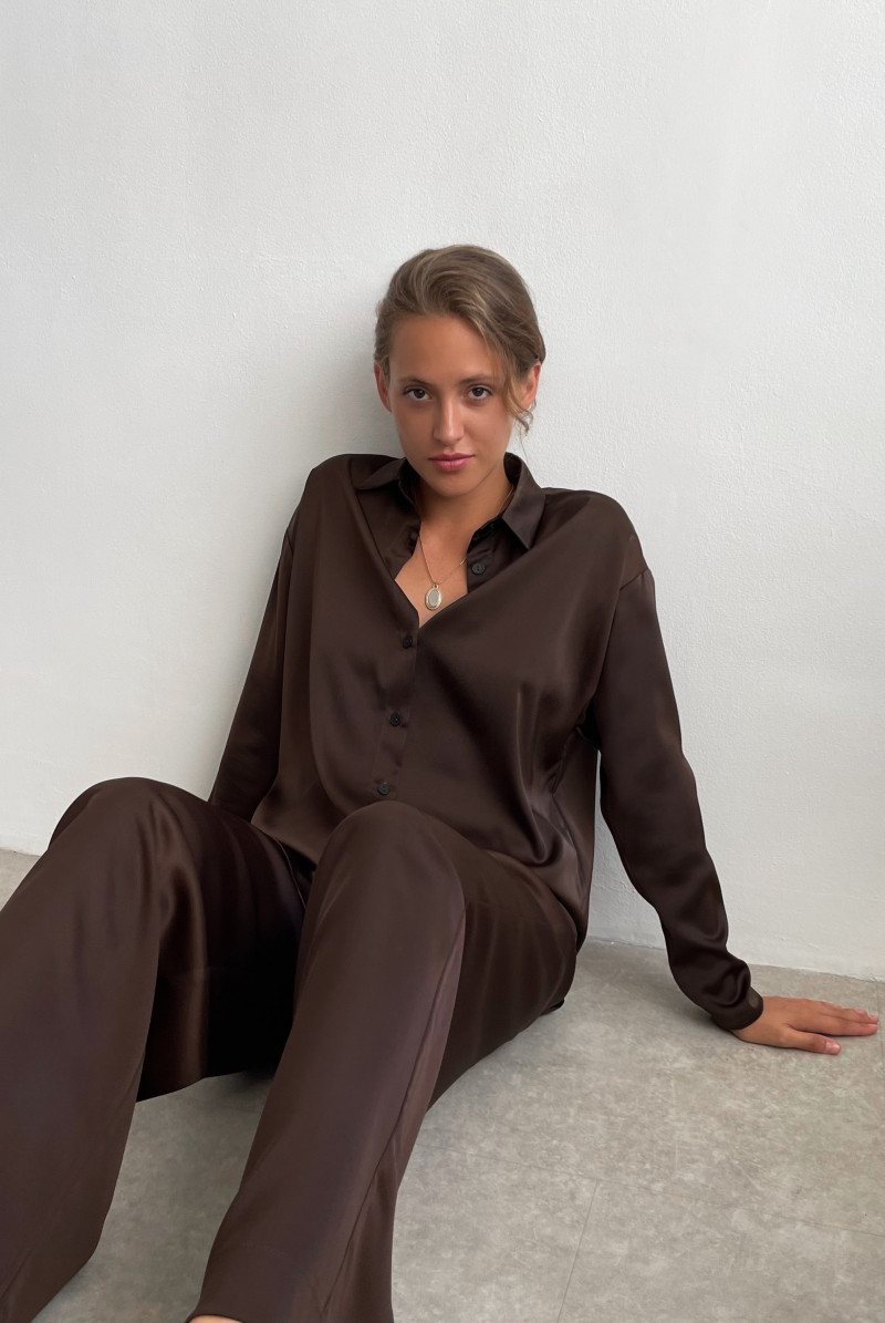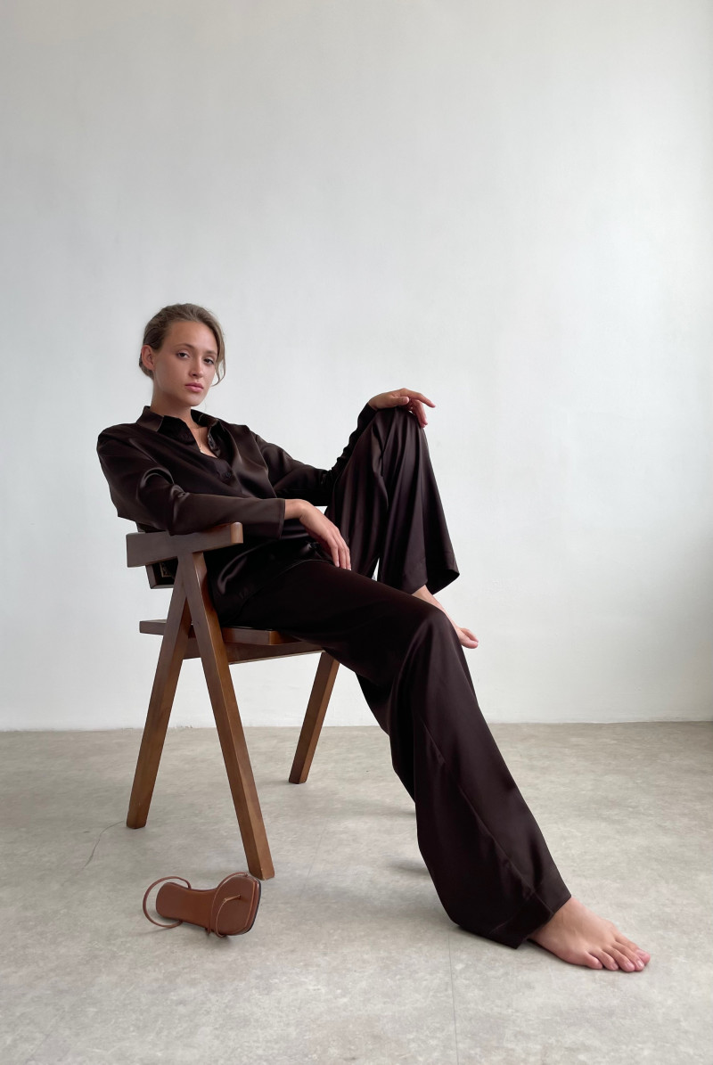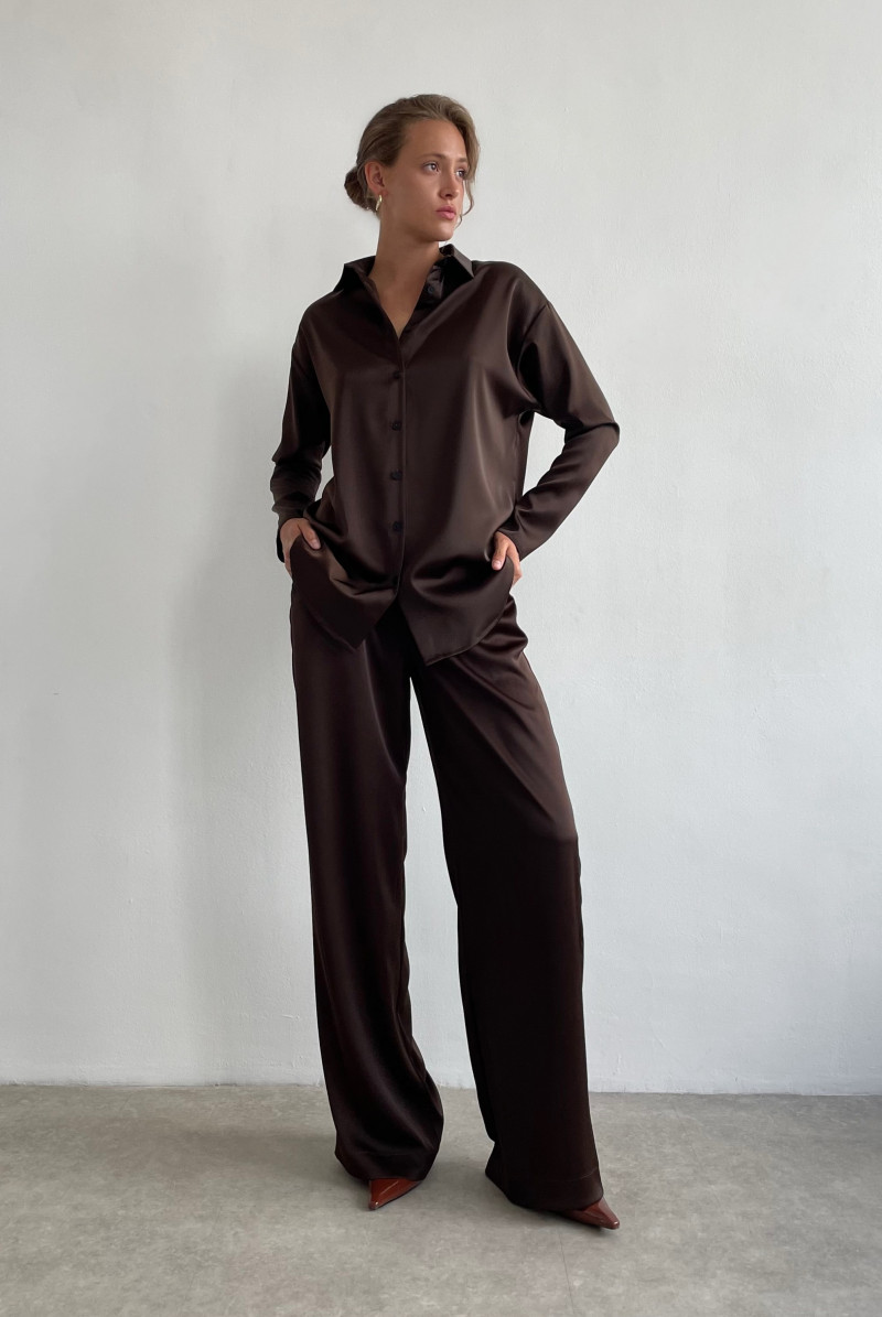 Широкие брюки на поясе с резинкой на спинке. Карманы спереди с бочком. Подгибка широкая с отстрочкой.