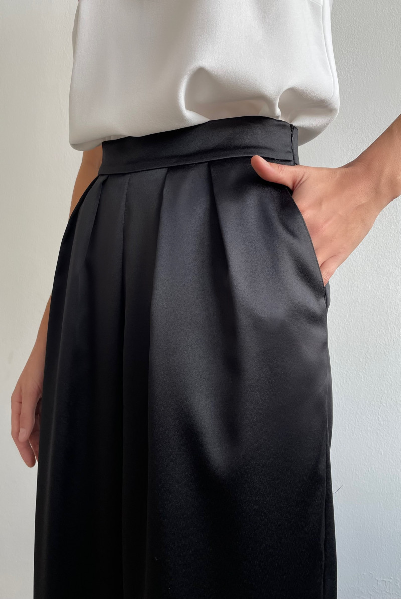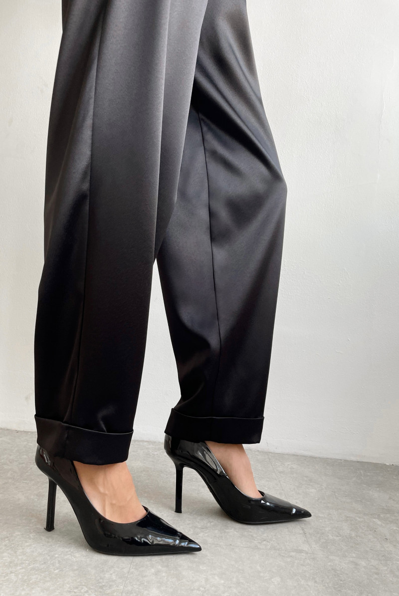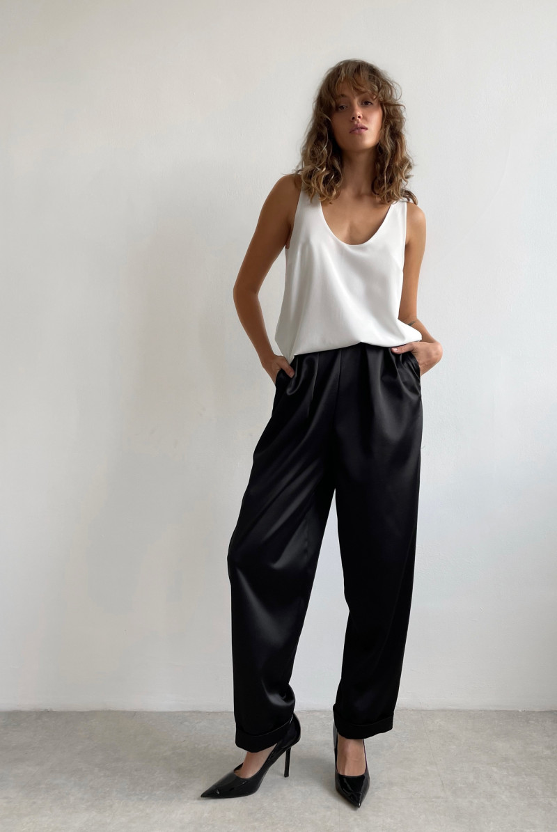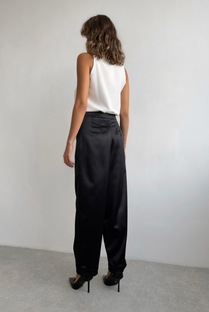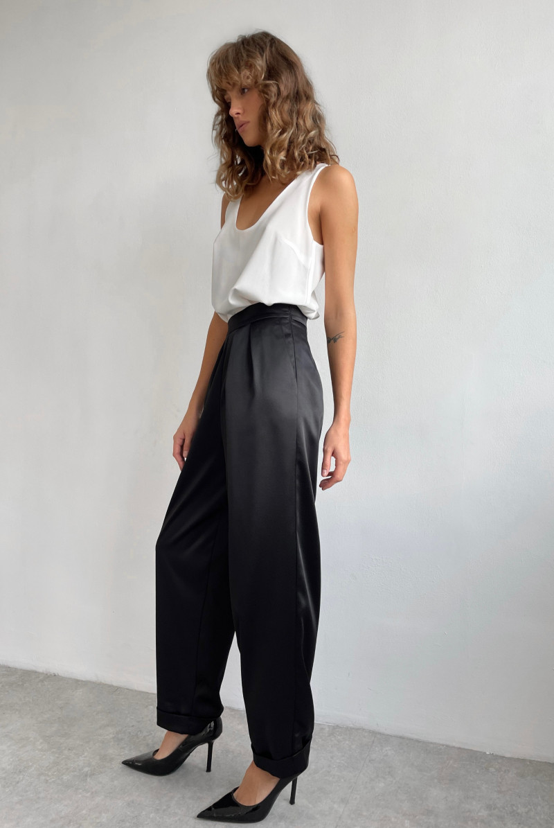 Брюки "бананы" с посадкой на талии. Застёжка на потайную молнию в левом боковом шве. Карманы спереди, по переду складки. По низу брюк манжеты.