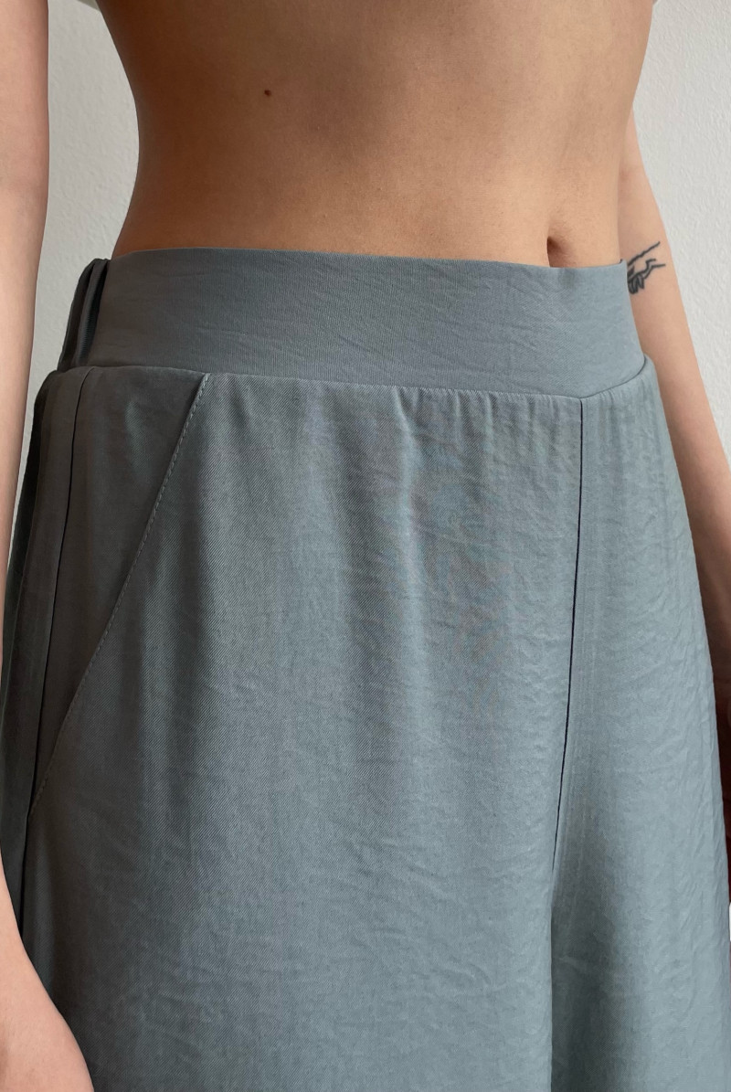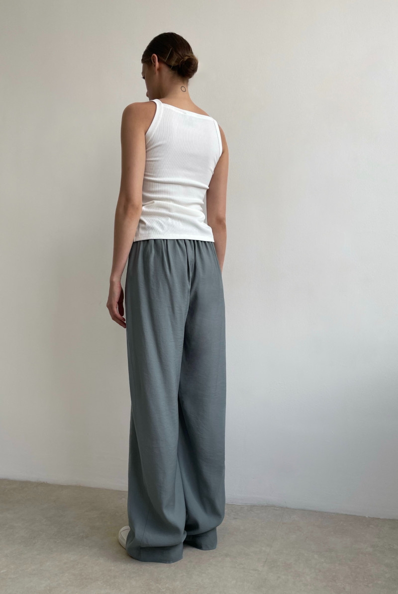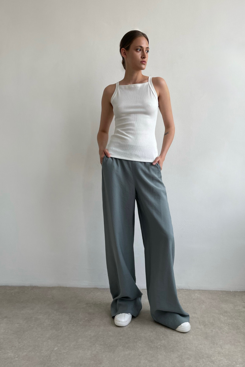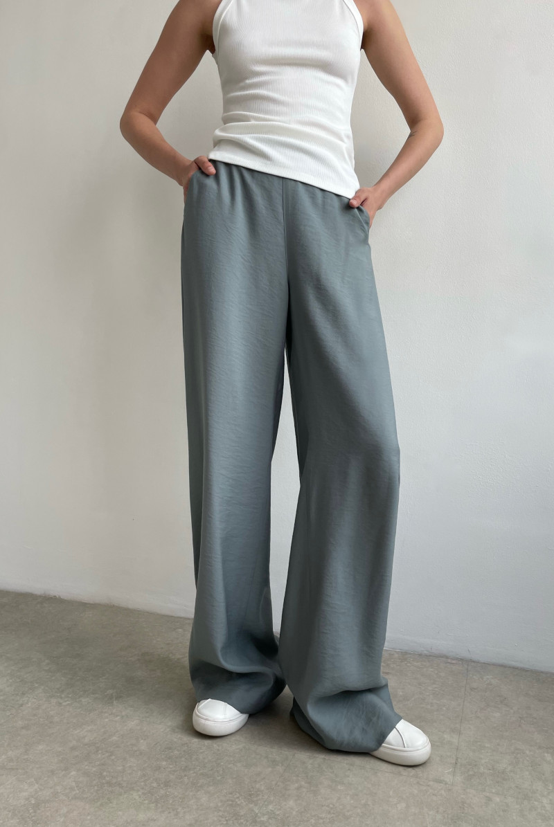 Широкие брюки на поясе с резинкой на спинке. Карманы спереди с бочком. Подгибка широкая с отстрочкой.