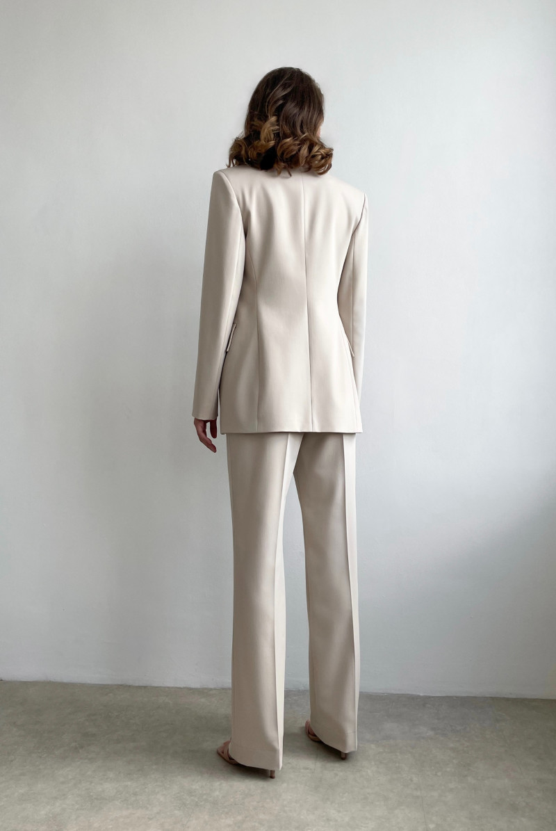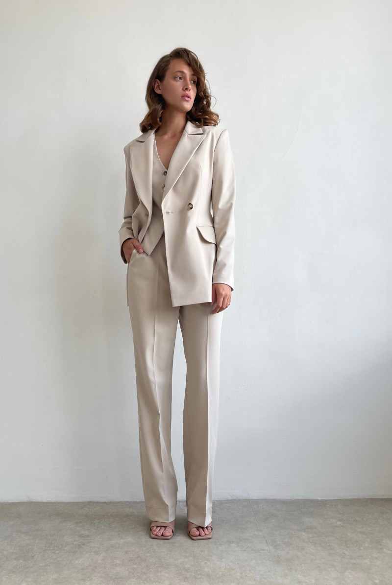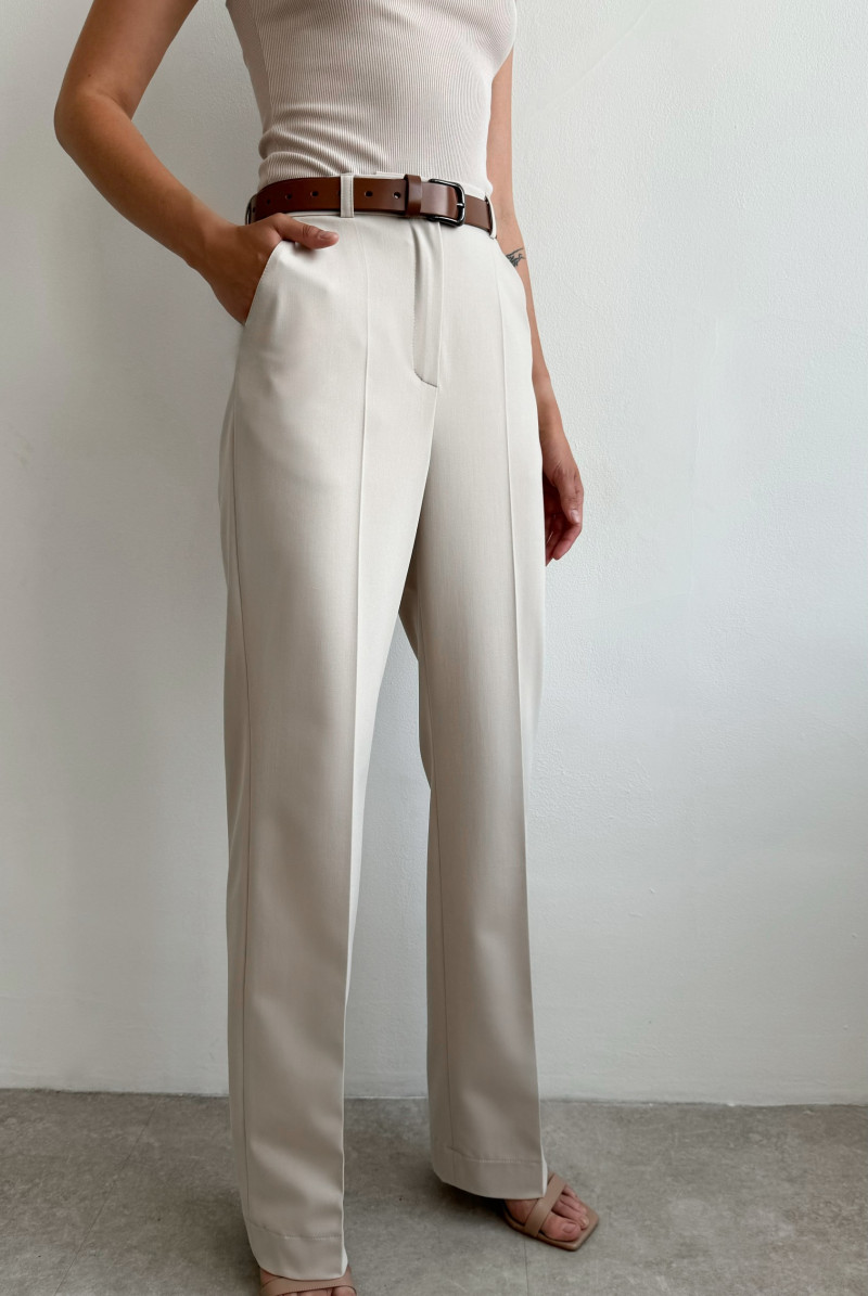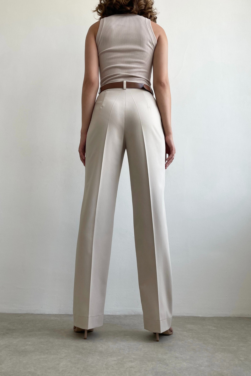 Прямые брюки с посадкой "на талии" со стрелками. Карманы спереди (с отрезным бочком). На поясе шлёвки. Застежка гульфик с молнией.