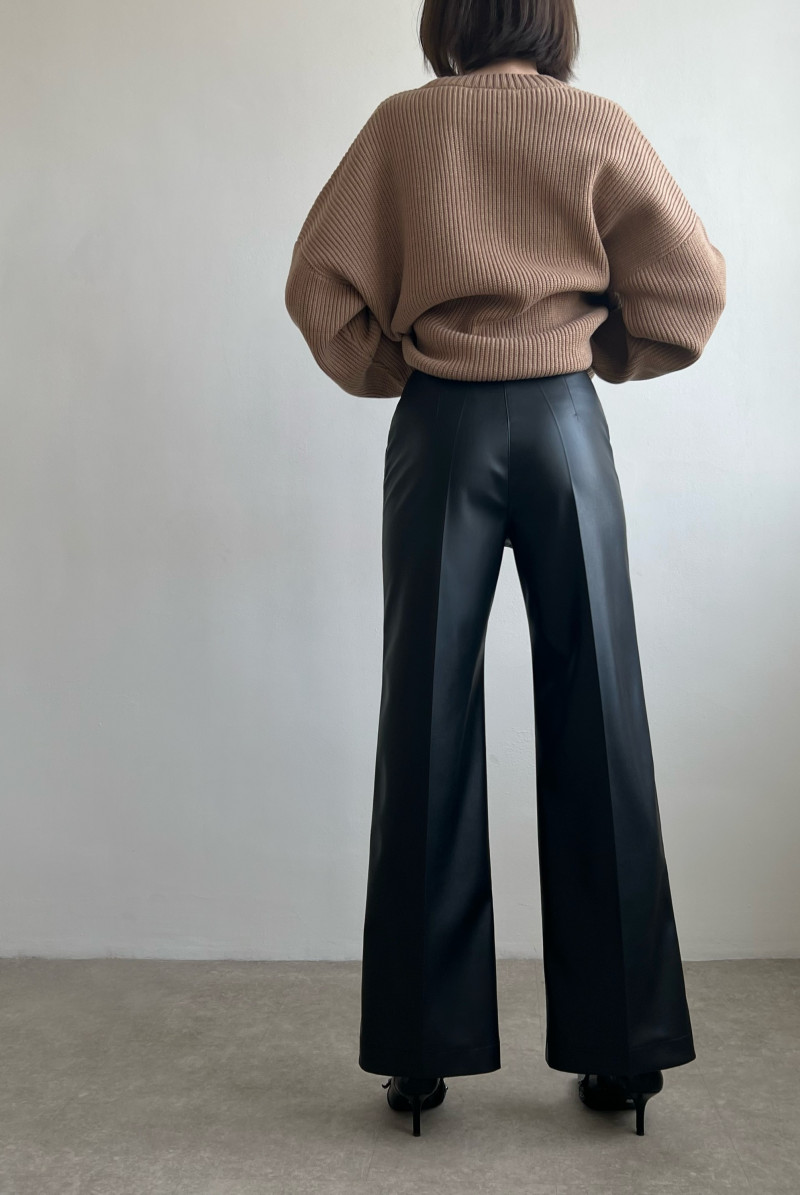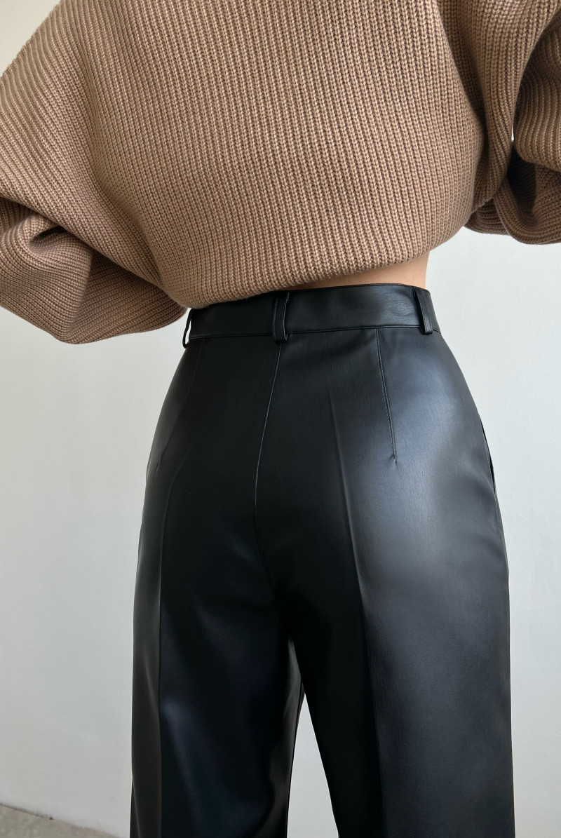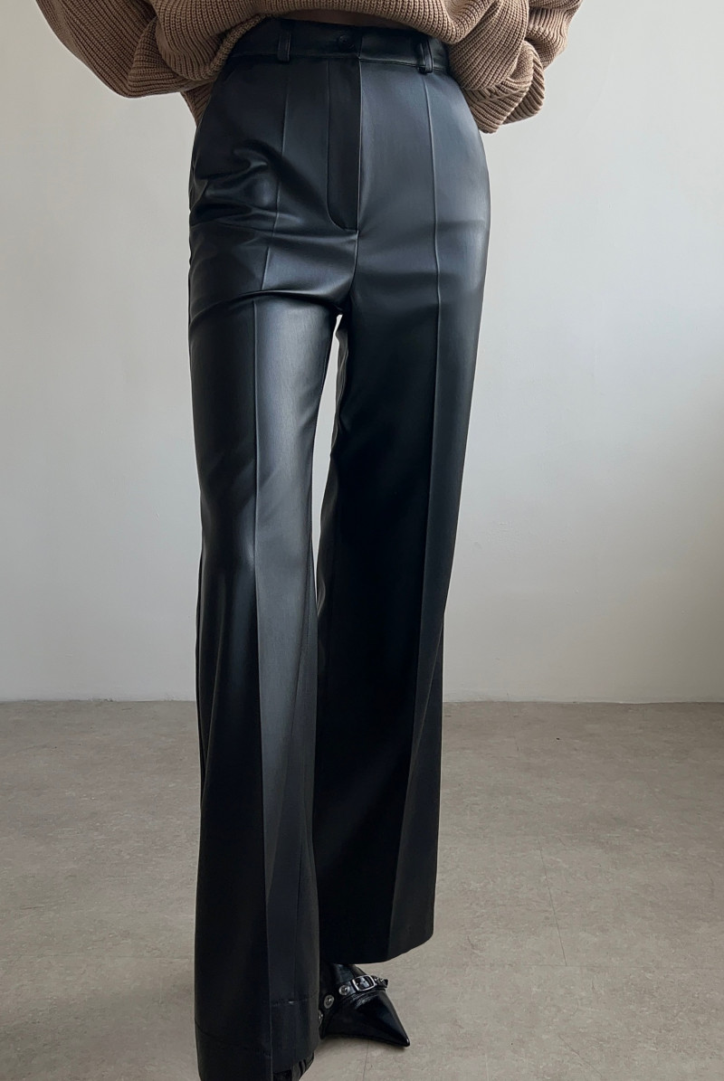 Брюки с карманами на высокой талии из эко-кожи, расклешённые к низу. Застёжка "гульфик" спереди.