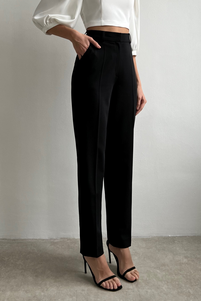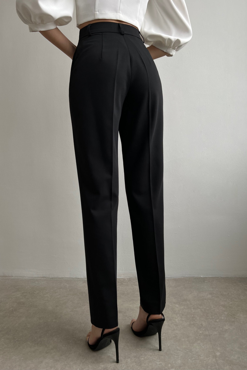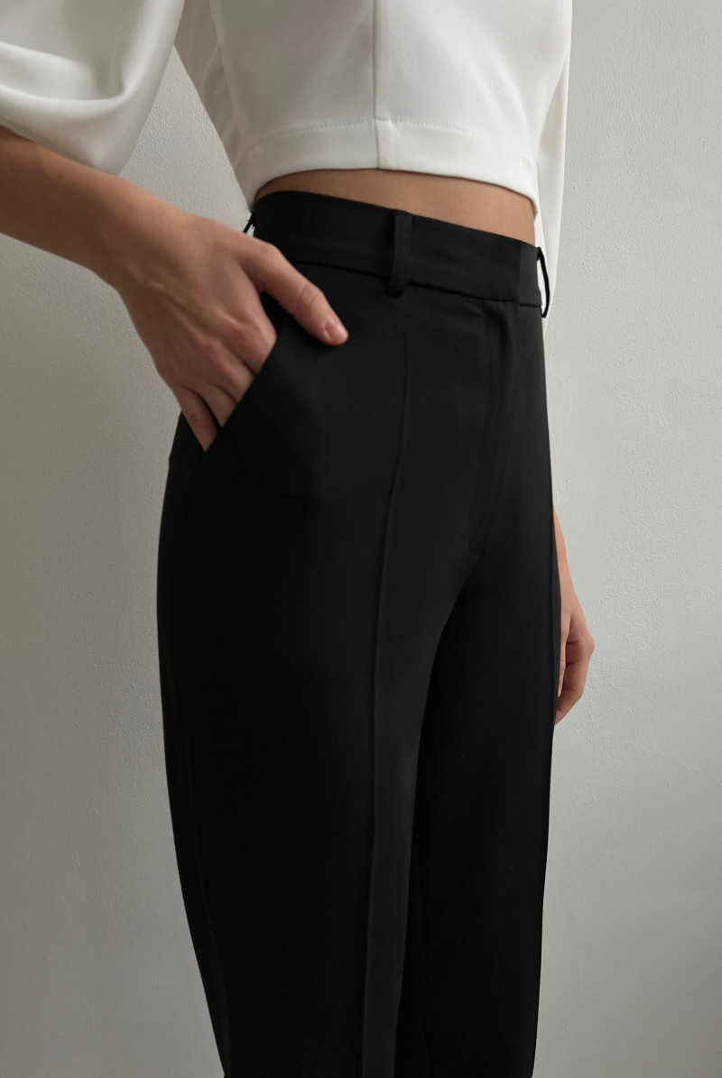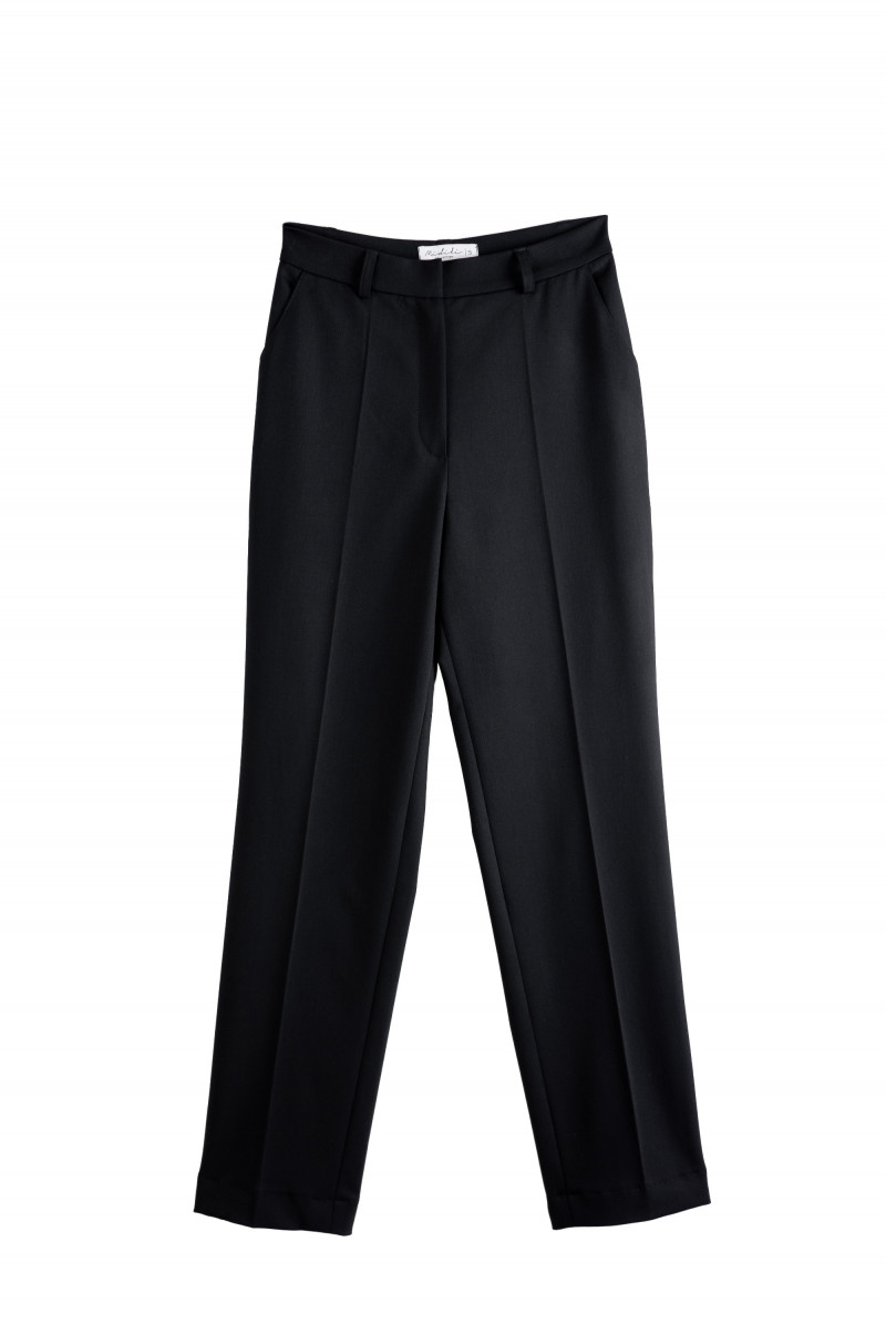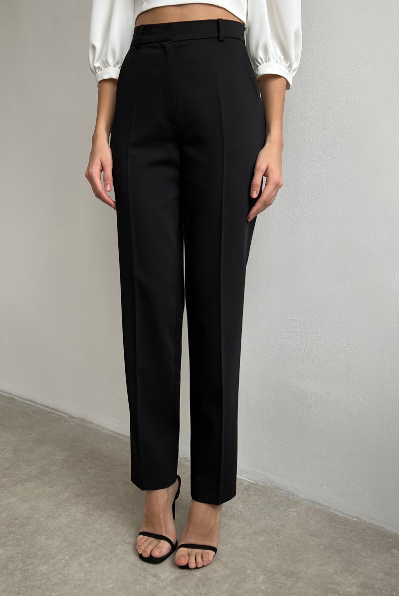 Брюки зауженные книзу, с карманами. Пояс брюк лежит на линии талии. Застежка - молния спереди.