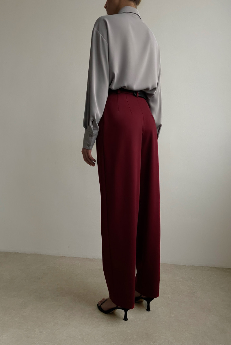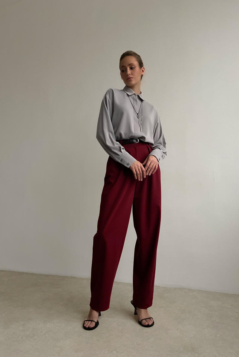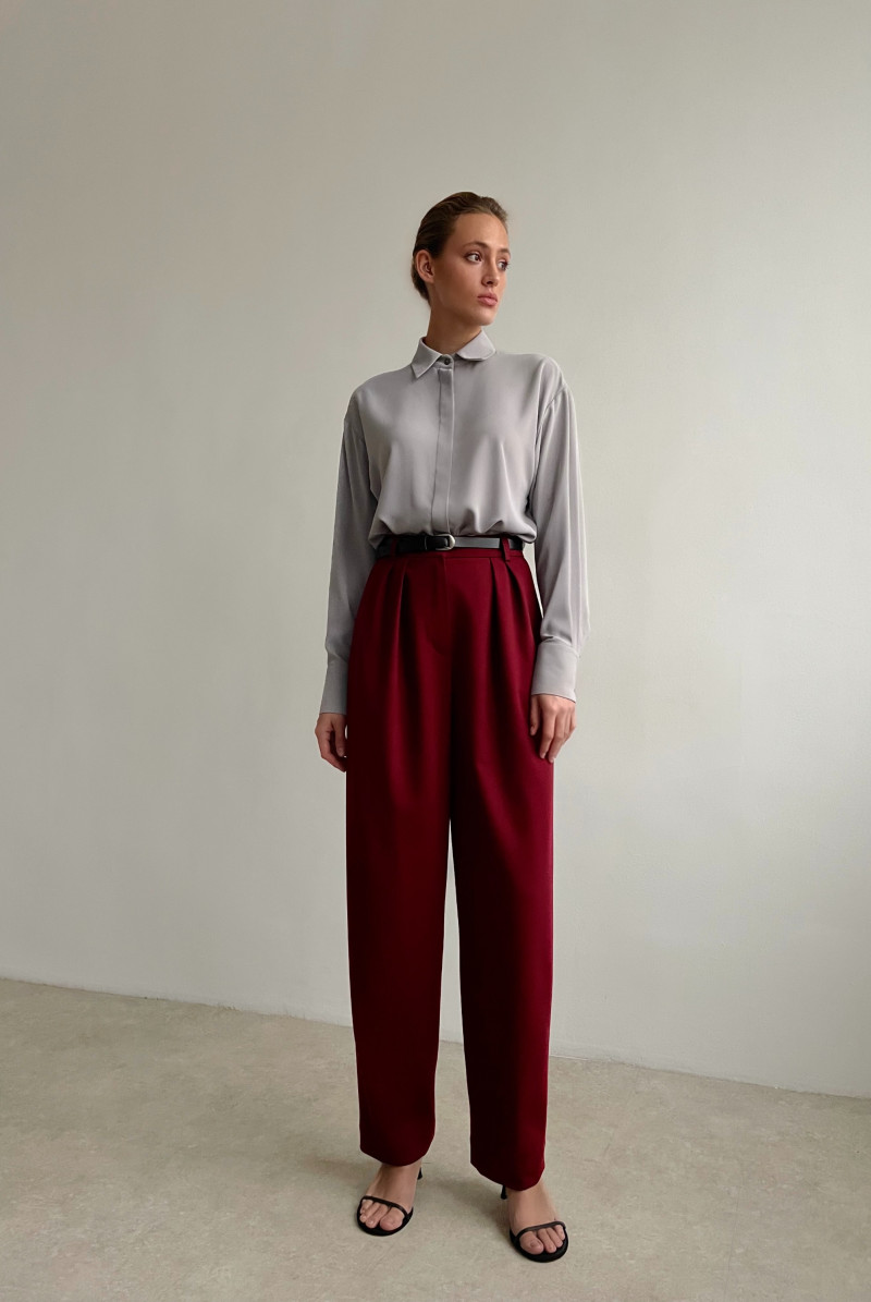 Брюки "бананы" со складками, посадкой на талии. Застёжка на молнию и потайной крючок спереди. Карманы спереди.