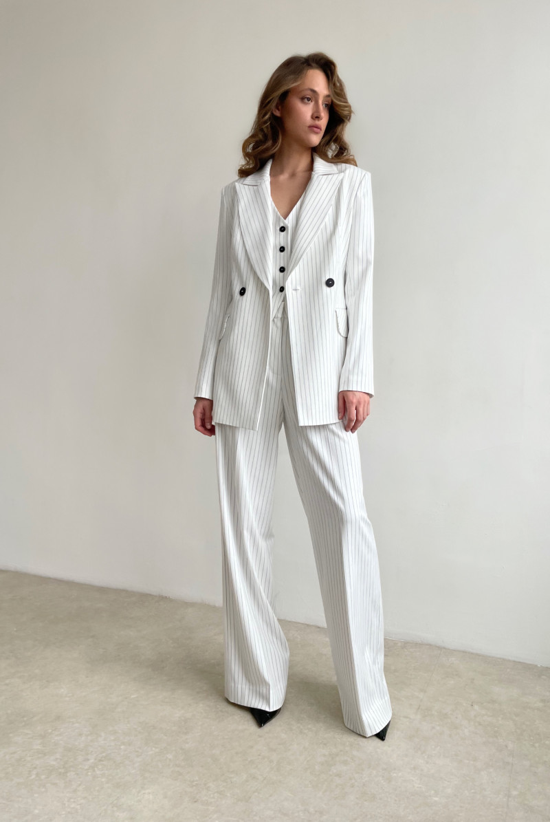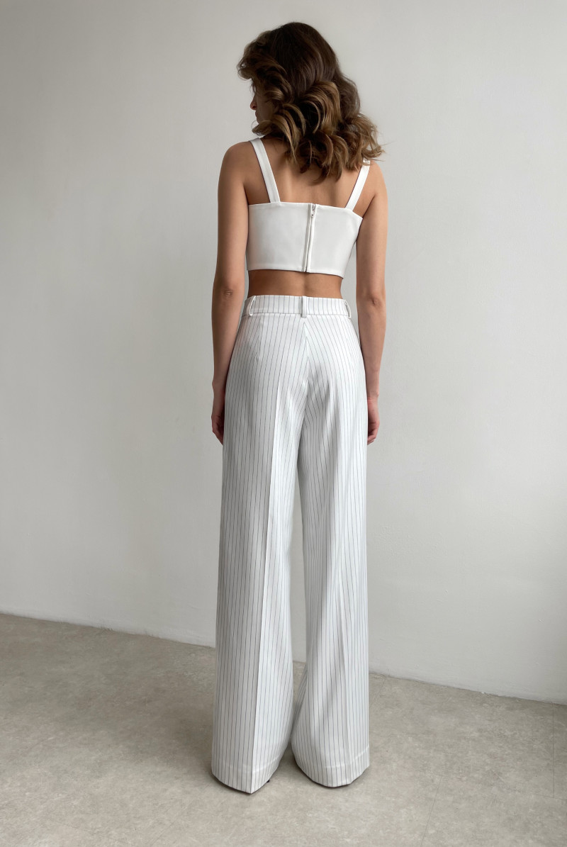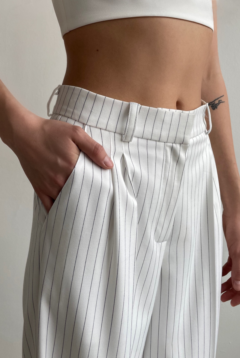 Брюки свободного кроя на поясе со шлевками, по переду складки, без карманов.