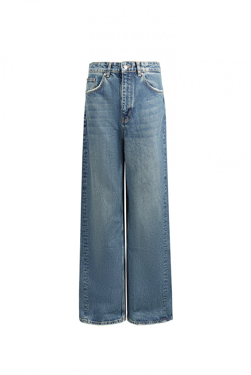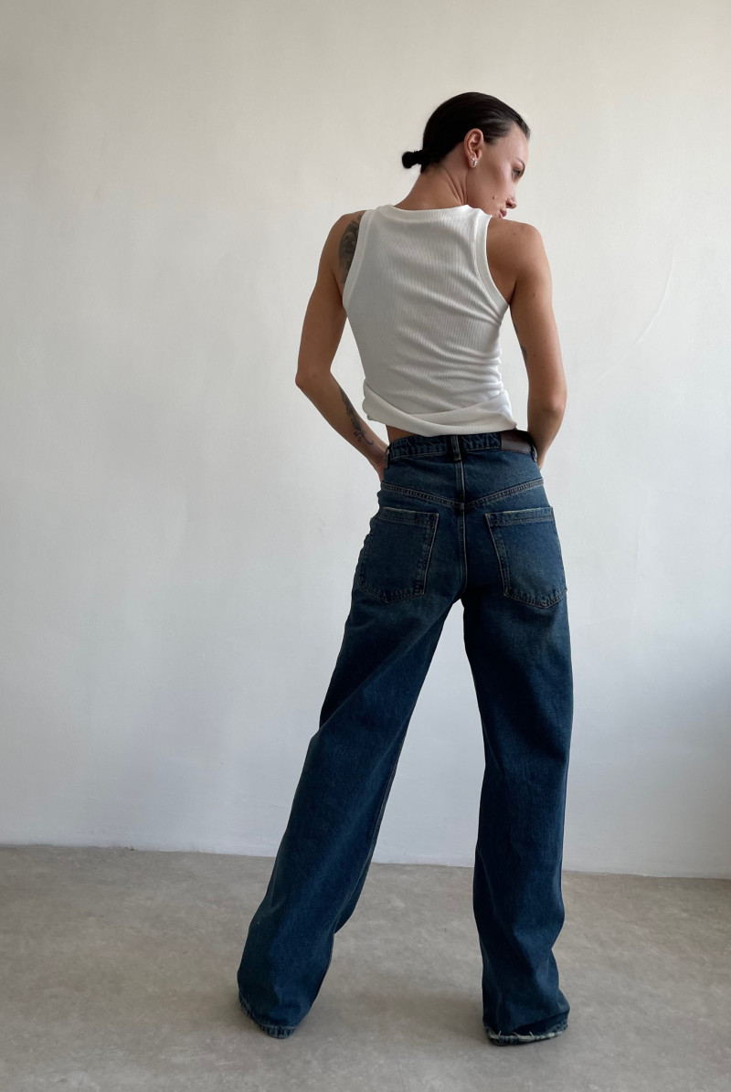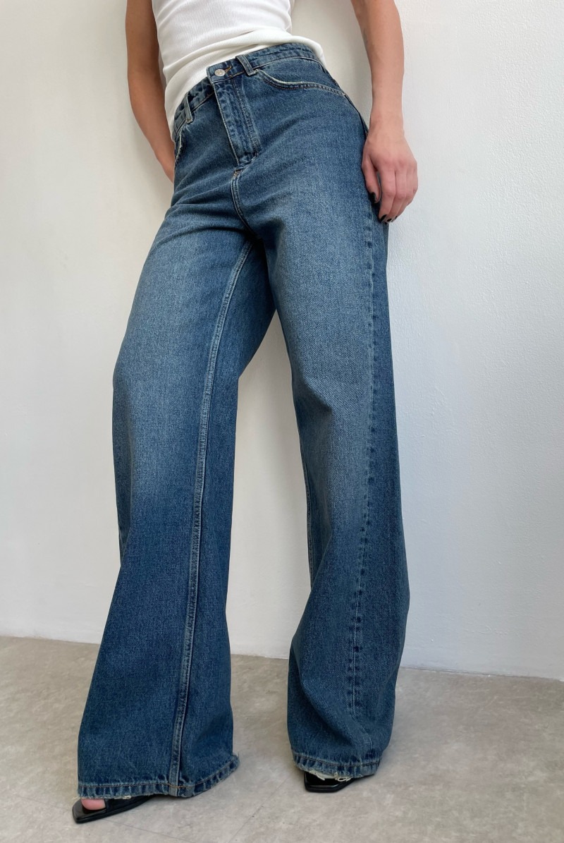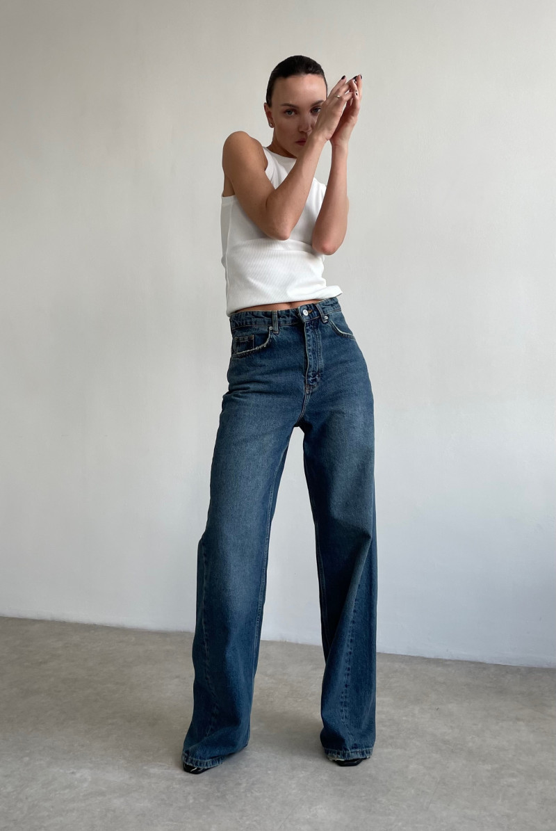 Джинсы с высокой посадкой "на талии". Брючины прямые, широкие от бедра к низу.