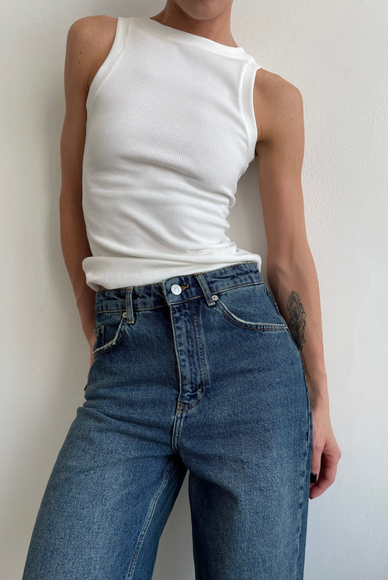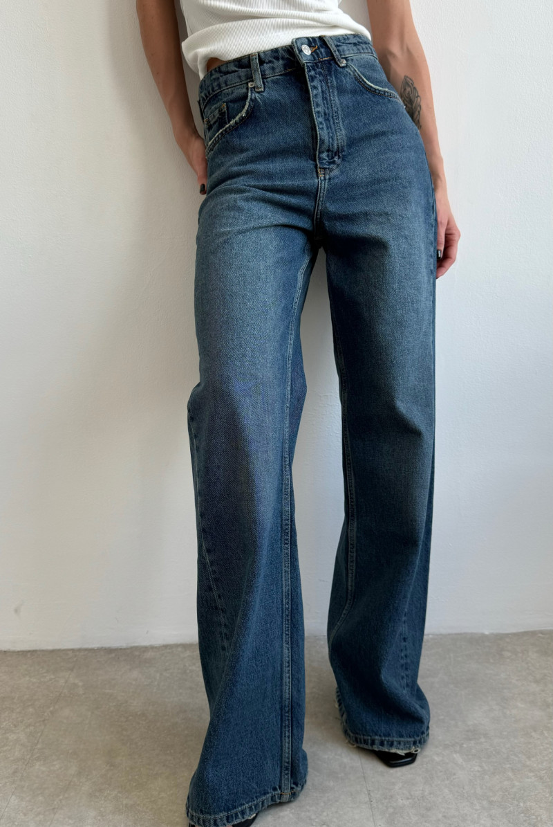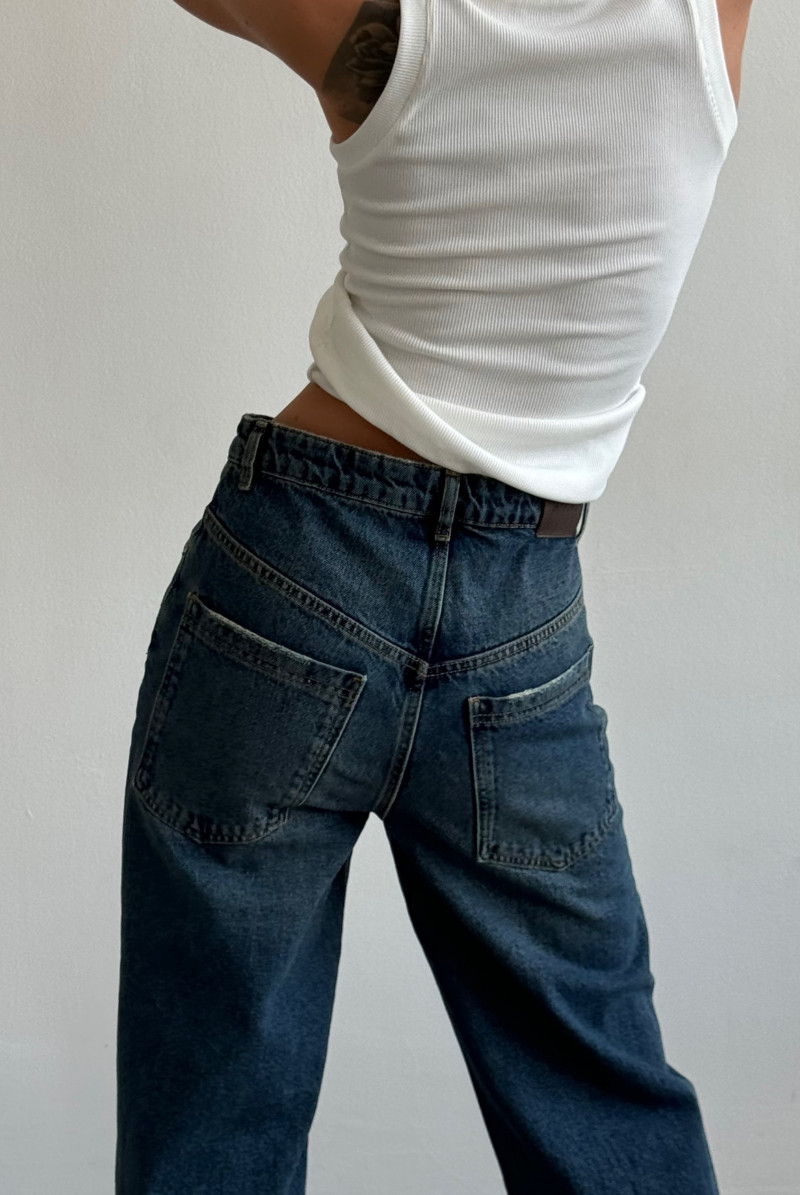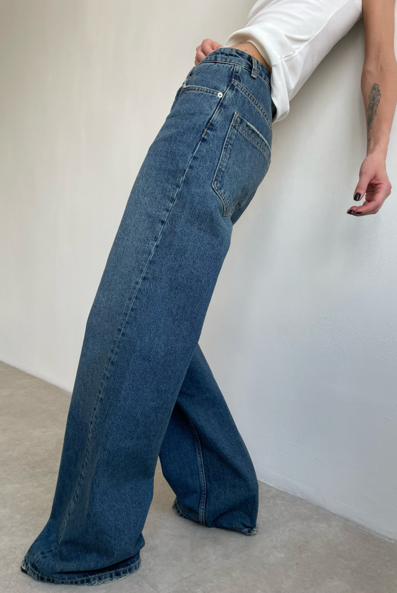 Джинсы с высокой посадкой "на талии". Брючины прямые, широкие от бедра к низу.