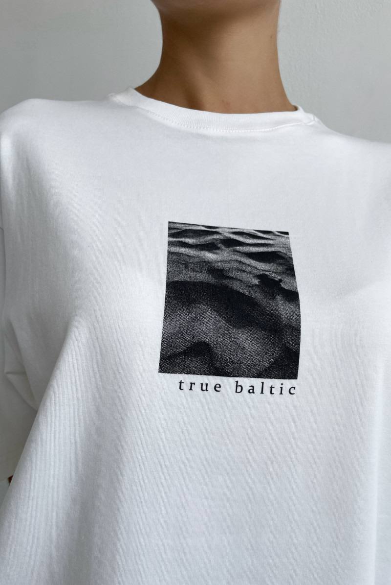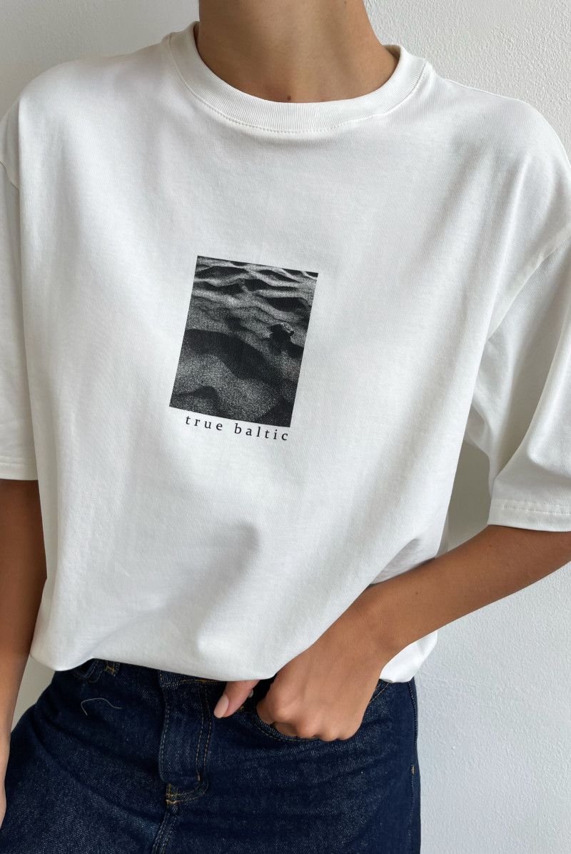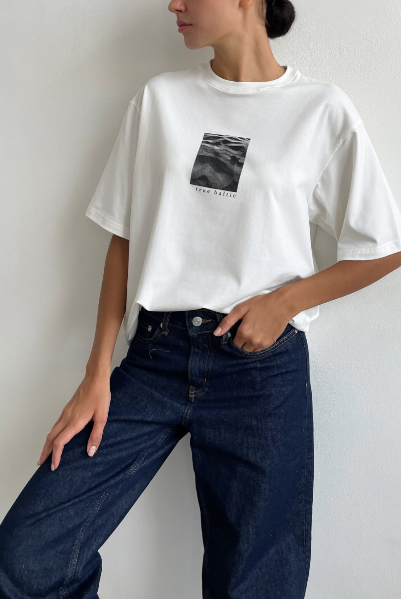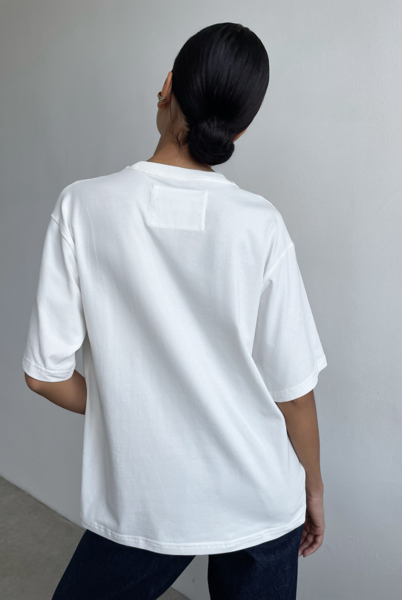 Футболка прямого кроя (с небольшим оверсайз объемом). Линия плеча спущена, рукав короткий, вырез горловины круглый.