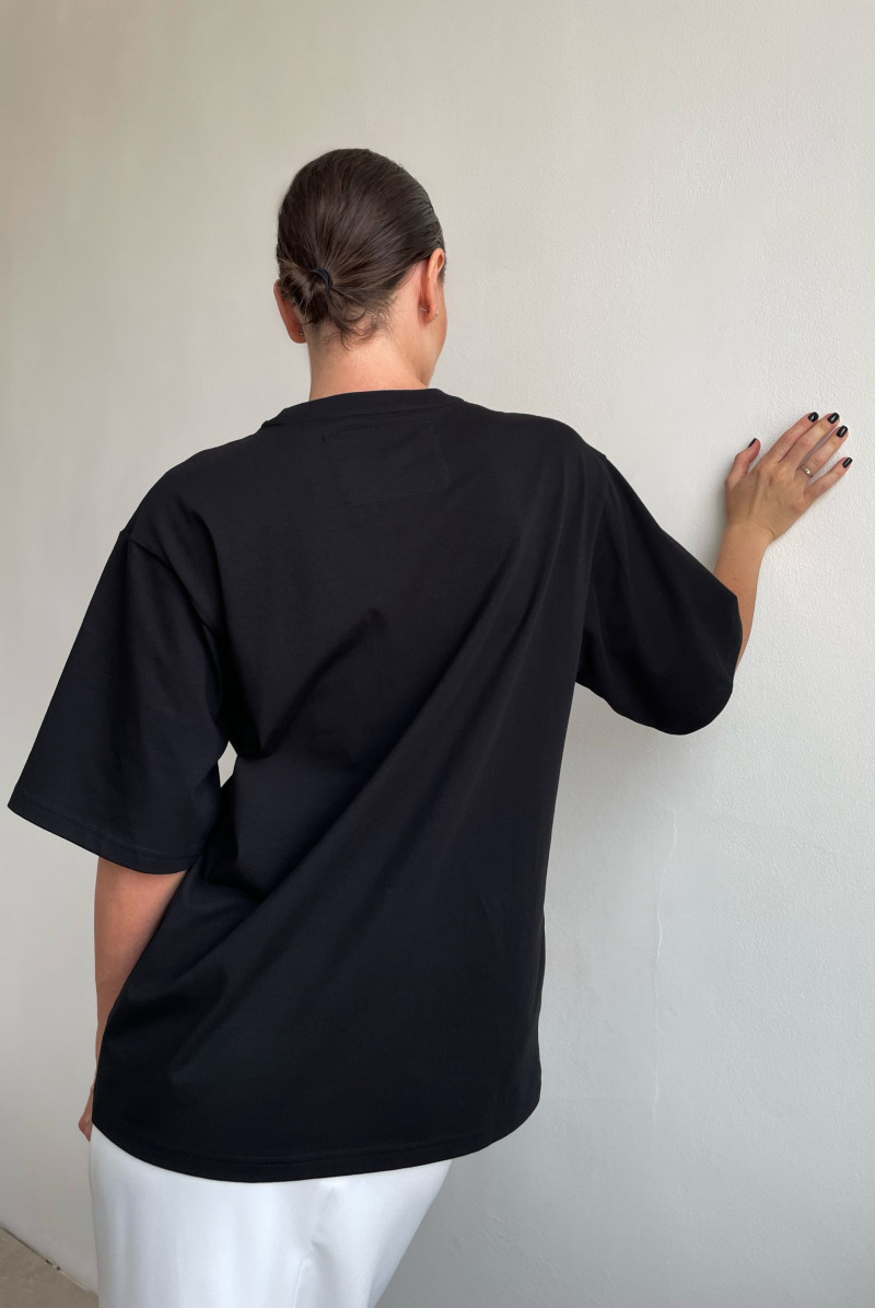 Футболка прямого кроя (с небольшим оверсайз объемом). Линия плеча спущена, рукав короткий, вырез горловины круглый.