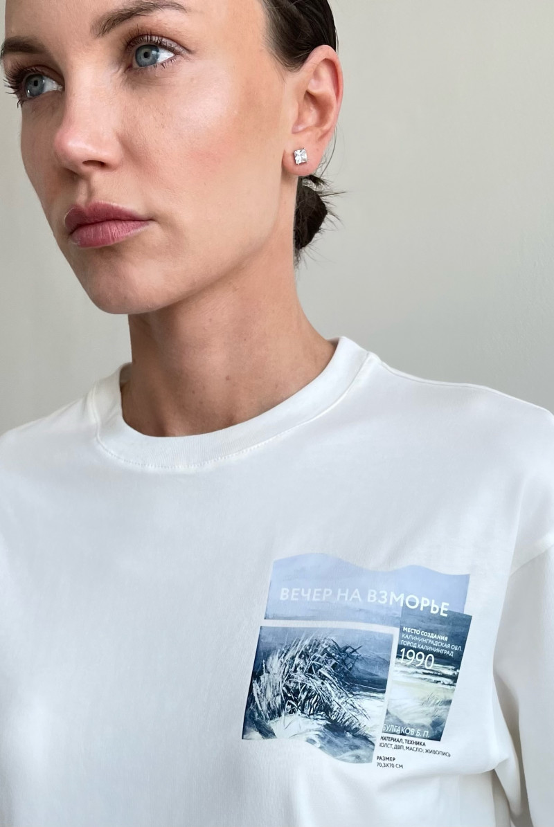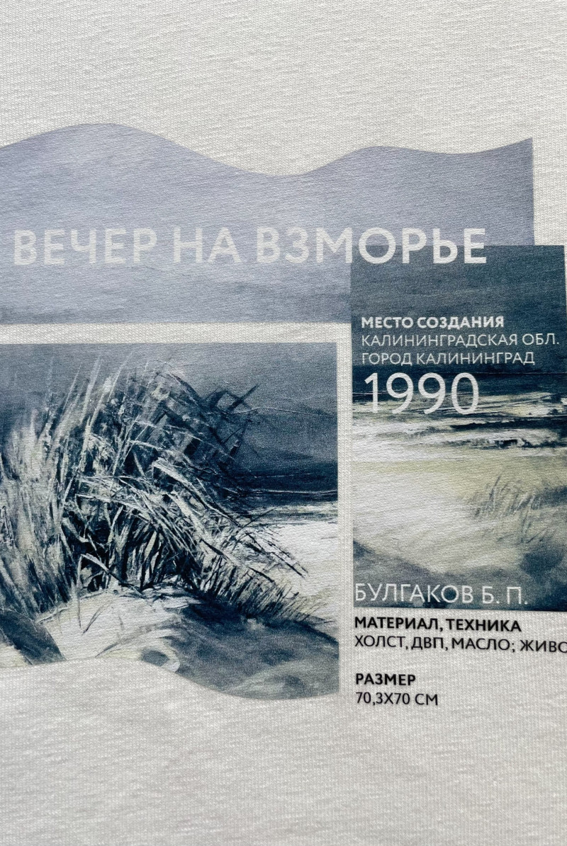 Футболка из лимитированной коллекции, созданной брендом MIDITI в коллаборации с Калининградским областным историко-художественным музеем. Основой для данного принта стала картина из архивов музея «Вечер на взморье» (1990) художника Бориса Павловича Булгакова. Дизайнеры бренда выбрали произведения этого автора, потому что его работы передают именно то настроение балтийского моря, которое и делает его уникальным, мудрым, настоящим и таким любимым.