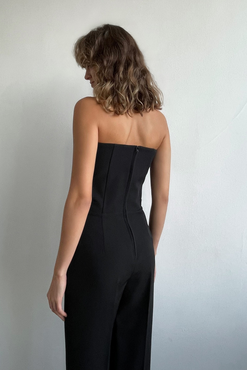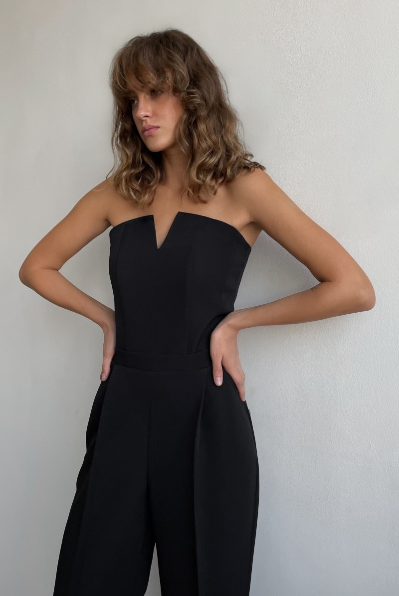 Комбинезон с широкими брюками и корсетом, с втачным поясом по талии. В боковых швах брюк - карманы, по талии складки по переду. Застёжка по середине спинки на молнию.