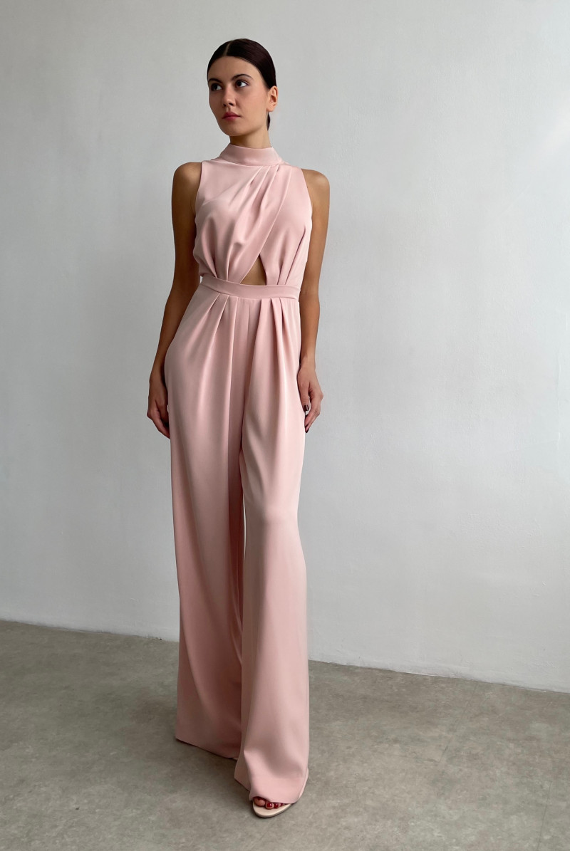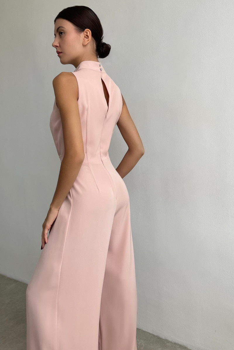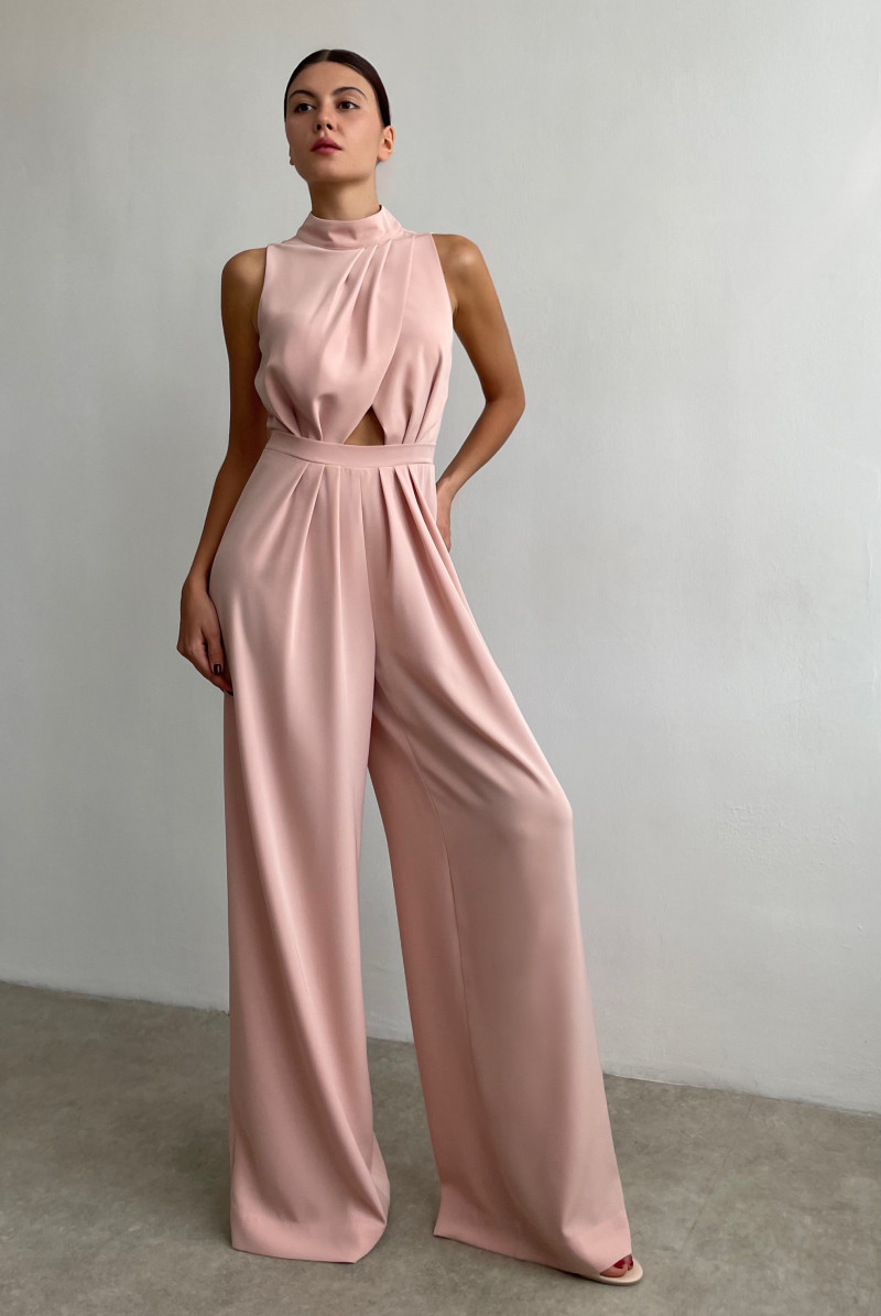 Комбинезон с широкими брюками. Верх "на запах" спереди, по талии втачной пояс. Верх без рукавов, воротник стойка с пуговицами сзади. Застёжка на потайную молнию в среднем шве спинки.
