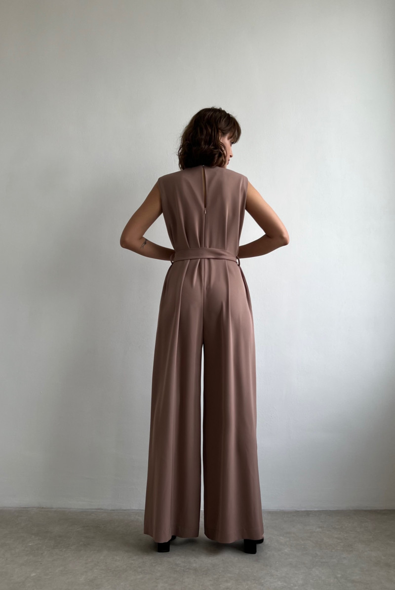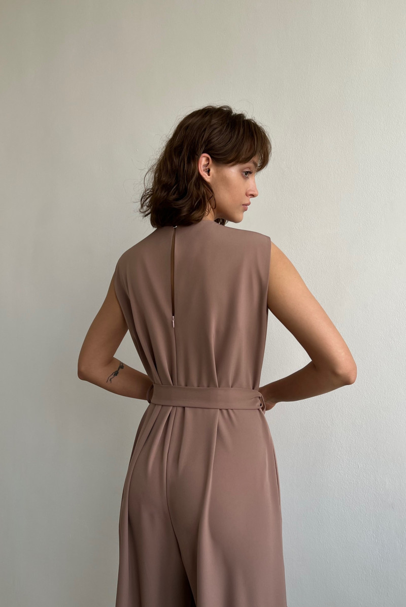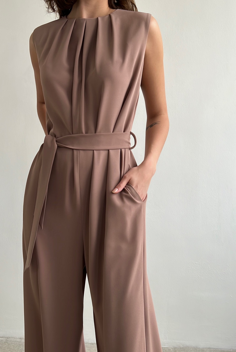 Комбинезон свободного кроя с широкими брюками, съёмным поясом. Вырез горловины круглый, по переду - складки у горловины, сзади по середине спинки "капелька" с застежкой на пуговку. В боковых швах карманы.