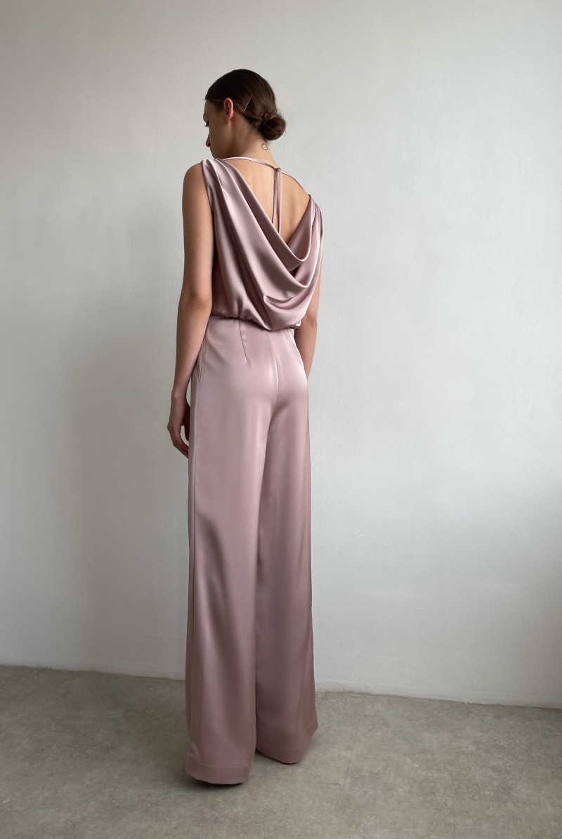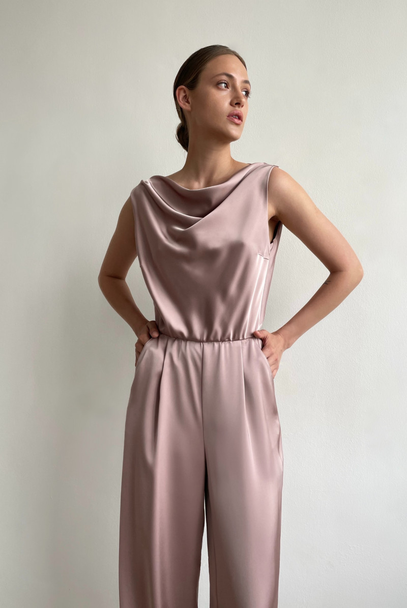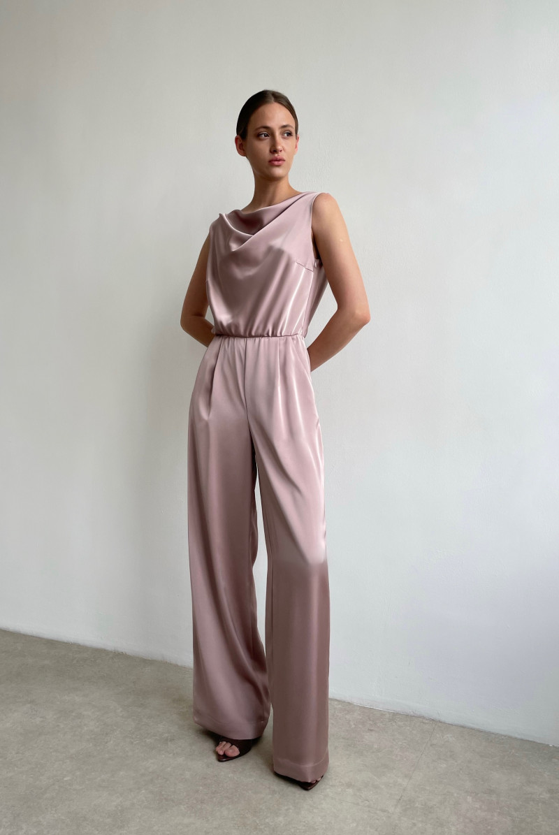 Комбинезон с широкими брюками прямого кроя. Верх-без рукавов, отрезной по линии талии. На спинке глубокий вырез в форме "качели". В левом боковом шве-застёжка молния.