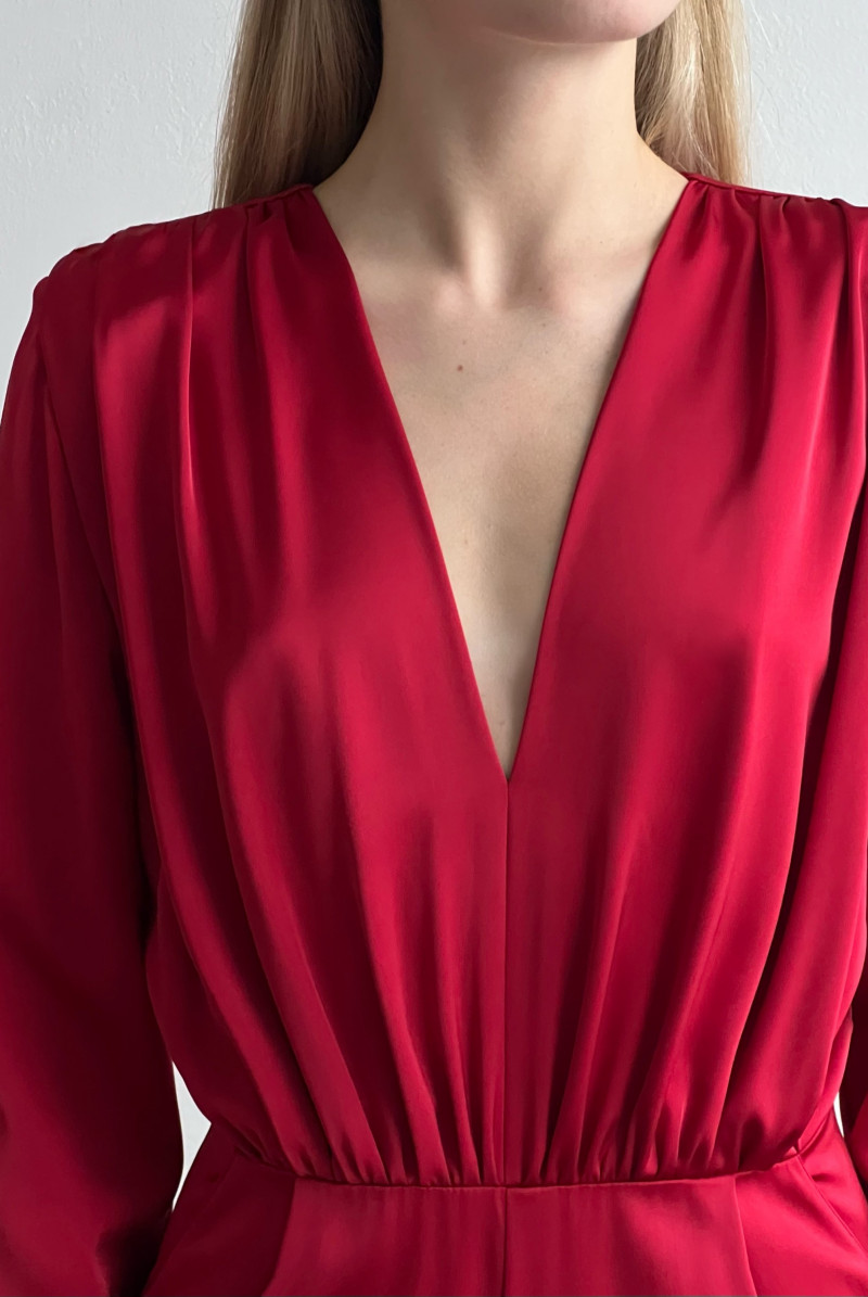 Комбинезон с широкими брюками, отрезной по талии. Вырез горловины глубокий, V-образный. По плечам и низу полочки - сборка. Рукав втачной, прямой, длинный. На передних половинках брюк - карманы.
