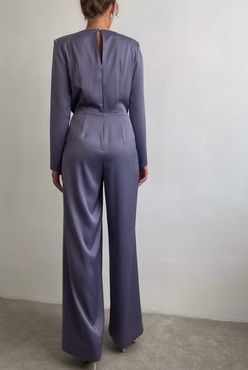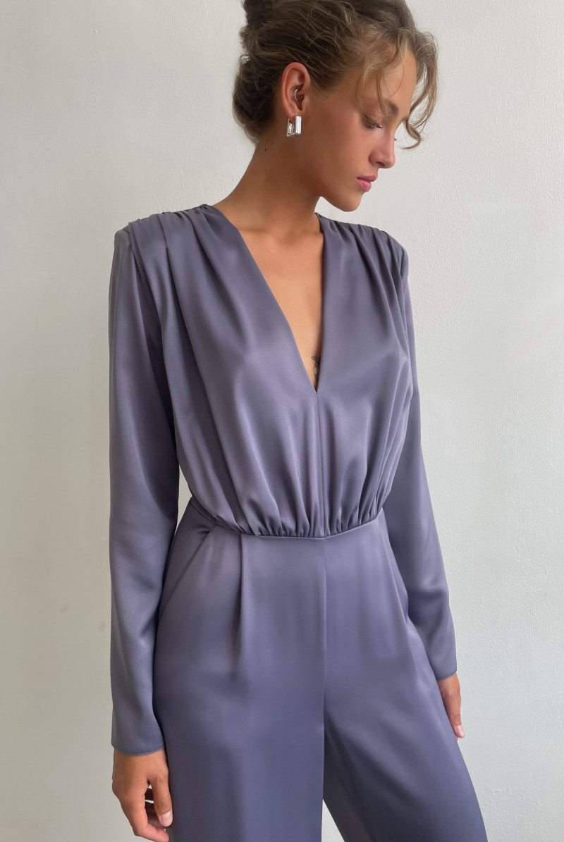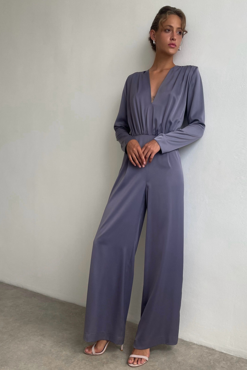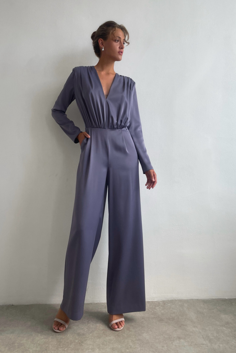 Комбинезон с широкими брюками, отрезной по талии. Вырез горловины глубокий, V-образный. По плечам и низу полочки - сборка. Рукав втачной, прямой, длинный. На передних половинках брюк - карманы.