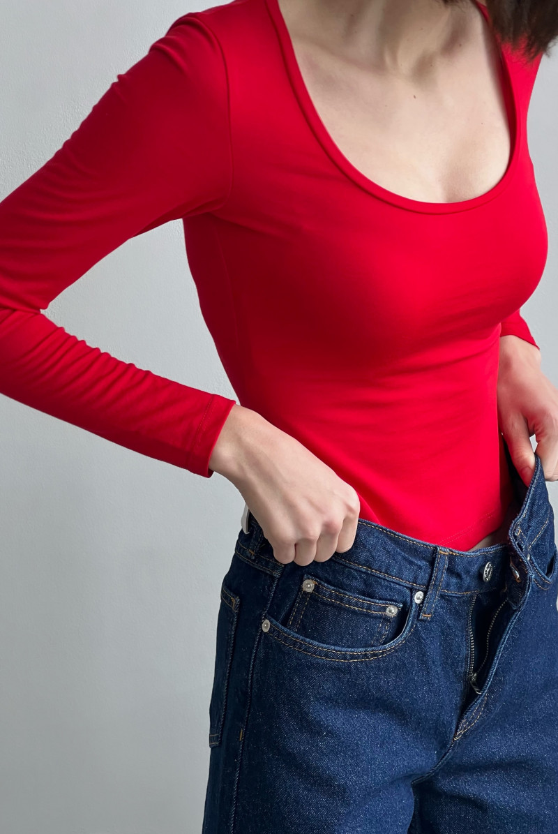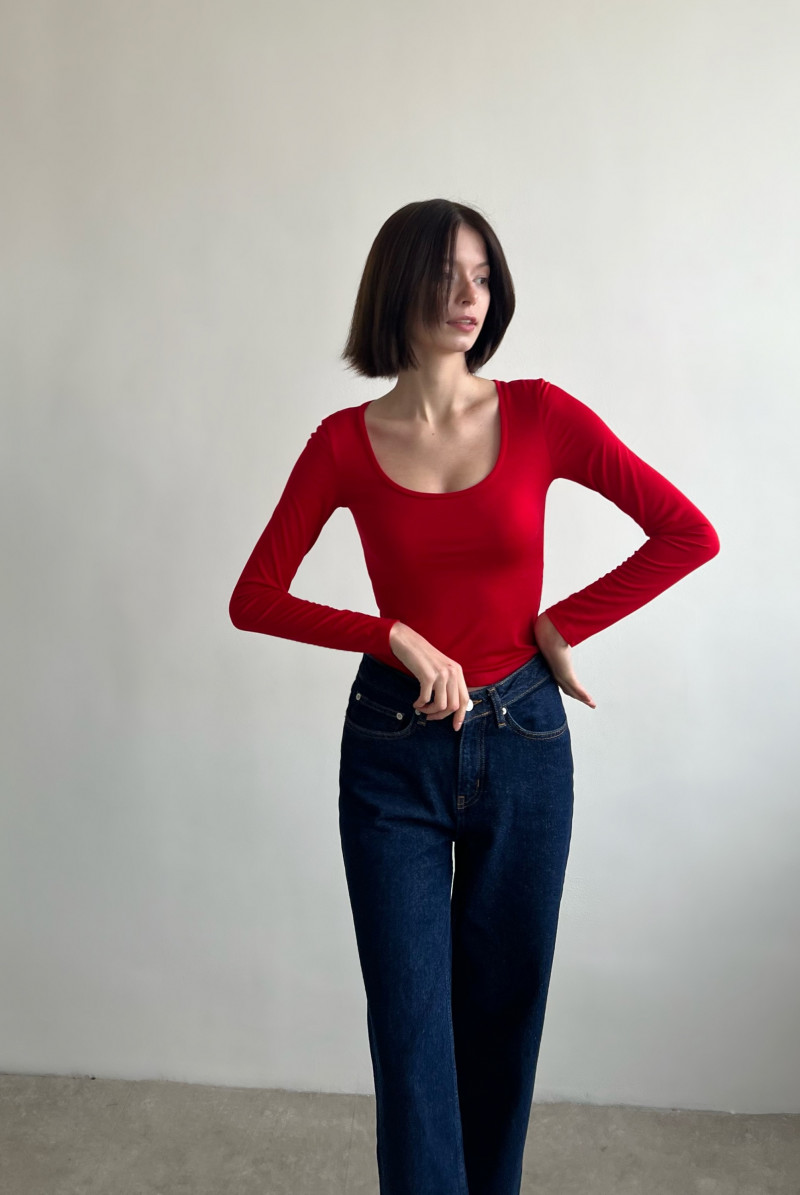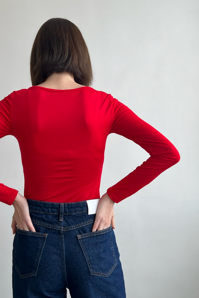 Лонгслив приталенного силуэта с длинным рукавом. Вырез горловины глубокий, круглый.
