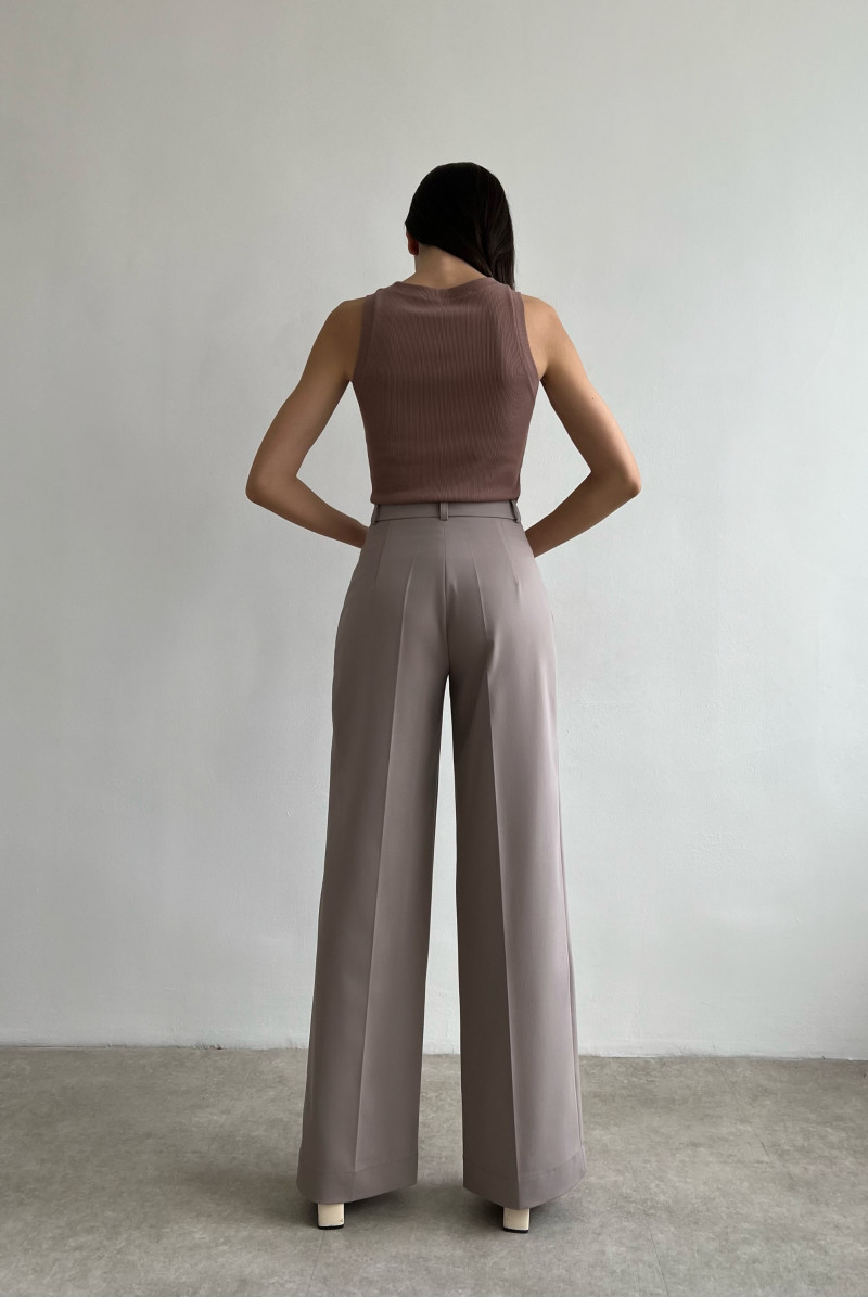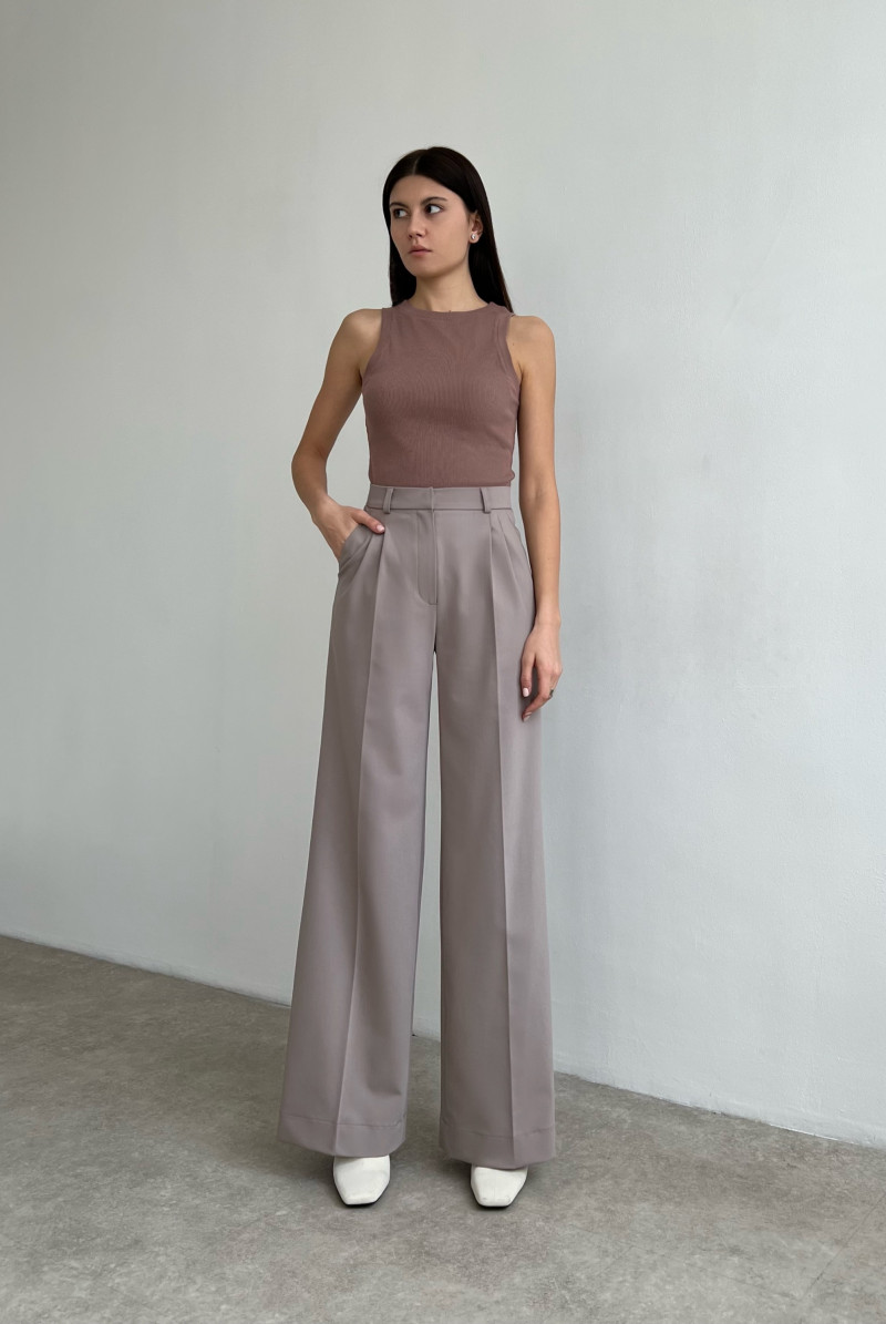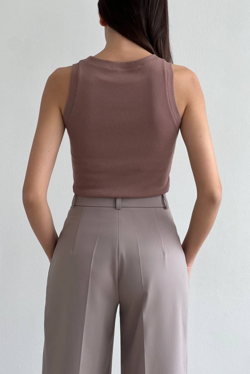 Майка из трикотажа приталенного силуэта, без рукавов. Вырез горловины круглый. Горловина и проймы изделия обработаны бейками из основной ткани с отстрочкой.