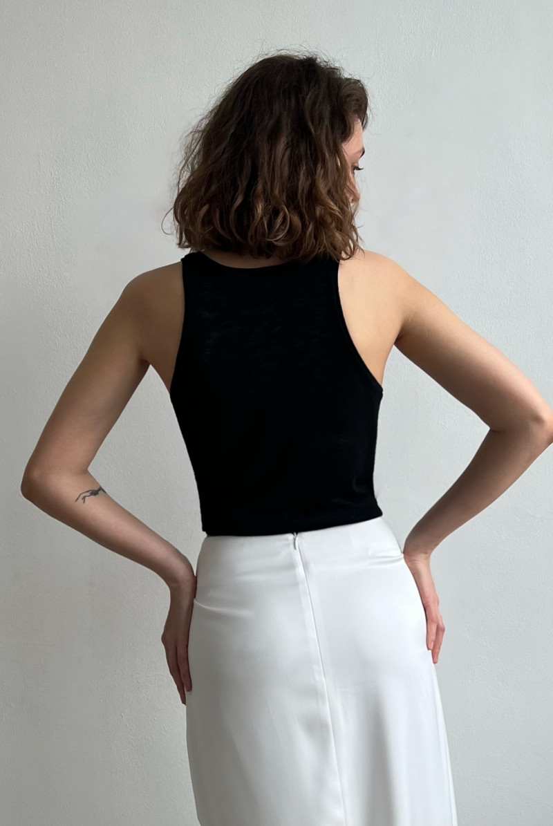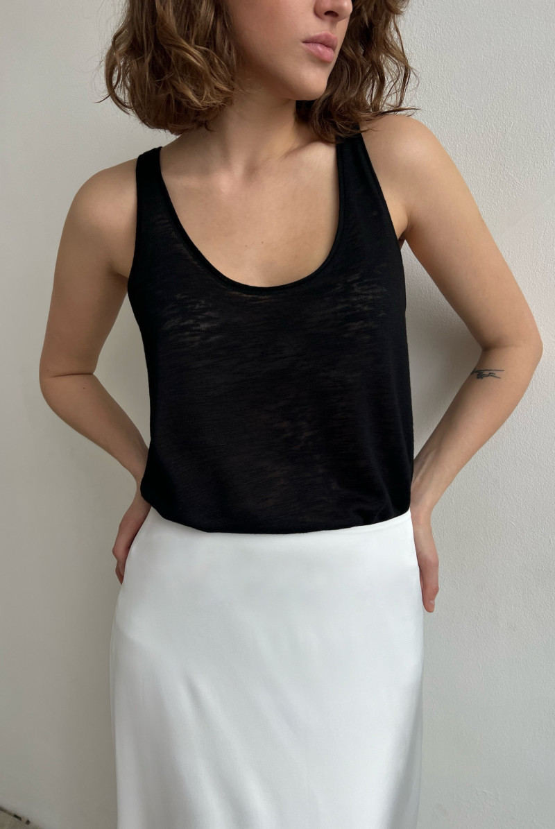 Майка без рукавов, умеренного объема, прямого силуэта. Вырез горловины глубокий, округлой формы.