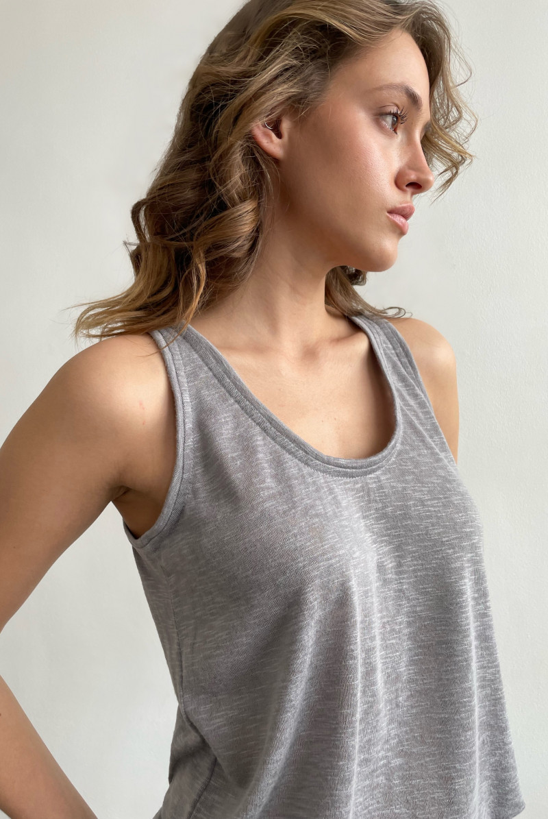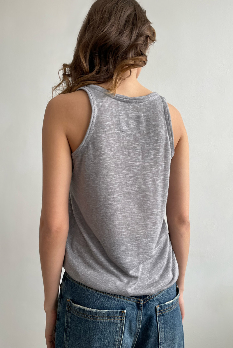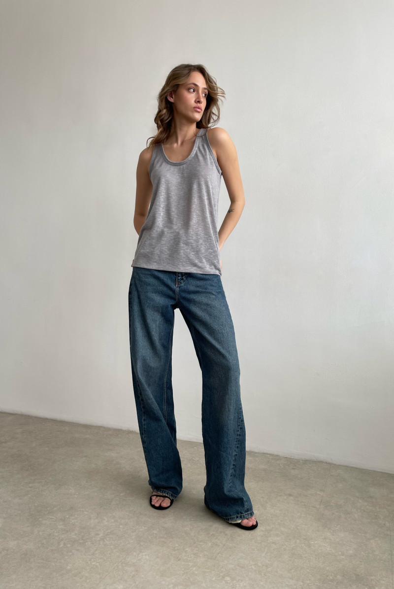 Майка без рукавов, умеренного объема, прямого силуэта. Вырез горловины глубокий, округлой формы.
