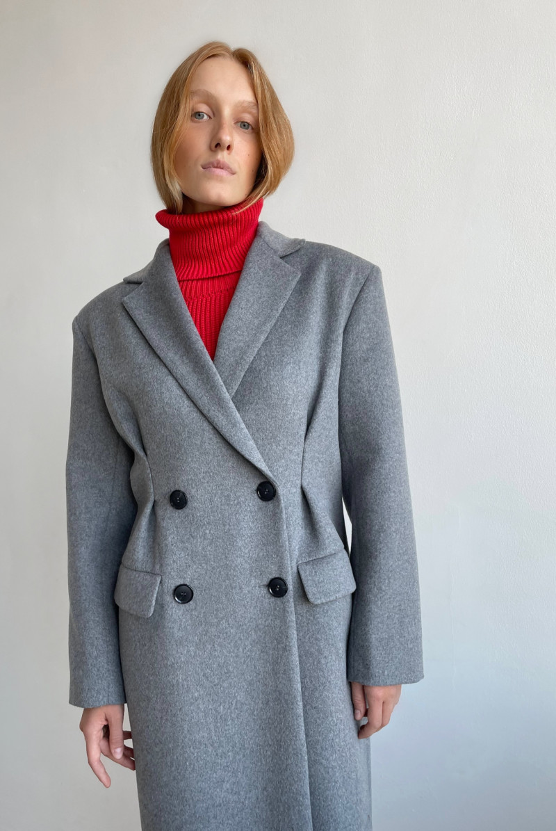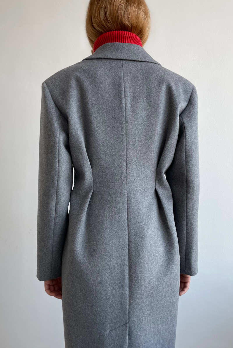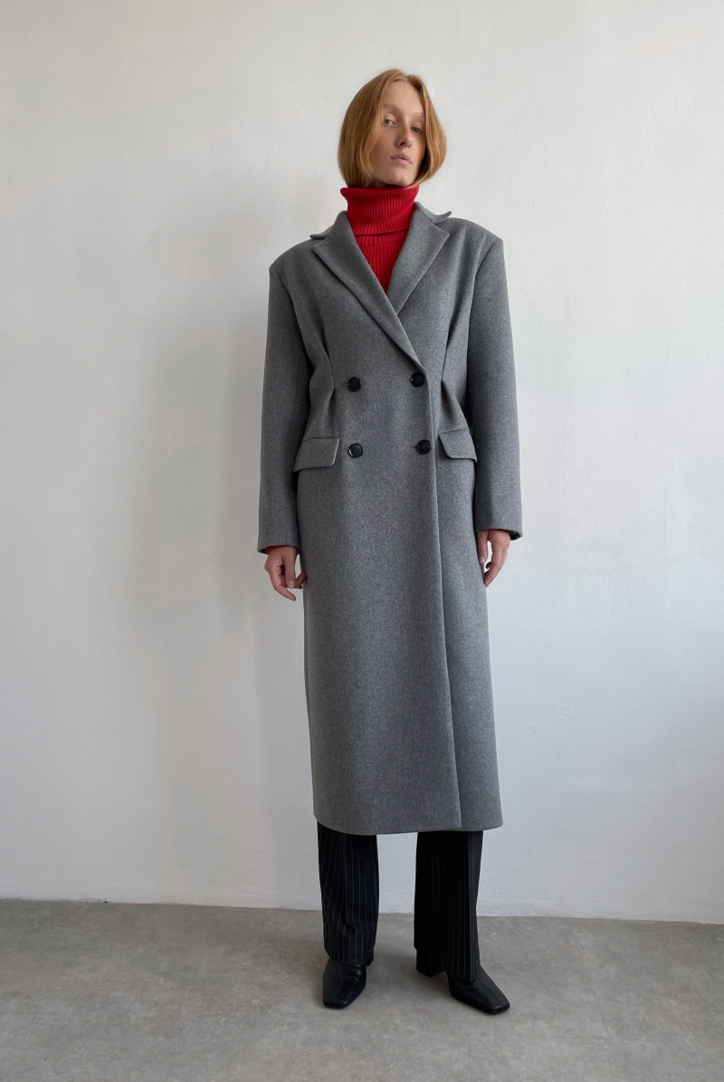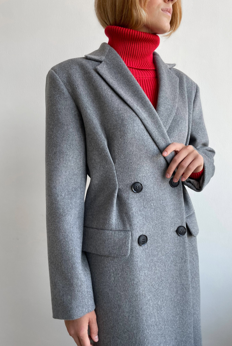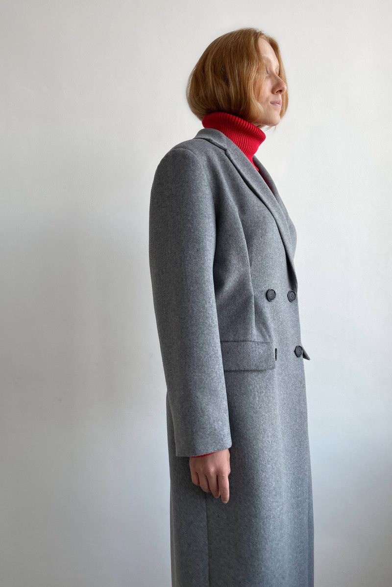 Пальто приталенное двубортное. Воротник костюмный. Мягкие защипы в районе талии. Карманы листочки с клапаном. Спинка со шлицей.