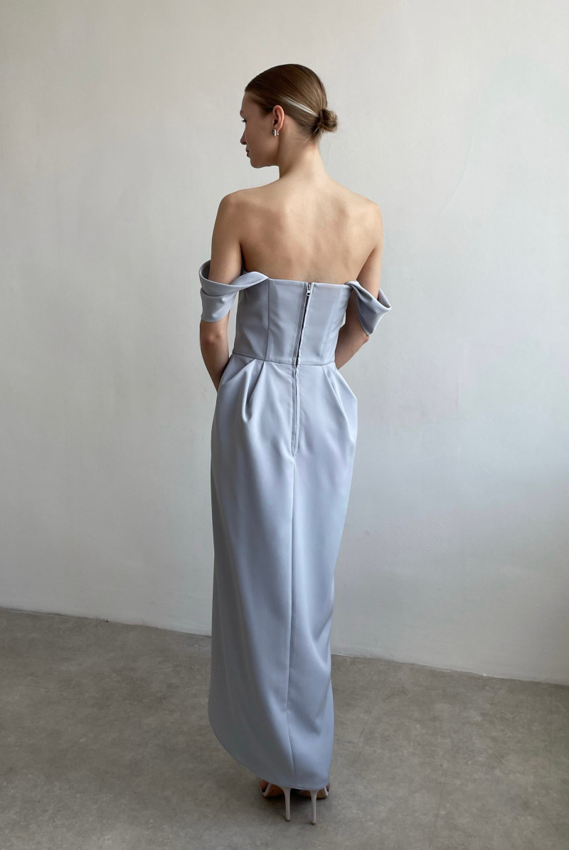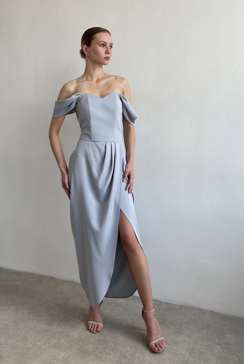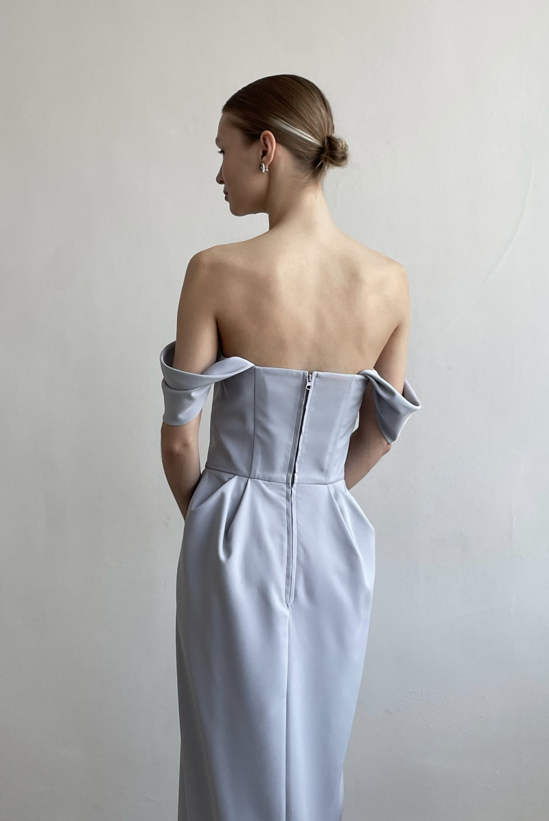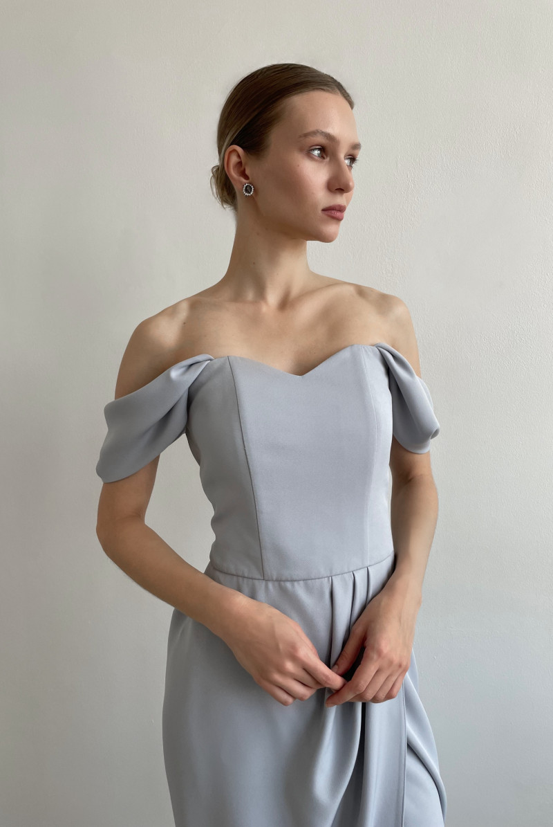 Платье приталенного силуэта на корсете. Юбка "на запах" со складками у талии. Рукава - крылышки со складками. Застежка по середине спинки на молнию с отстрочкой.