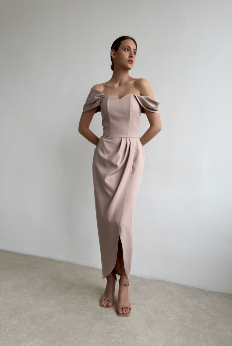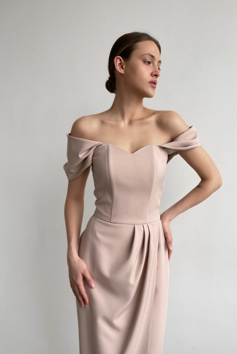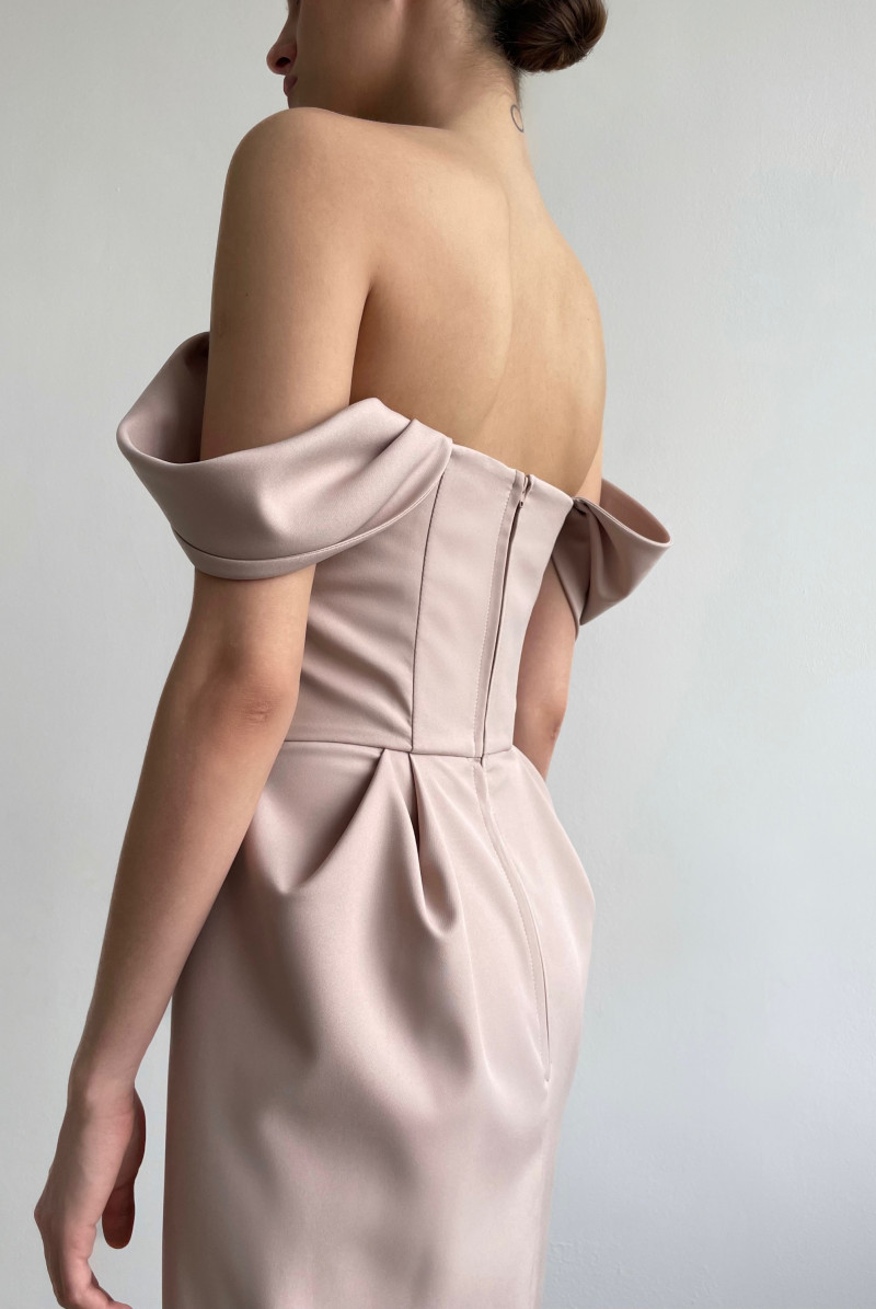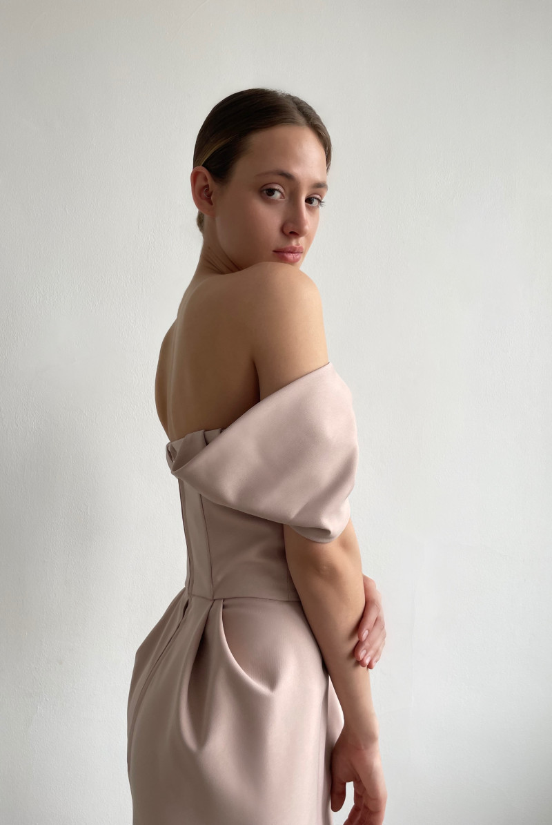 Платье приталенного силуэта на корсете. Юбка "на запах" со складками у талии. Рукава - крылышки со складками. Застежка по середине спинки на молнию с отстрочкой.