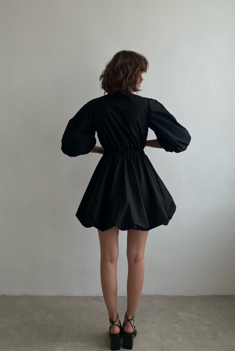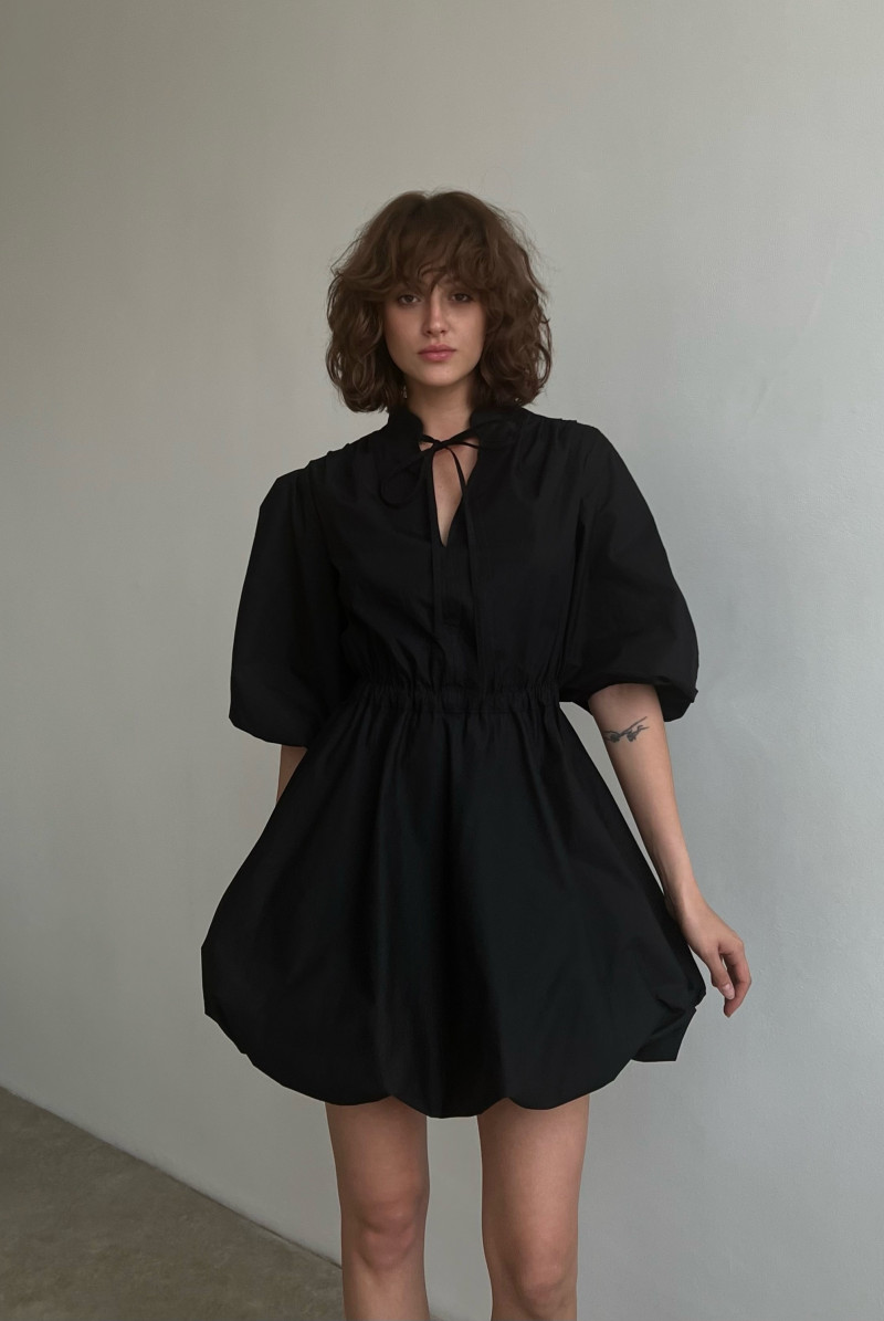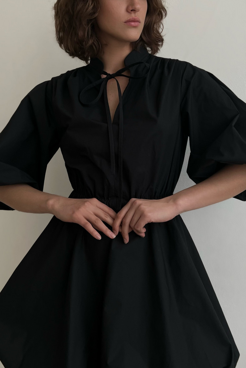 Платье длиной "мини" и юбкой "баллон". По талии - резинка. Рукава объемные, длиной до локтя. По низу рукава - резинка. Горловина оформлена невысоким воротником-стойкой с завязками.