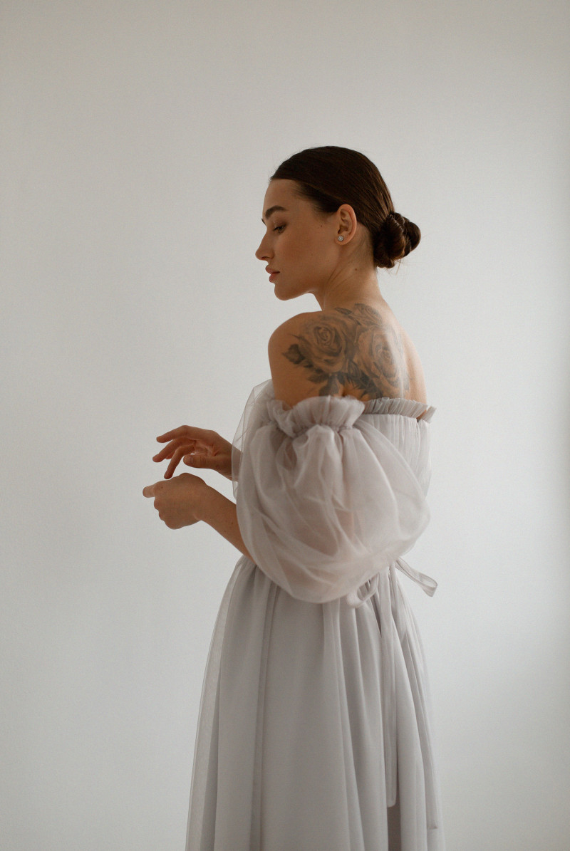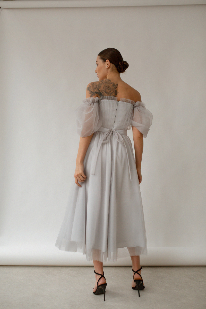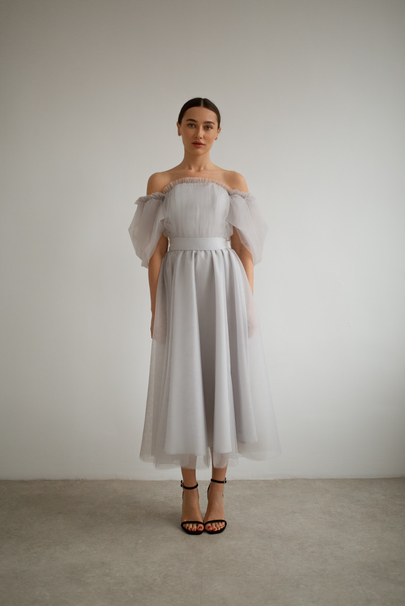 Платье из фатина с корсетным верхом, рукавом "крыло" на резинке, отрезное по линии талии. Юбка на сборке. Застежка по середине спинки на молнию. Пояс съемный.