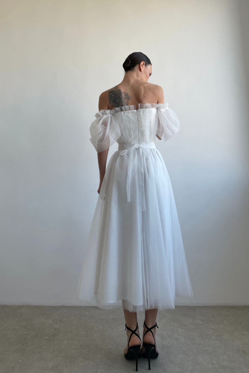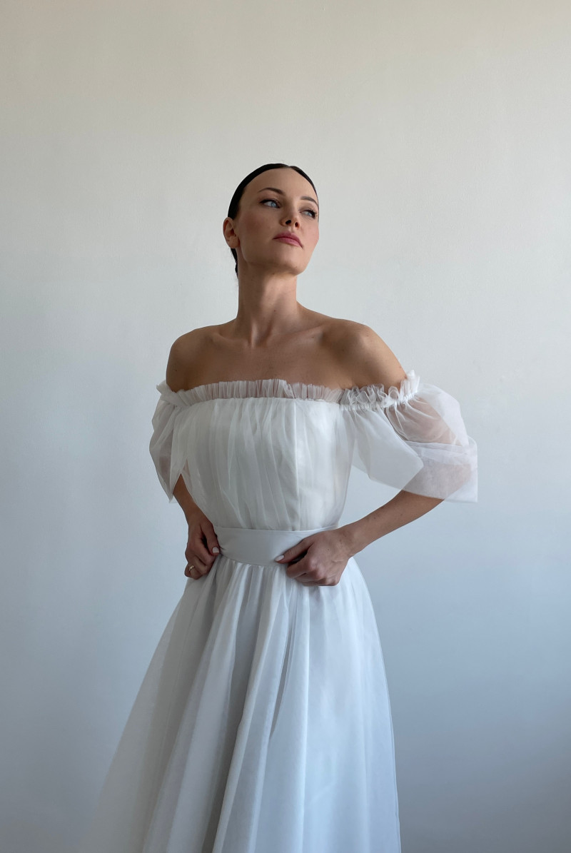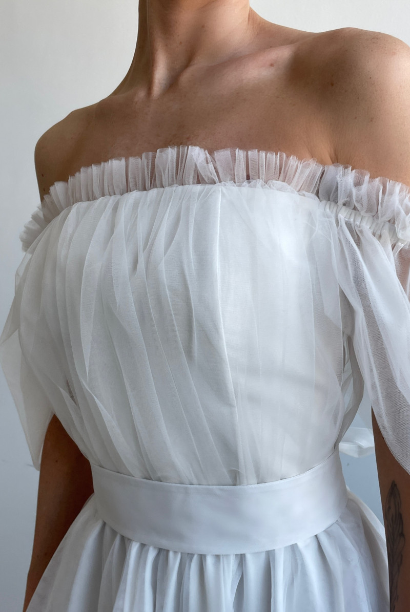 Платье из фатина с корсетным верхом, рукавом "крыло" на резинке, отрезное по линии талии. Юбка на сборке. Застежка по середине спинки на молнию. Пояс съемный.