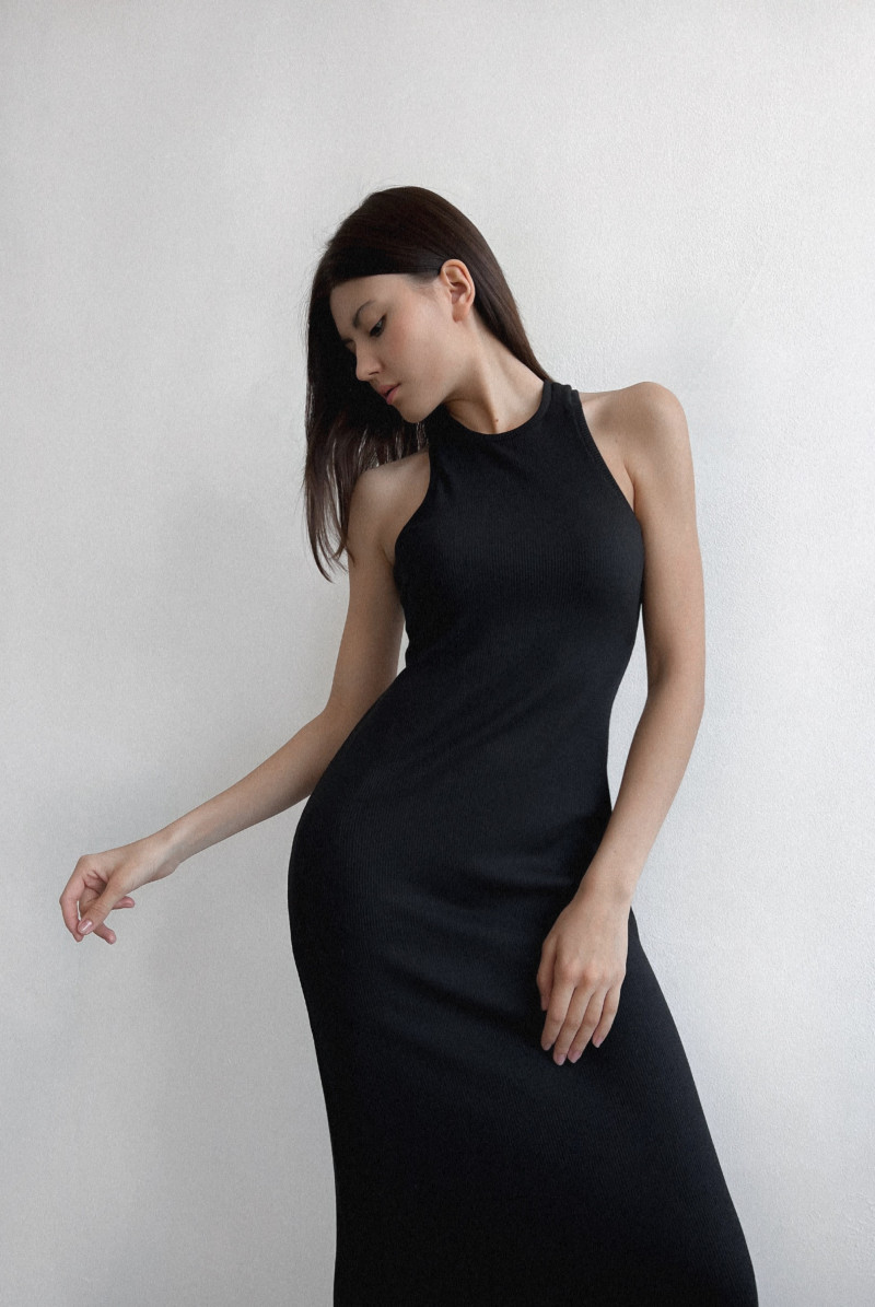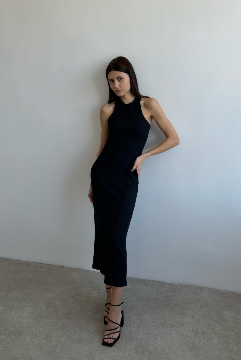 Платье макси, приталенного силуэта из трикотажа, без рукавов. Вырез горловины круглый, обработан бейкой из основной ткани. Вырез пройм по спинке глубокий (фигурный), также обработан бейкой.