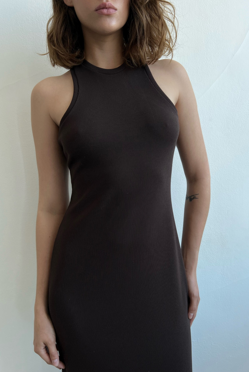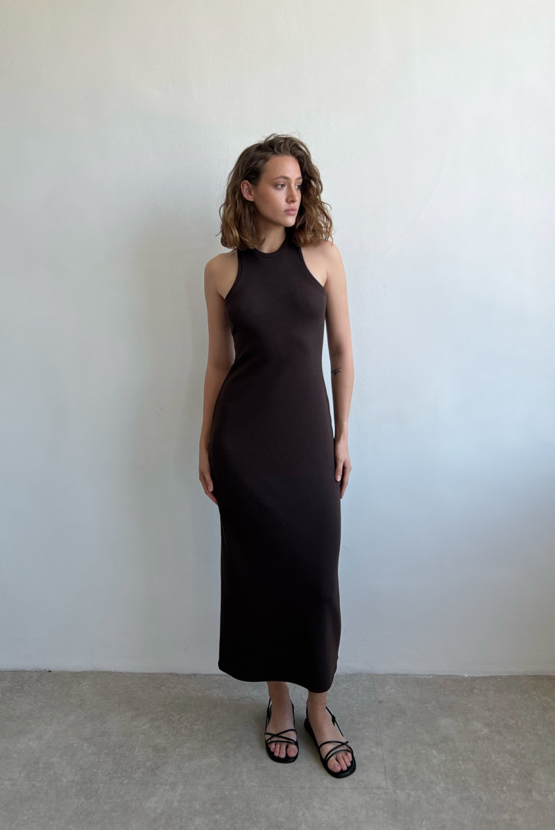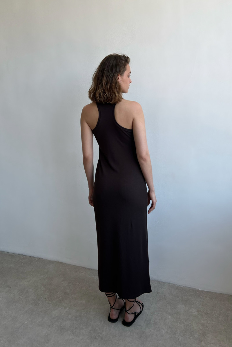 Платье макси, приталенного силуэта из трикотажа, без рукавов. Вырез горловины круглый, обработан бейкой из основной ткани. Вырез пройм по спинке глубокий (фигурный), также обработан бейкой.