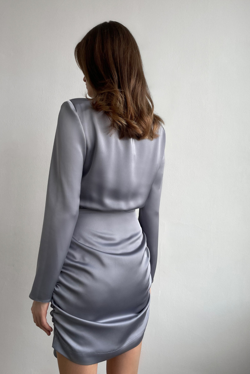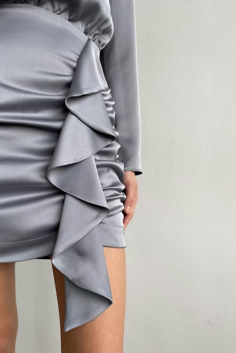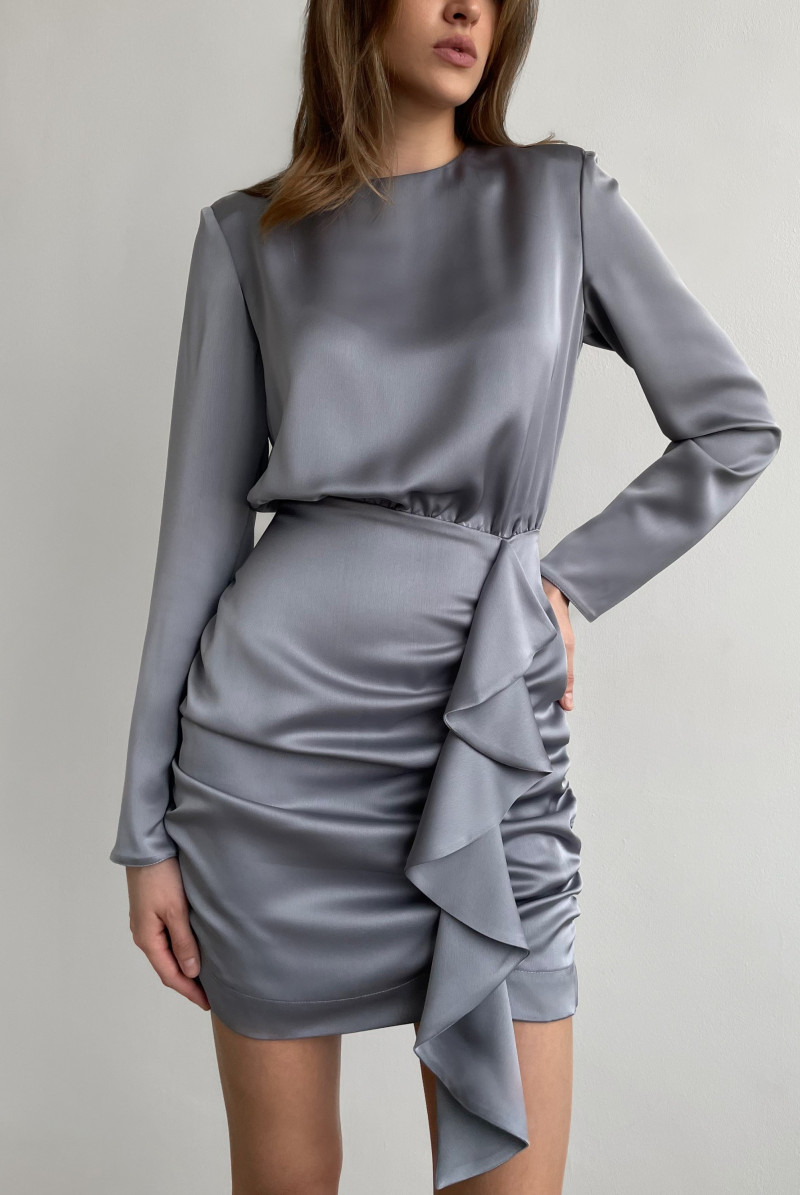 Платье мини приталенного силуэта с драпировкой на талии по переду и спинке. Рукав длинный. Юбка мини с драпировкой по боковым швам и декоративным воланом спереди. Застежка на потайную молнию в левом боковом шве.