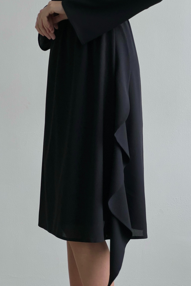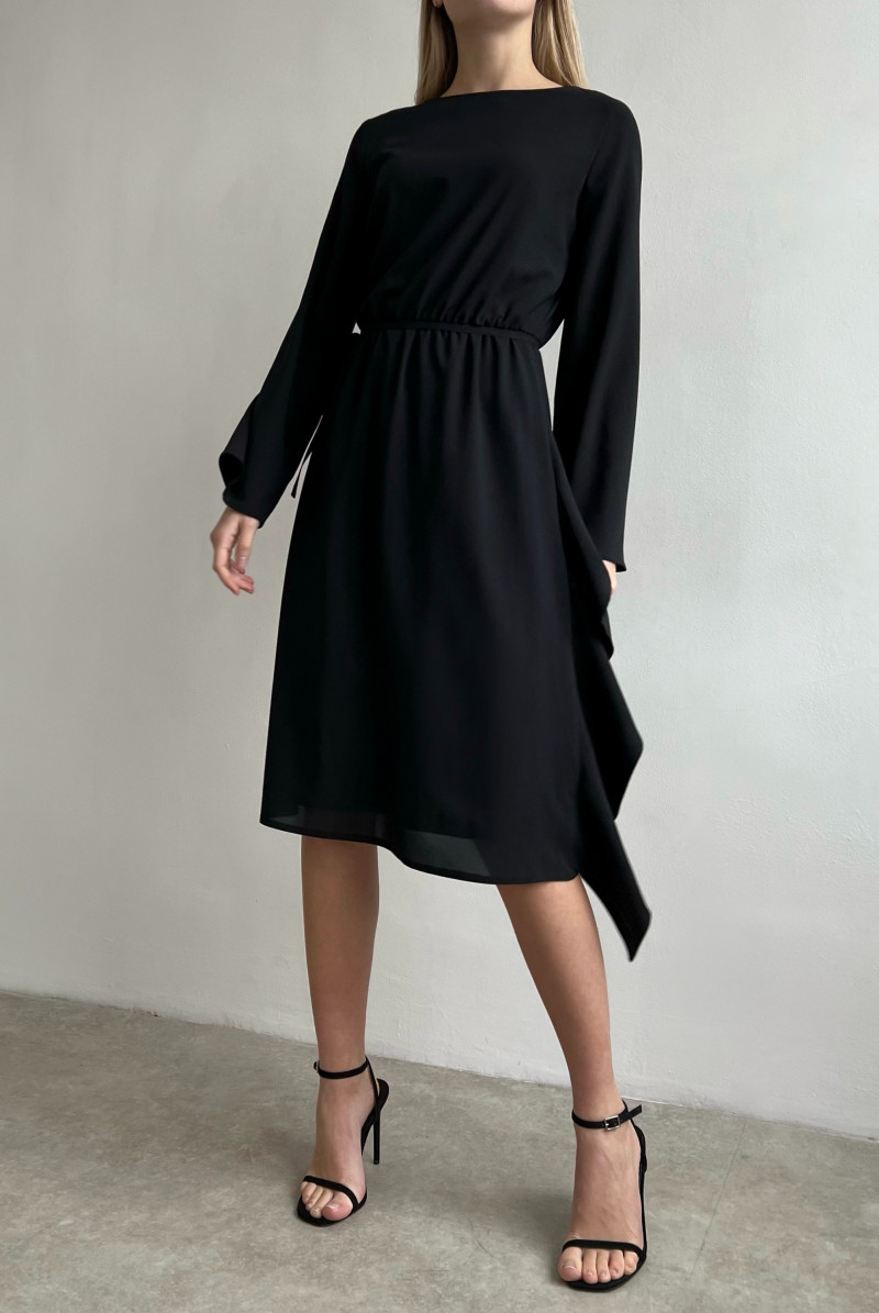 Платье отрезное по талии с длинным рукавом. Юбка слегка расклешенная, в левом боковом шве вшит декоративный волан. На талии - резинка.