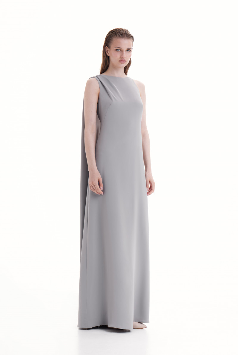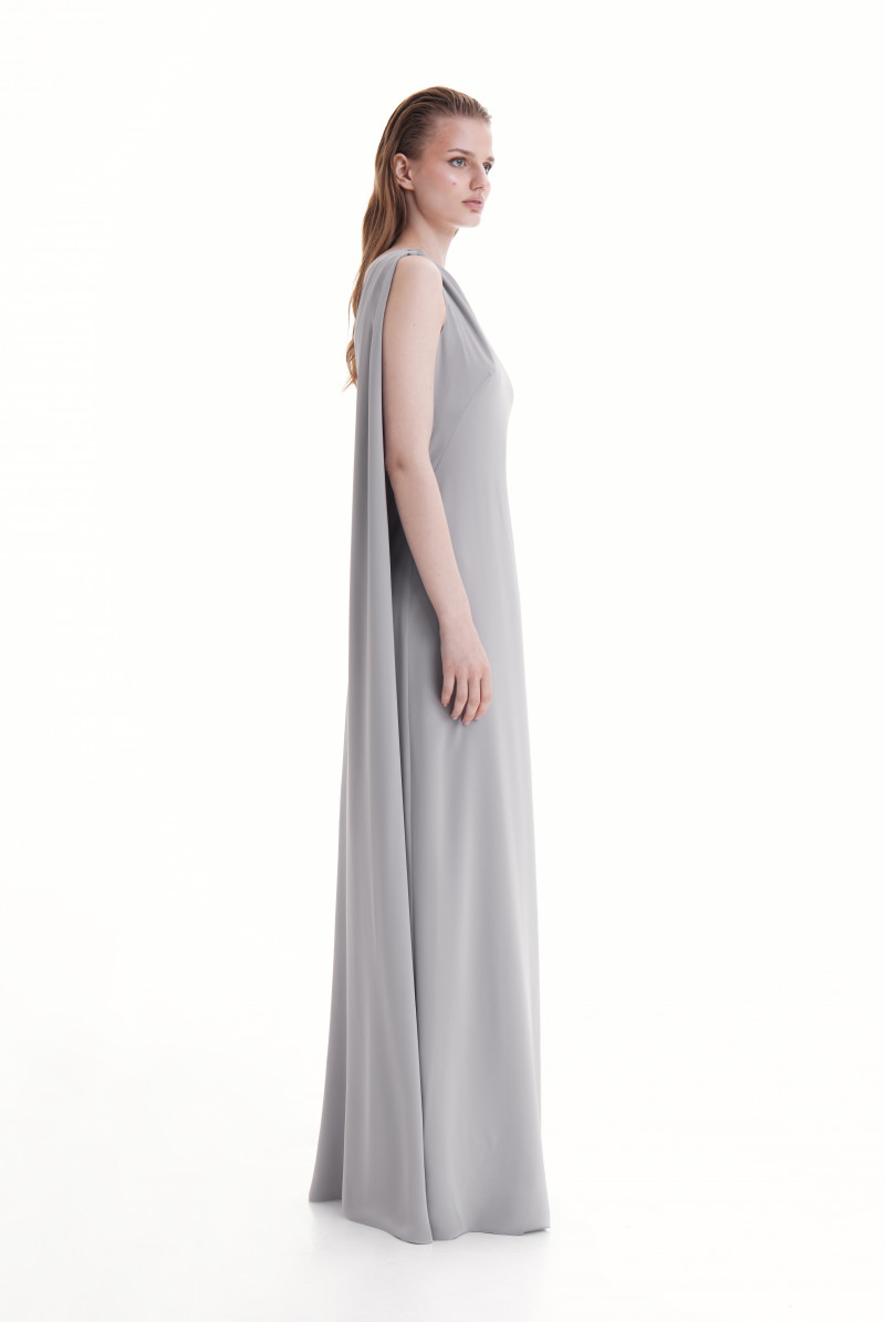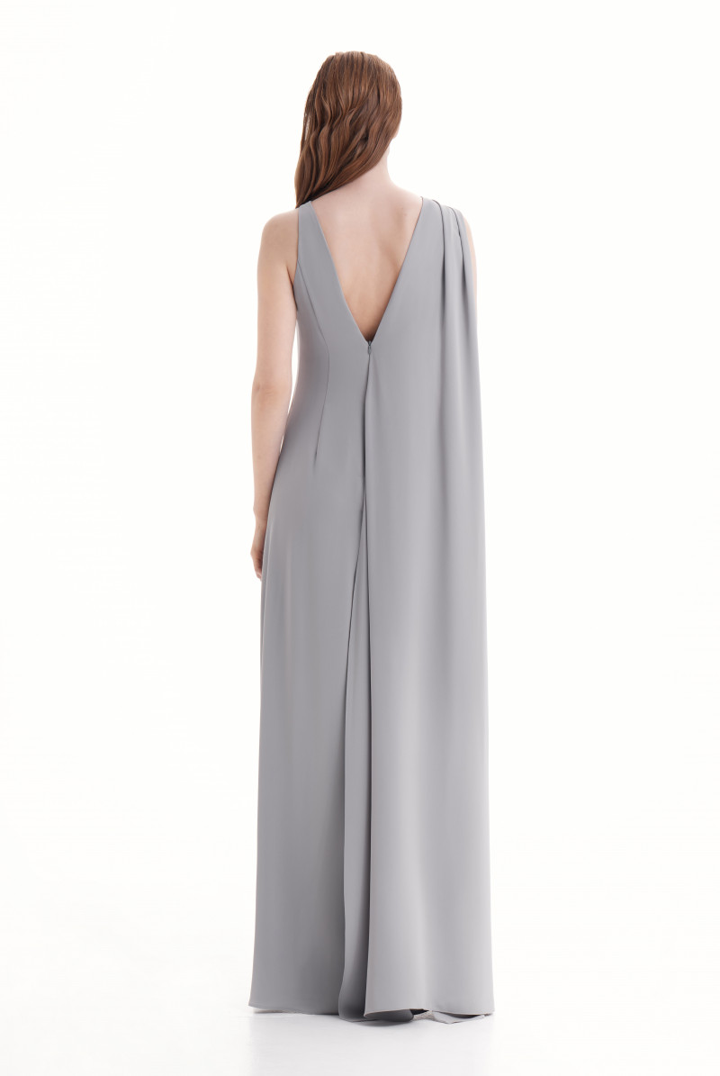 Платье прилегающее до бедер и расширяющееся к низу. Верх оформлен фигурными вытачками и драпировкой из правого плеча. Сзади глубокий V-образный вырез. От правого плеча идет шлейф, который закреплён в декольте и центральном шве вместе с молнией. Платье на подкладке длиной в пол.