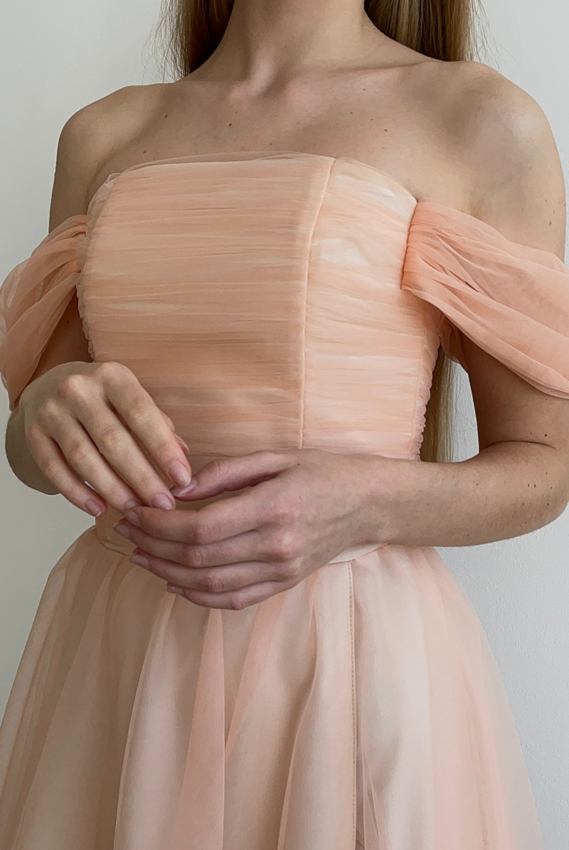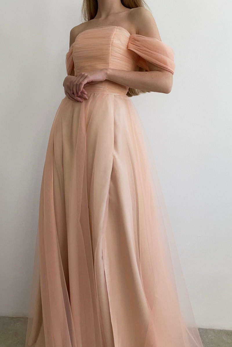 Вечернее платье в пол из фатина. Корсет с драппировкой, рукава-крылышки драппированые, юбка с разрезом спереди. Застежка по середине спинки на потайную молнию.