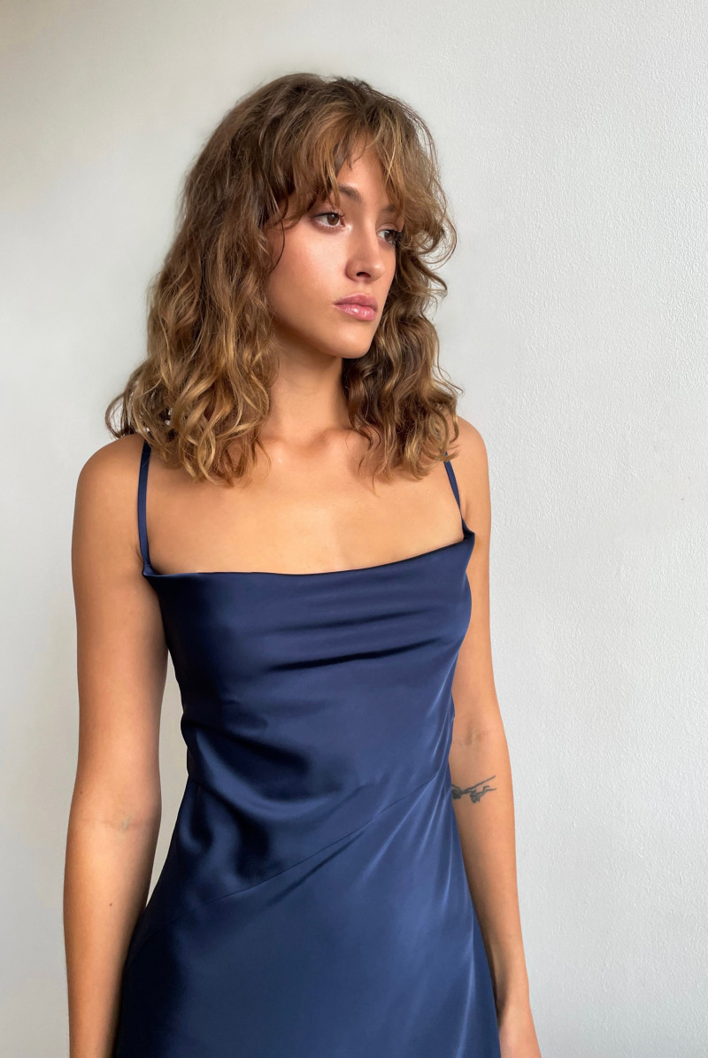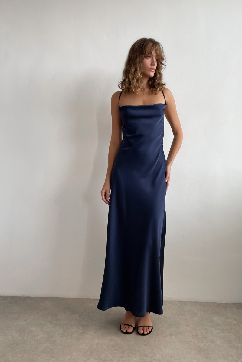 Платье прилегающего силуэта, кроя "по косой". На детали переда расположен наклонный подрез чуть ниже левой груди к правому боковому шву. Декольте в форме "качели". На спинке глубокое V-образное декольте. Платье держится на тонких бретелях-завязках, которые продеваются в петли выреза спинки и завязываются на бант. Платье длиной миди.