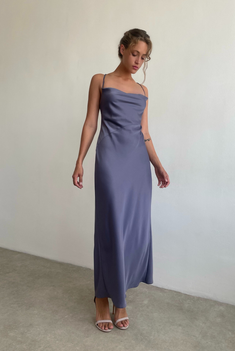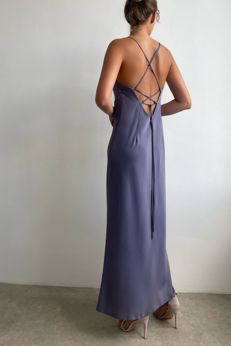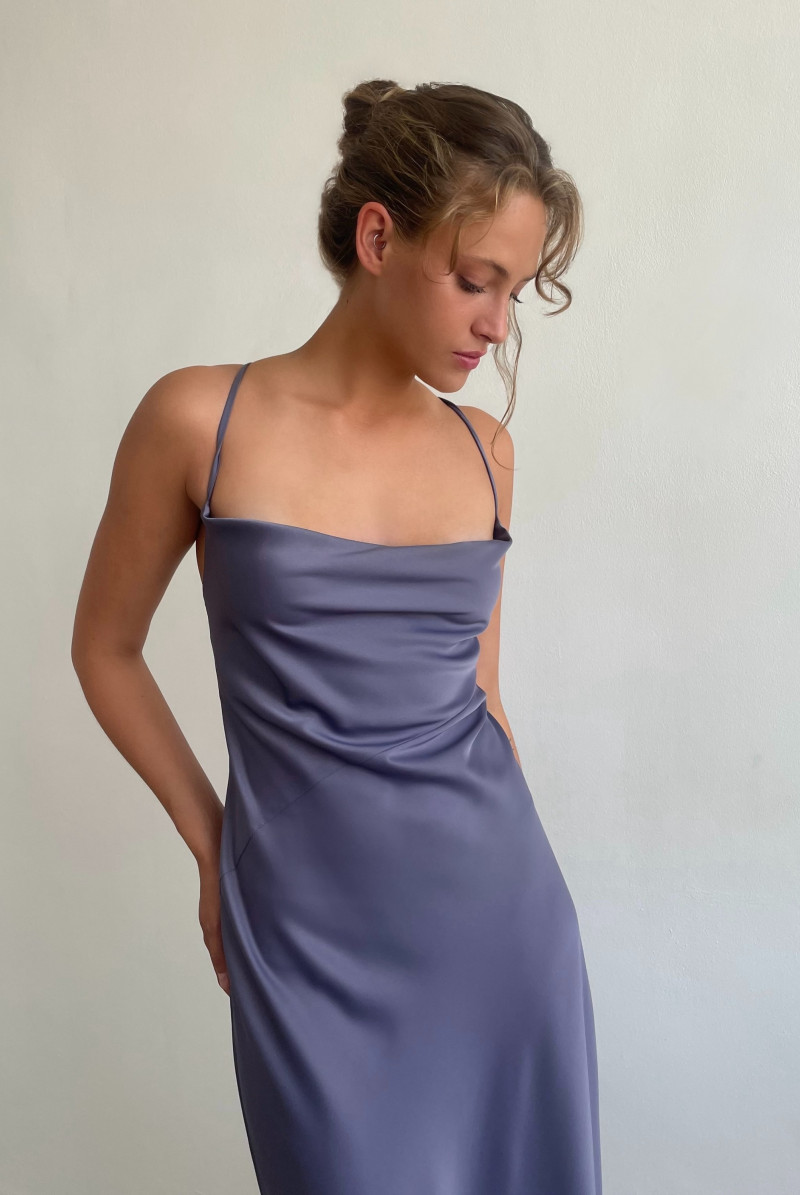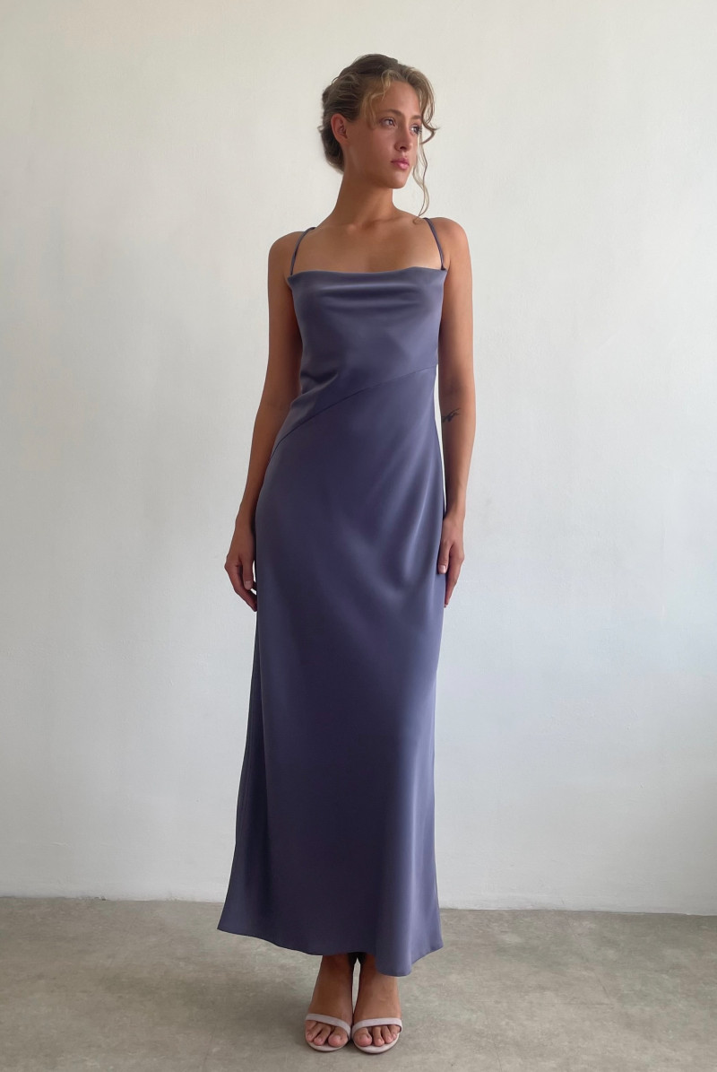 Платье прилегающего силуэта, кроя "по косой". На детали переда расположен наклонный подрез чуть ниже левой груди к правому боковому шву. Декольте в форме "качели". На спинке глубокое V-образное декольте. Платье держится на тонких бретелях-завязках, которые продеваются в петли выреза спинки и завязываются на бант. Платье длиной миди.