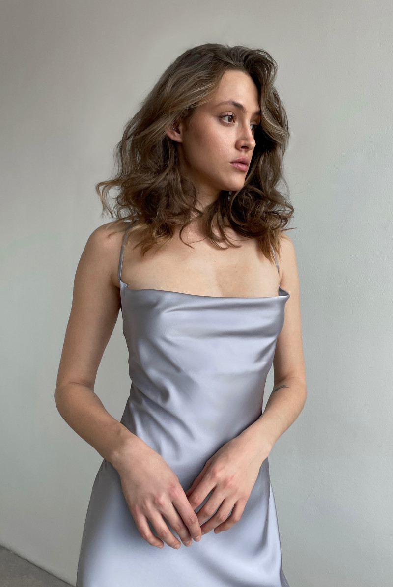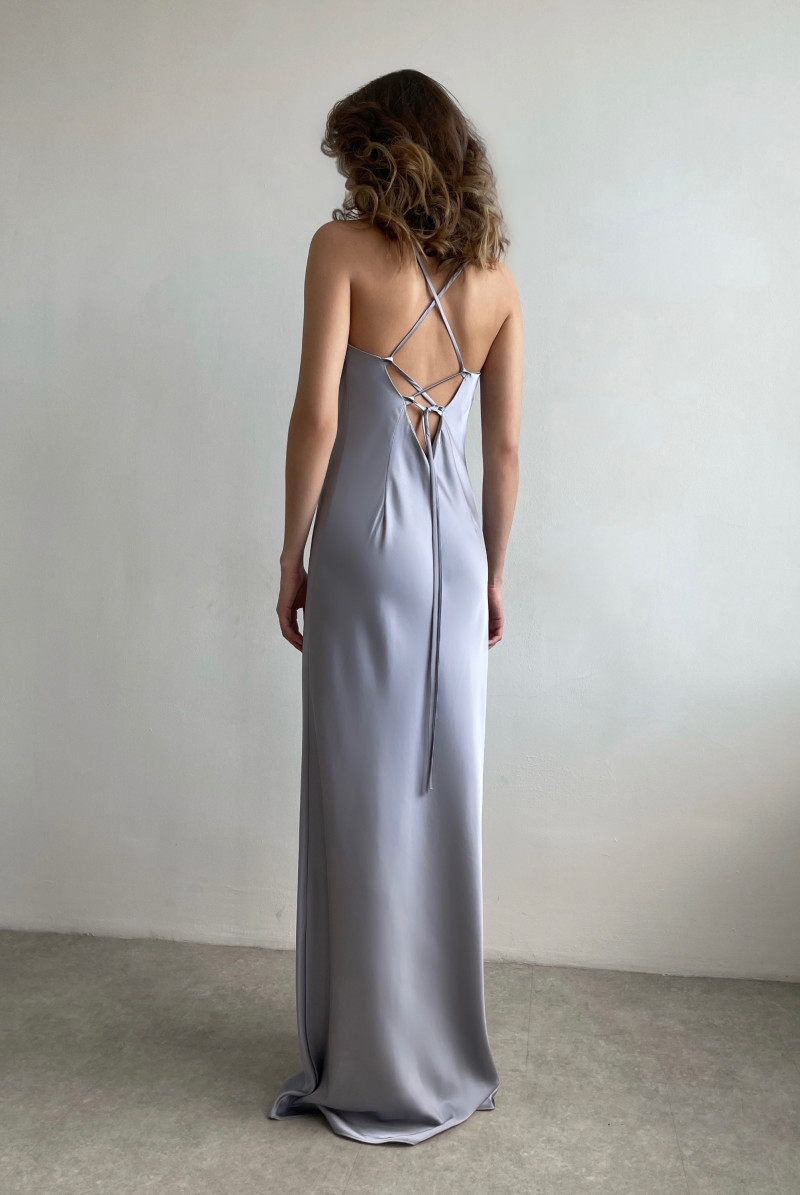 Платье длиной в пол прилегающего силуэта кроя "по косой". На детали переда расположены наклонный подрез чуть ниже левой груди к правому боковому шву. Декольте в форме "качели". На спинке глубокое V-образное декольте. Платье держится на тонких бретелях-завязках, которые продеваются в петли выреза спинки и завязываются на бант.